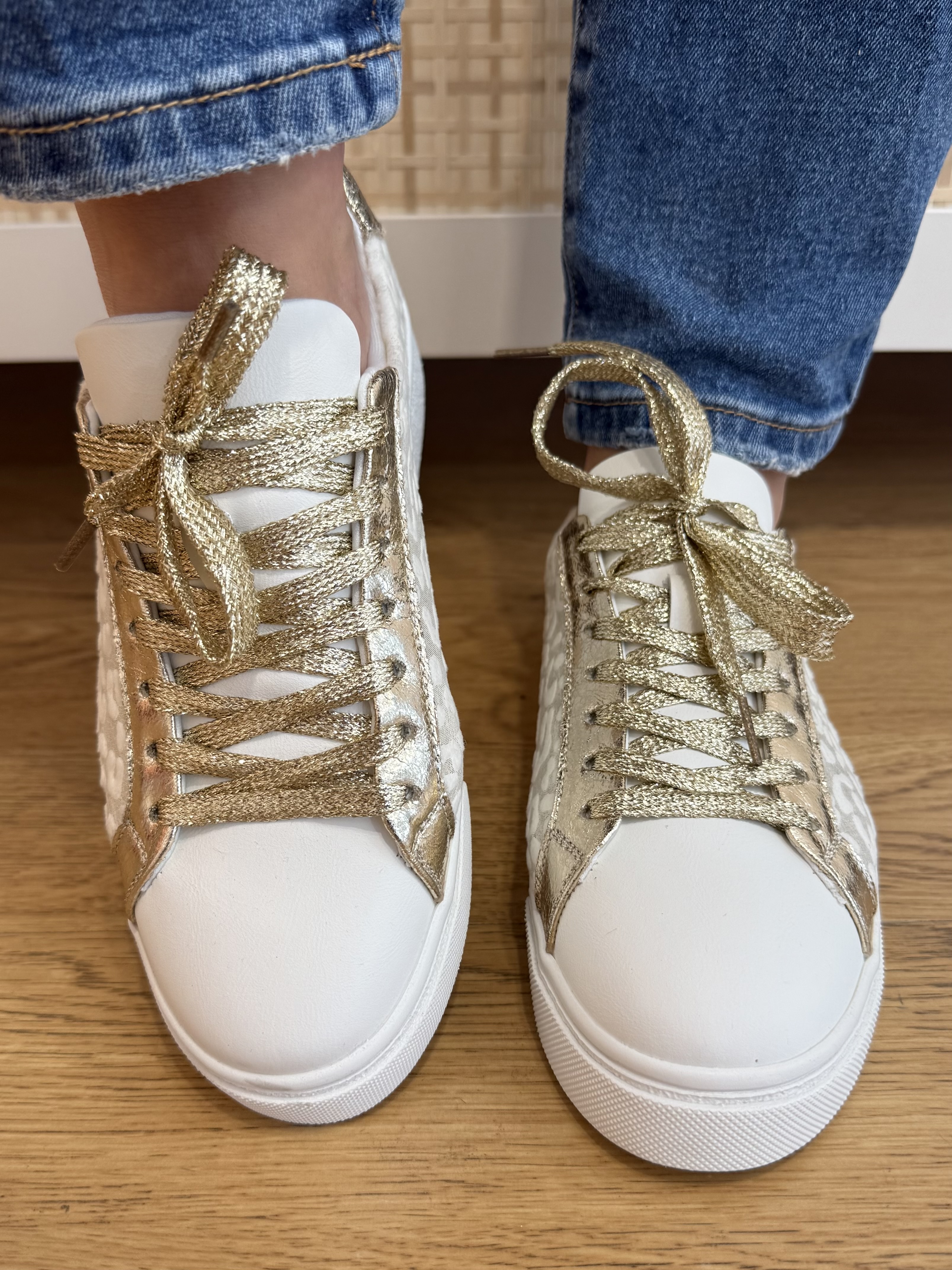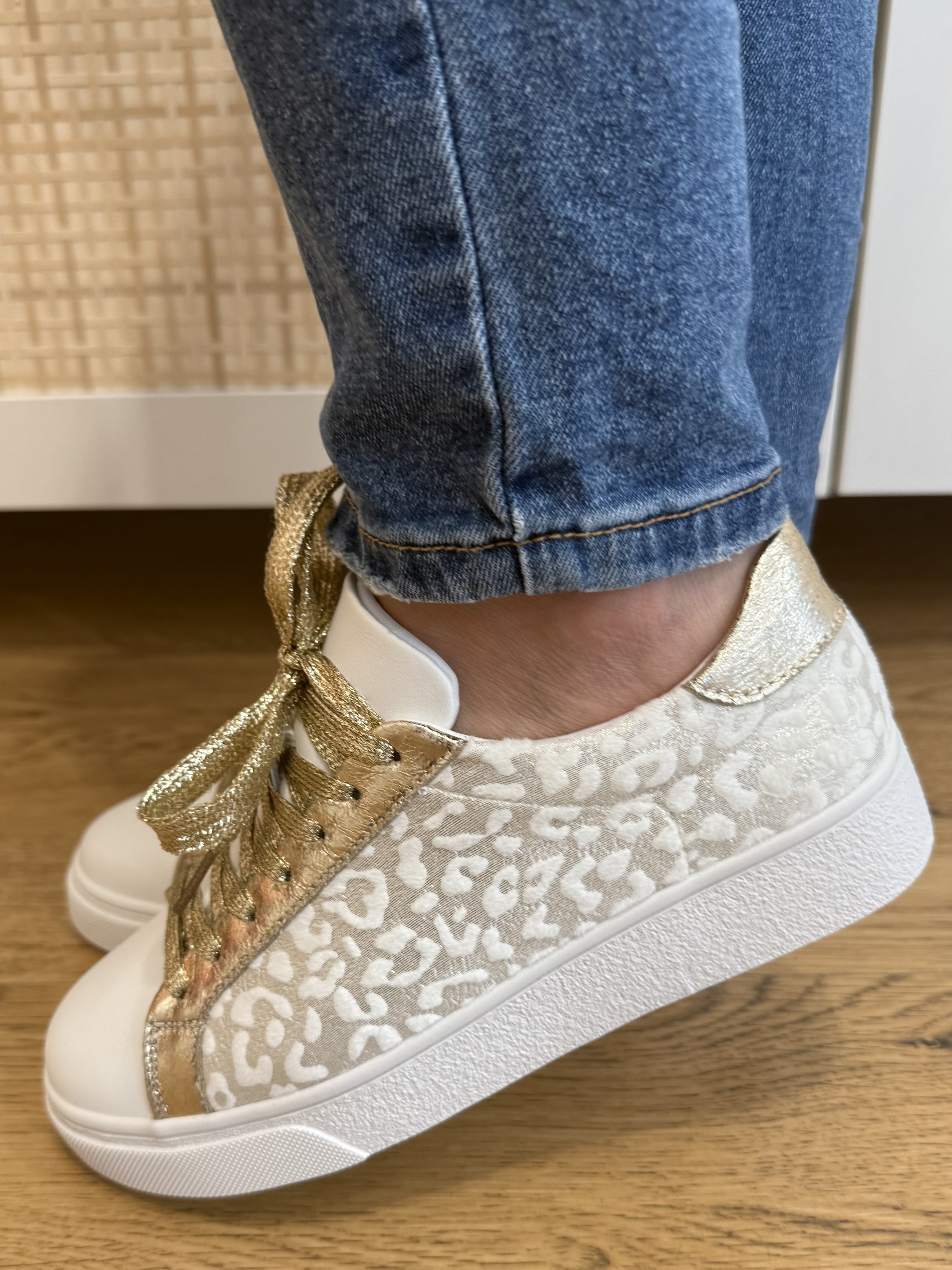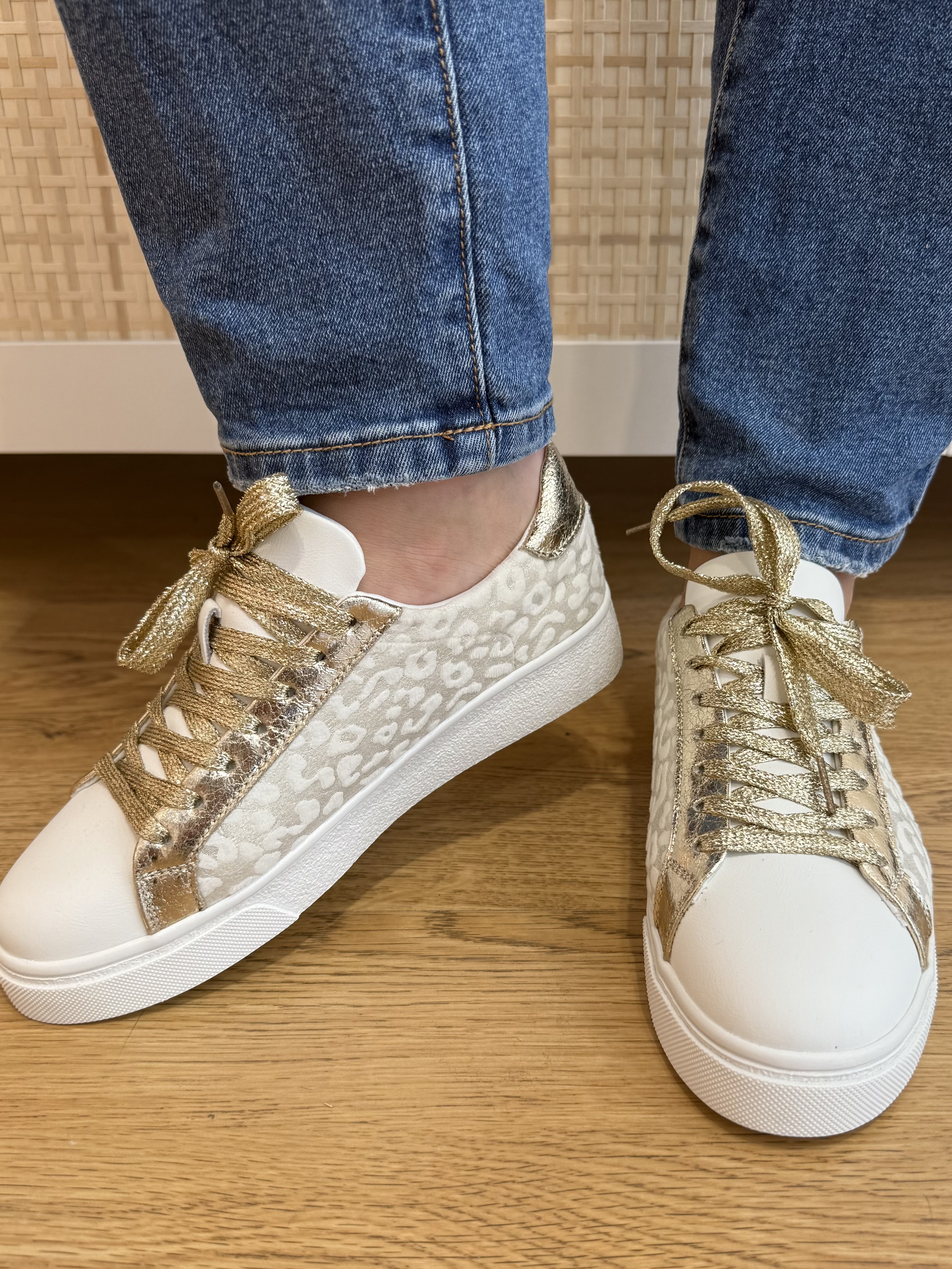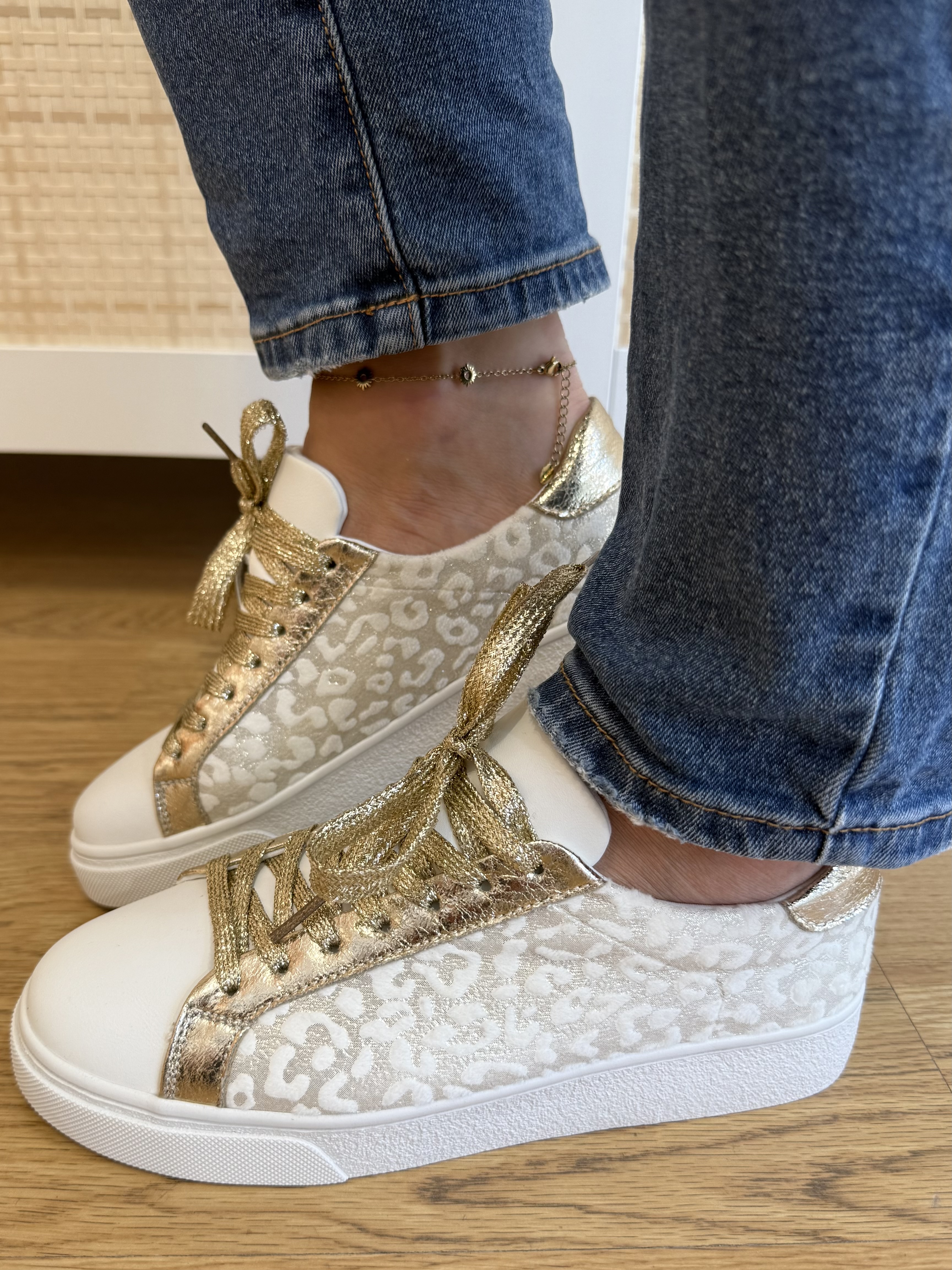 Osez la brillance avec les baskets Sofia, un modèle chic et audacieux qui twiste le look classique avec une touche de glamour. Leur motif léopard en relief blanc apporte de la texture, subtilement rehaussé par des empiècements dorés et des lacets assortis ultra brillants. Un combo parfait entre tendance et confort.