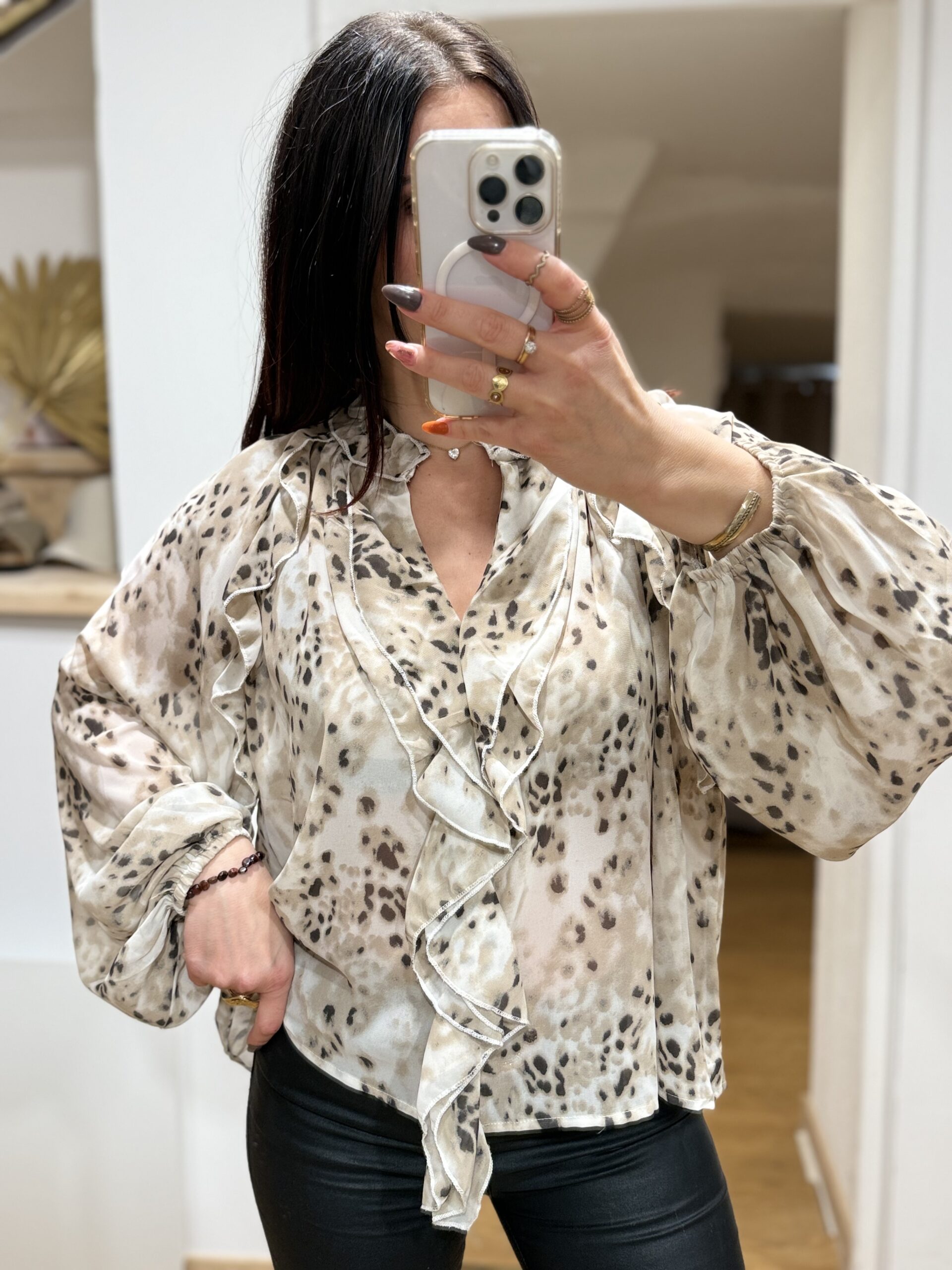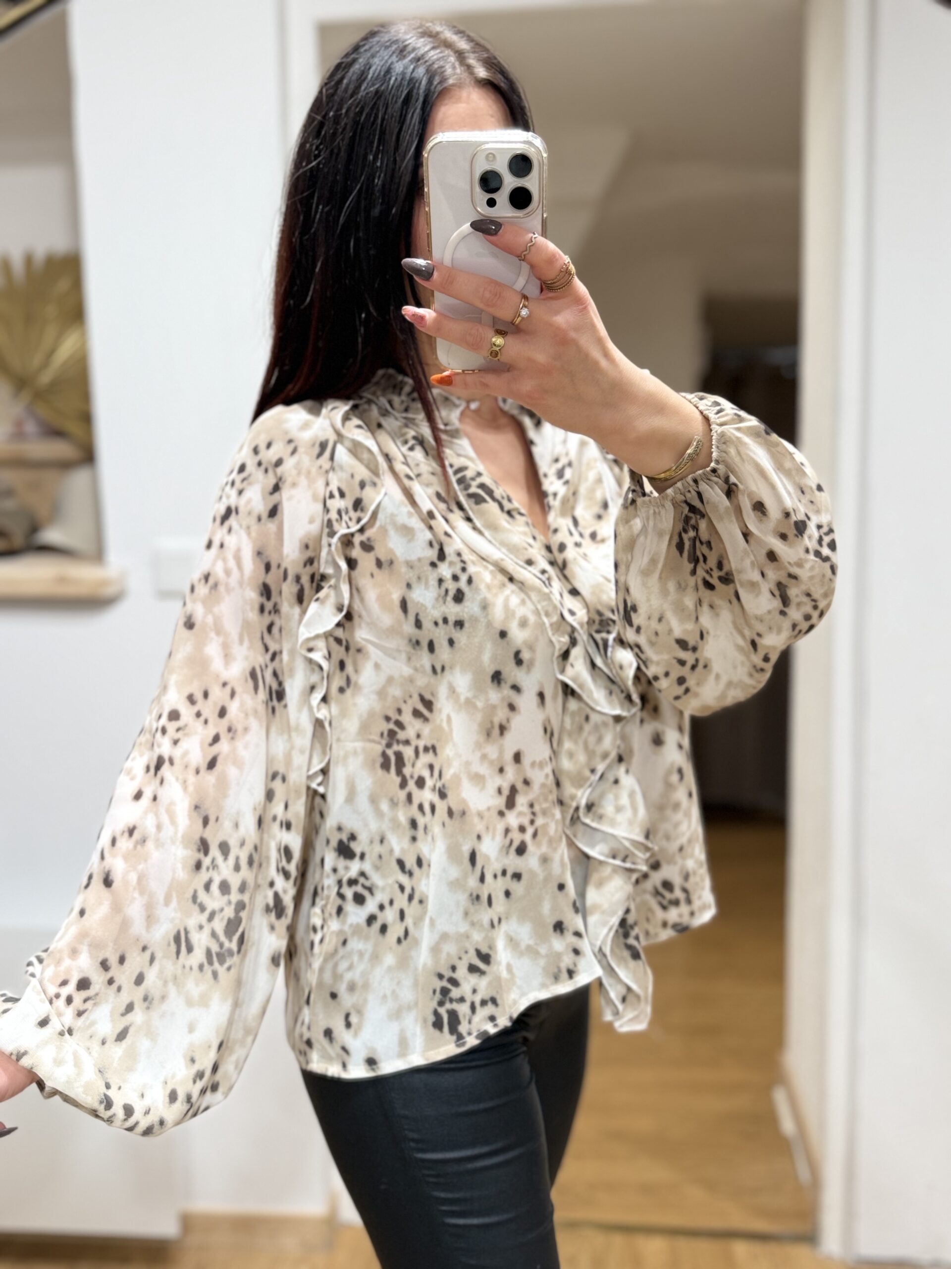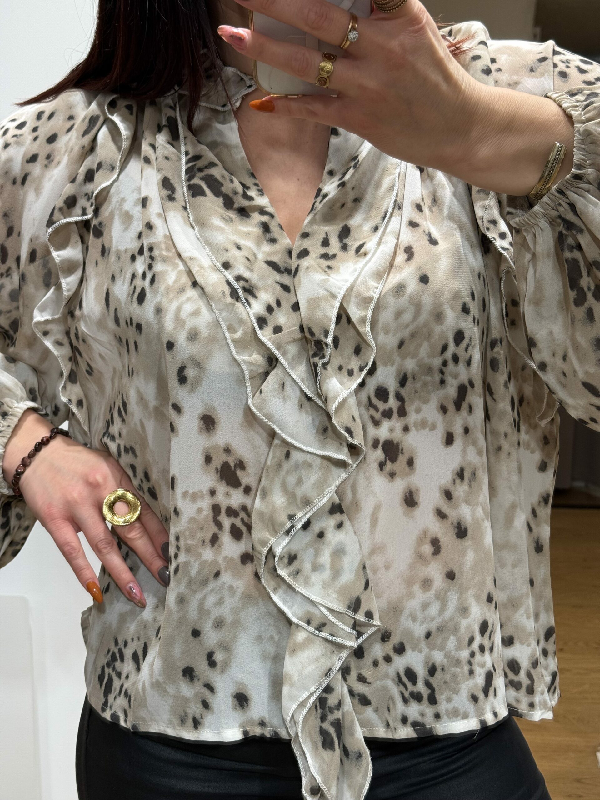 Confectionnée dans un tissu aérien au motif léopard revisité dans des tons naturels, elle se distingue par ses volants délicats qui soulignent l’encolure et descendent le long du buste.