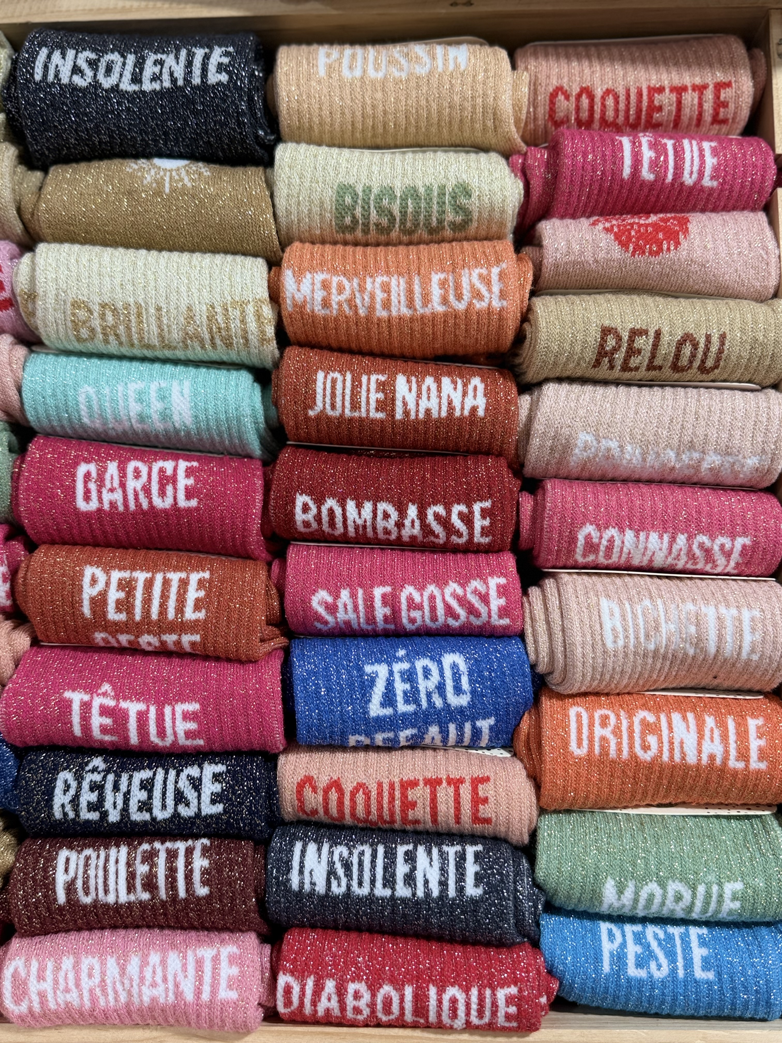 Ajoutez une touche de peps à votre look avec nos chaussettes à paillettes ! Confortables, originales et résolument pétillantes, elles affichent des messages pleins de caractère comme “Princesse”, “Diabolique”, “Rebelle” ou encore “Petite Peste”. Un accessoire qui fait toute la différence, que ce soit pour offrir ou se faire plaisir !