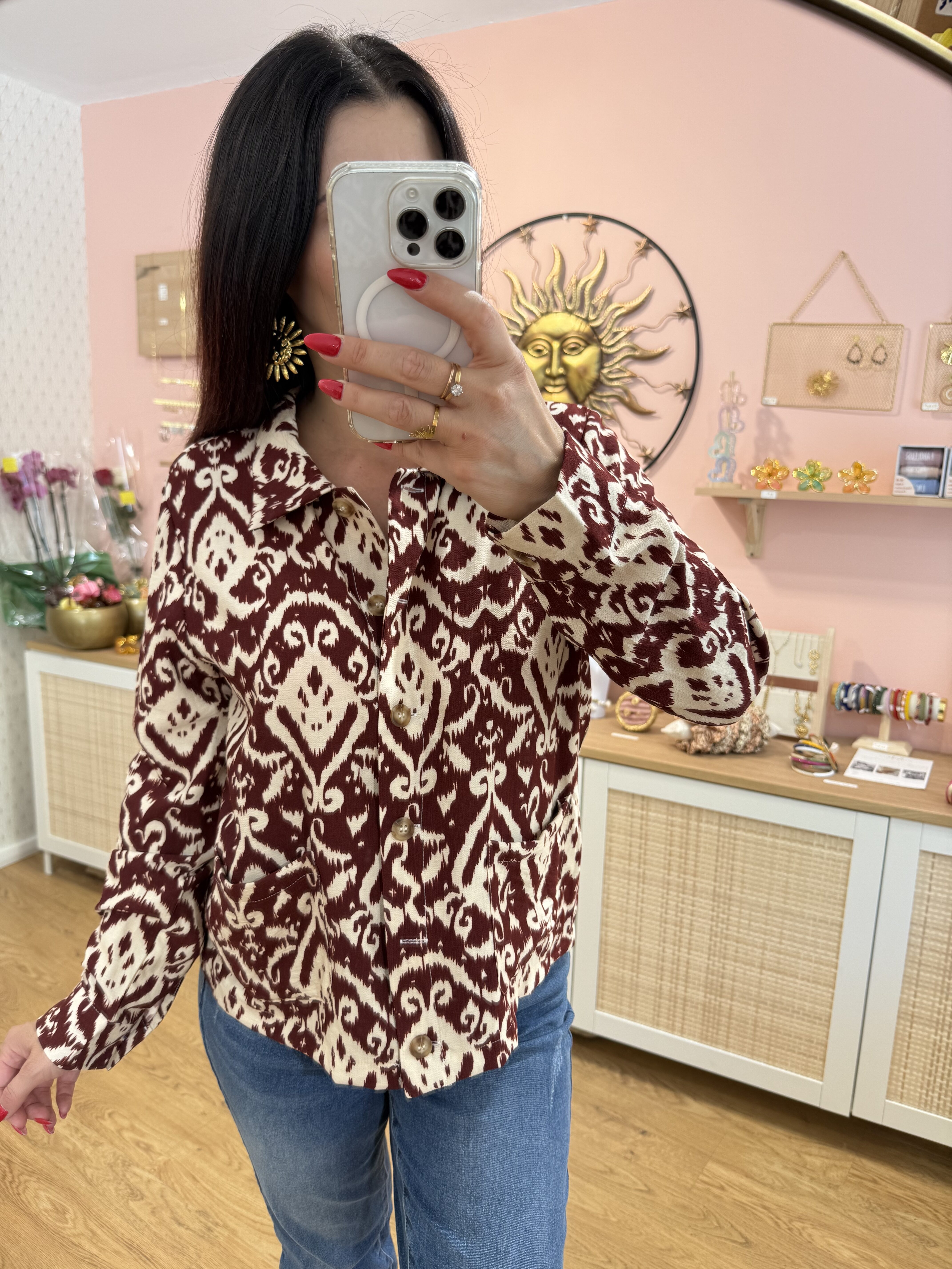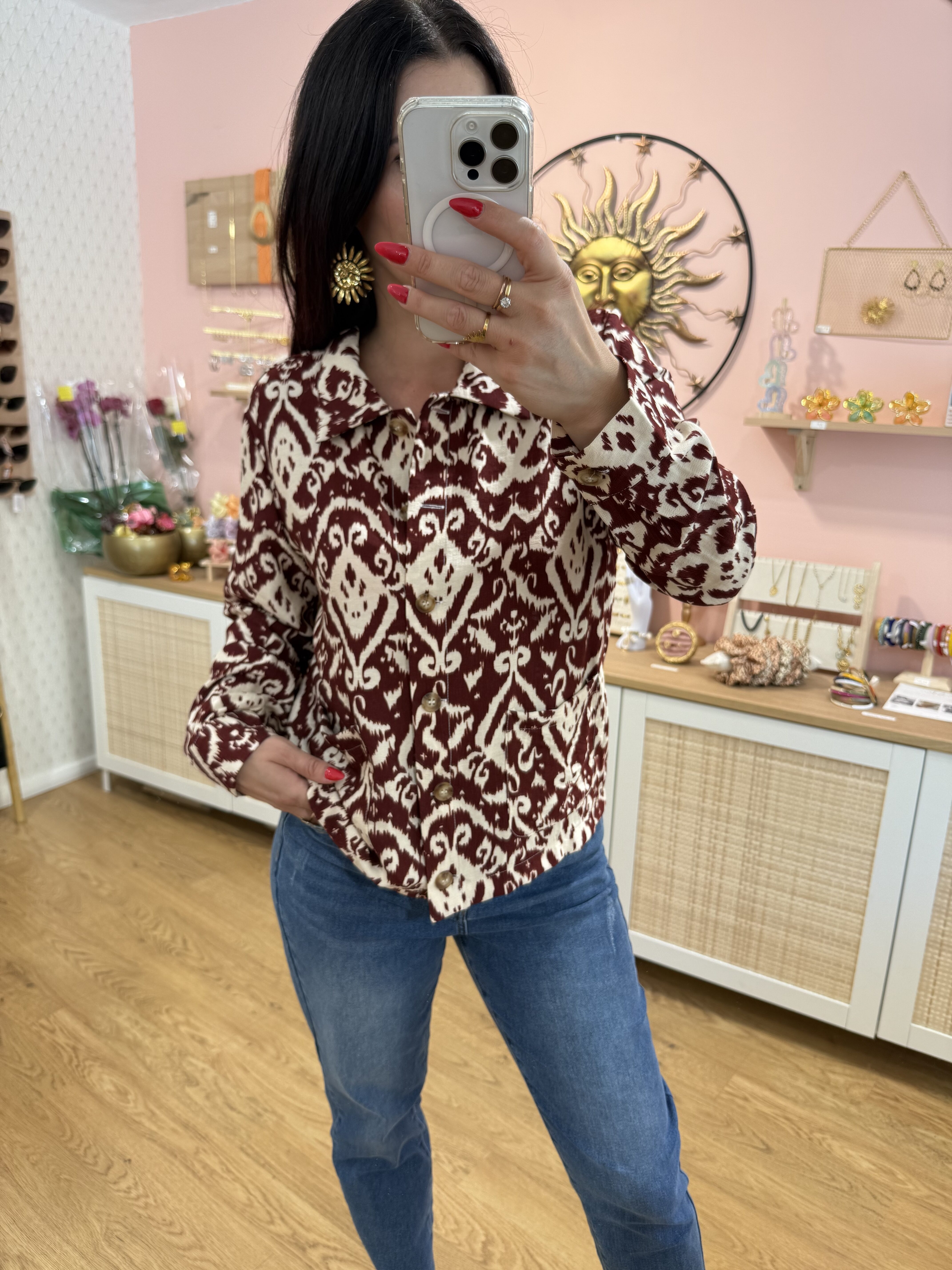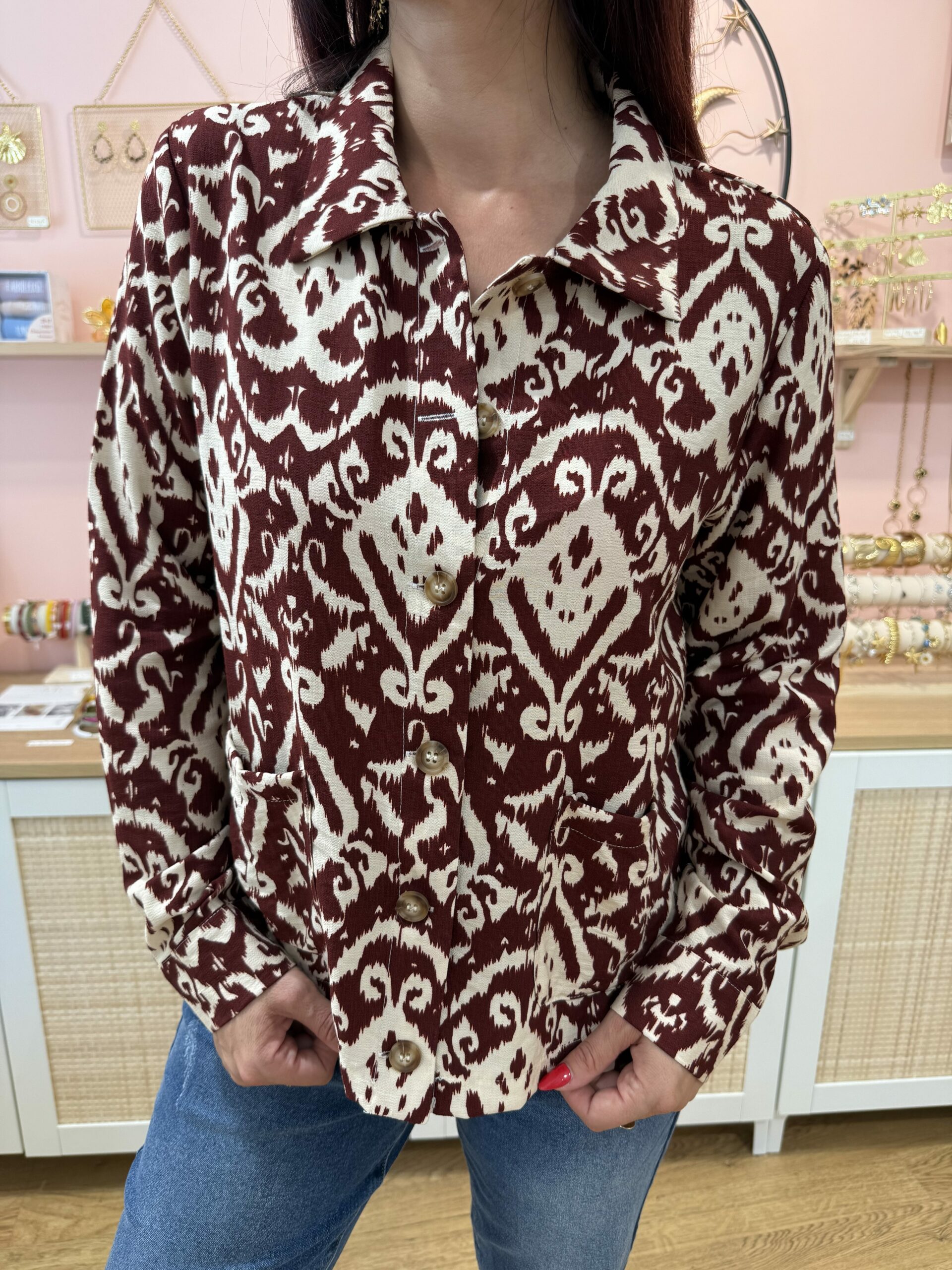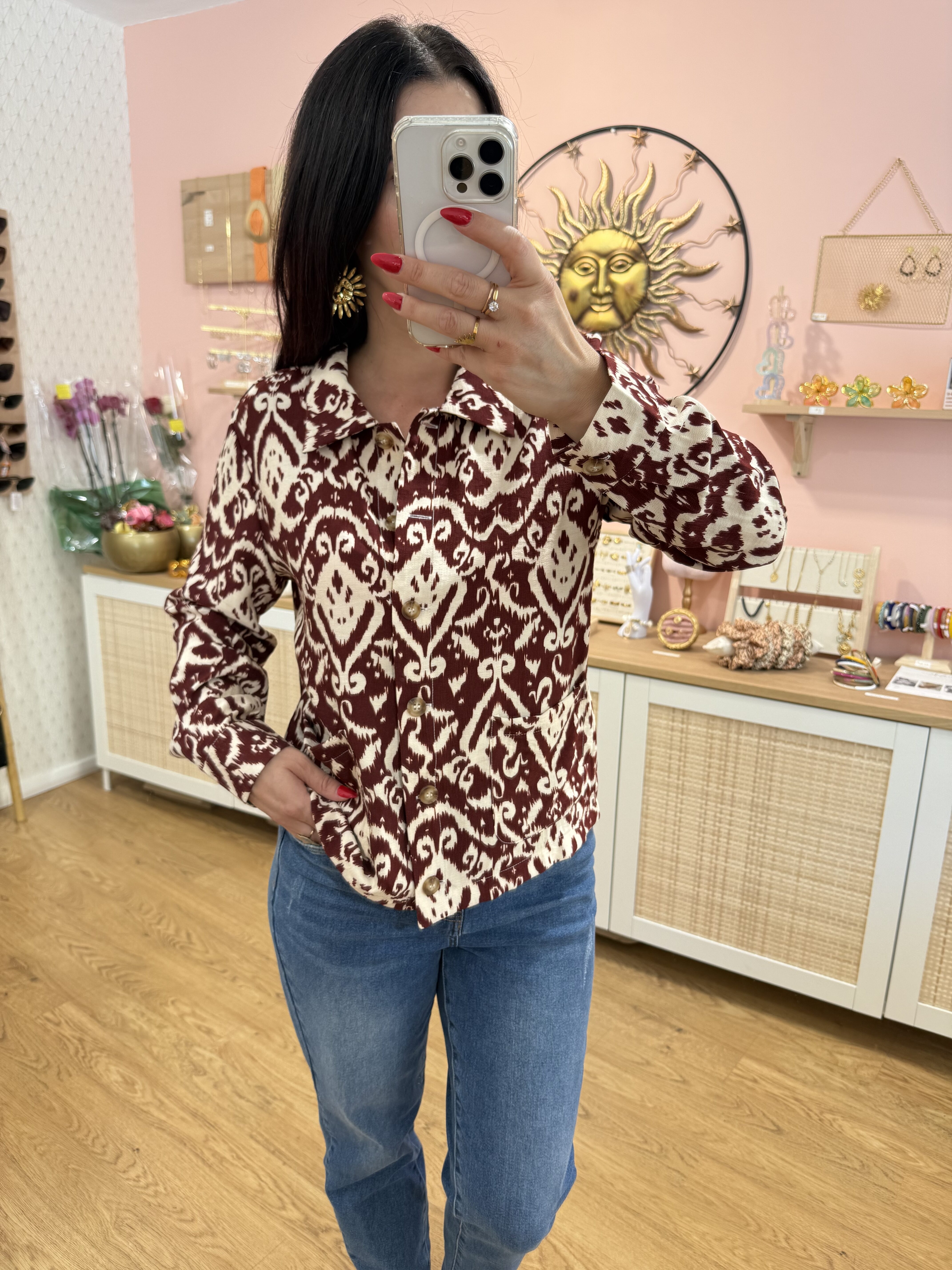 Chemise Amaya – Motif ethnique bordeaux & écru