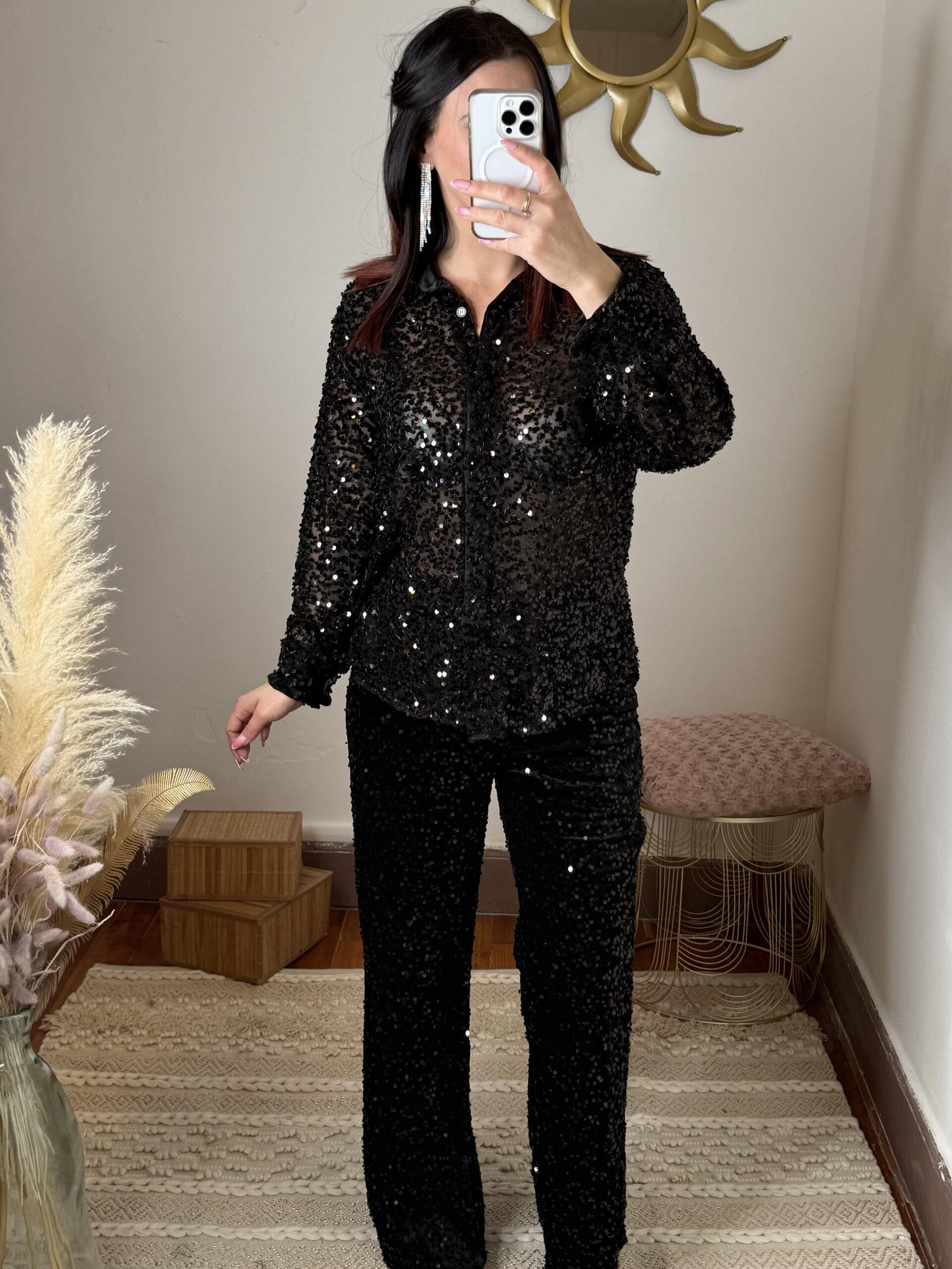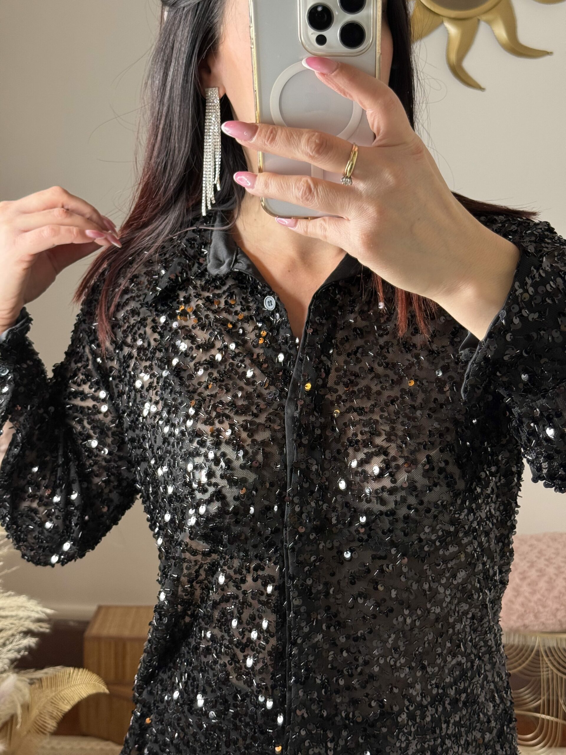 La chemise Aria est la pièce festive qui fait tourner toutes les têtes. Entièrement recouverte de sequins noirs lumineux, elle joue subtilement entre transparence et brillance pour offrir un look glamour, audacieux et terriblement élégant.