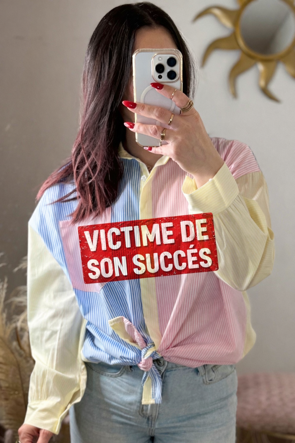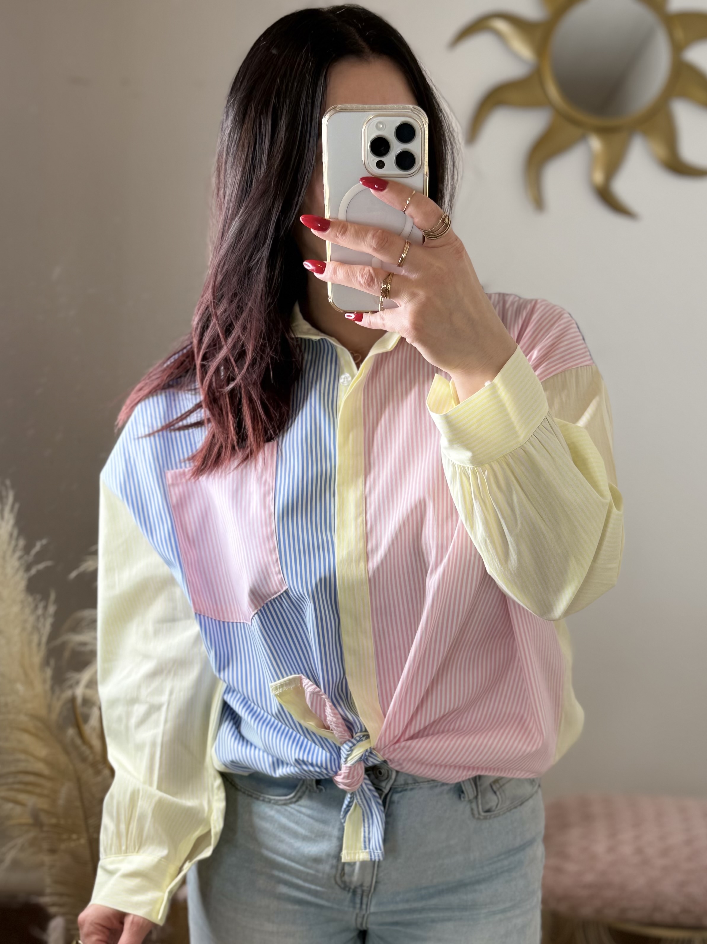 La chemise Léonie est la pièce parfaite pour apporter une touche de fraîcheur et d’originalité à votre dressing. Avec son design patchwork ultra tendance mêlant rayures bleues et roses, elle joue sur les contrastes tout en restant douce et lumineuse grâce à ses manches jaune pastel.