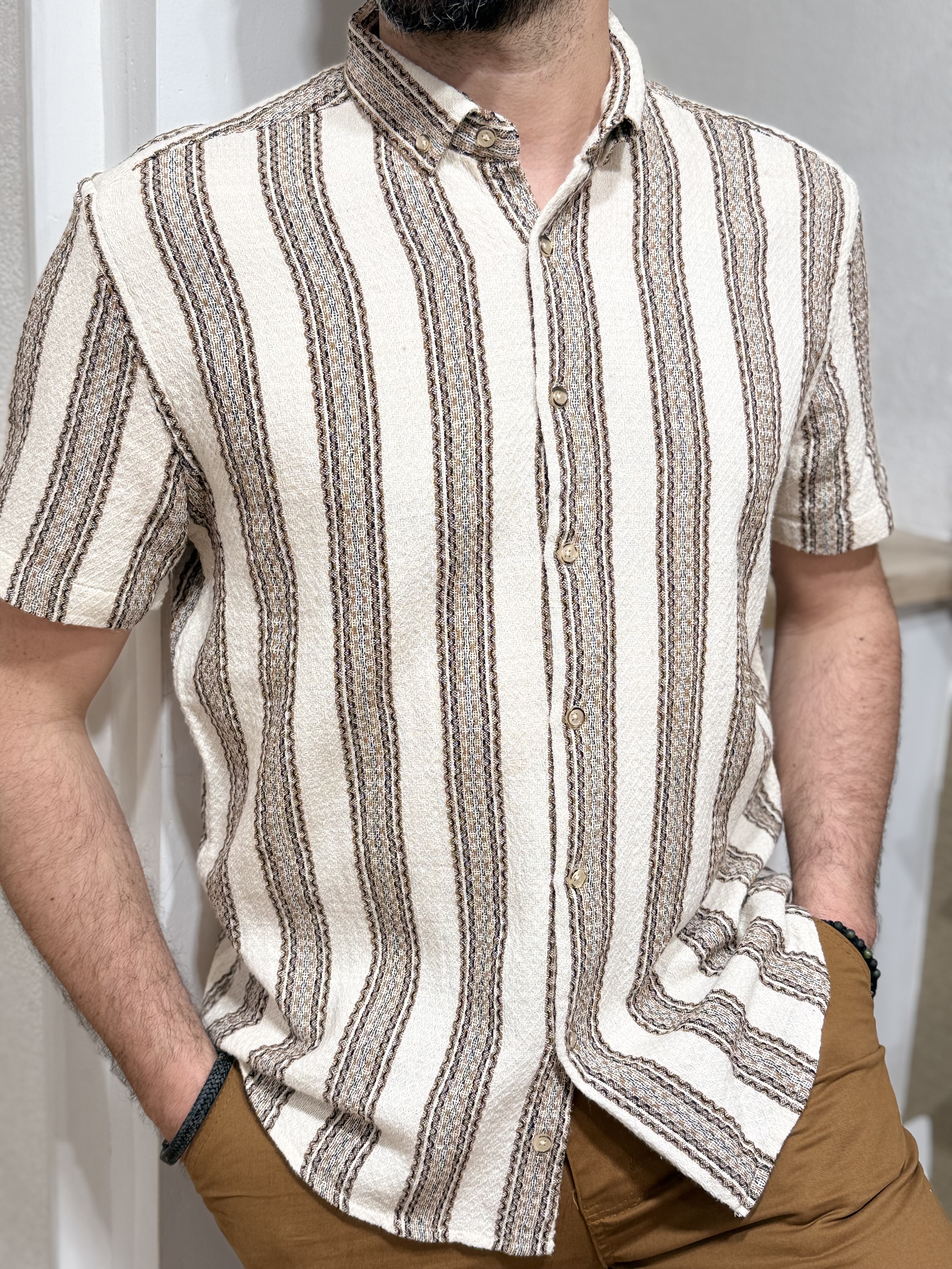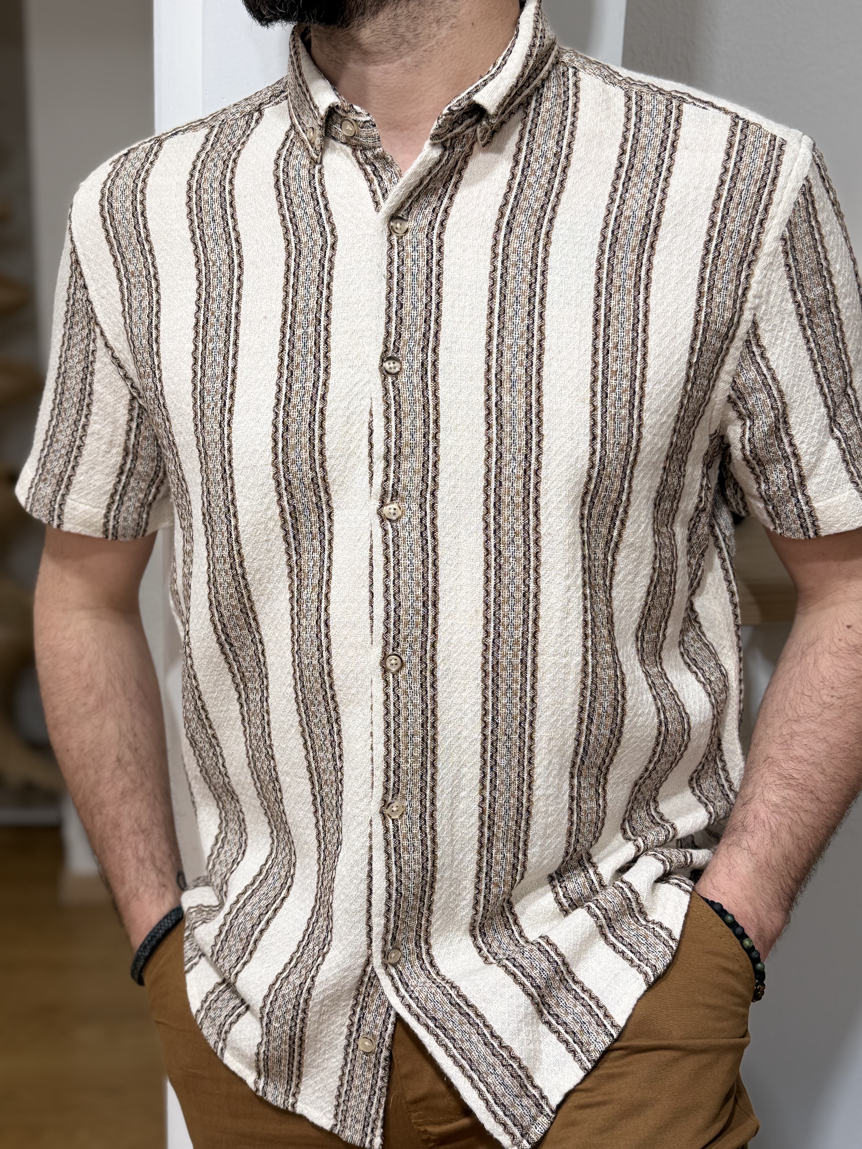 Son jeu de rayures verticales dans des tons beige, sable et brun apporte du relief et structure la silhouette tout en conservant une allure naturelle et raffinée. Les nuances chaleureuses évoquent le soleil, la pierre et la mer — parfaite pour la saison.