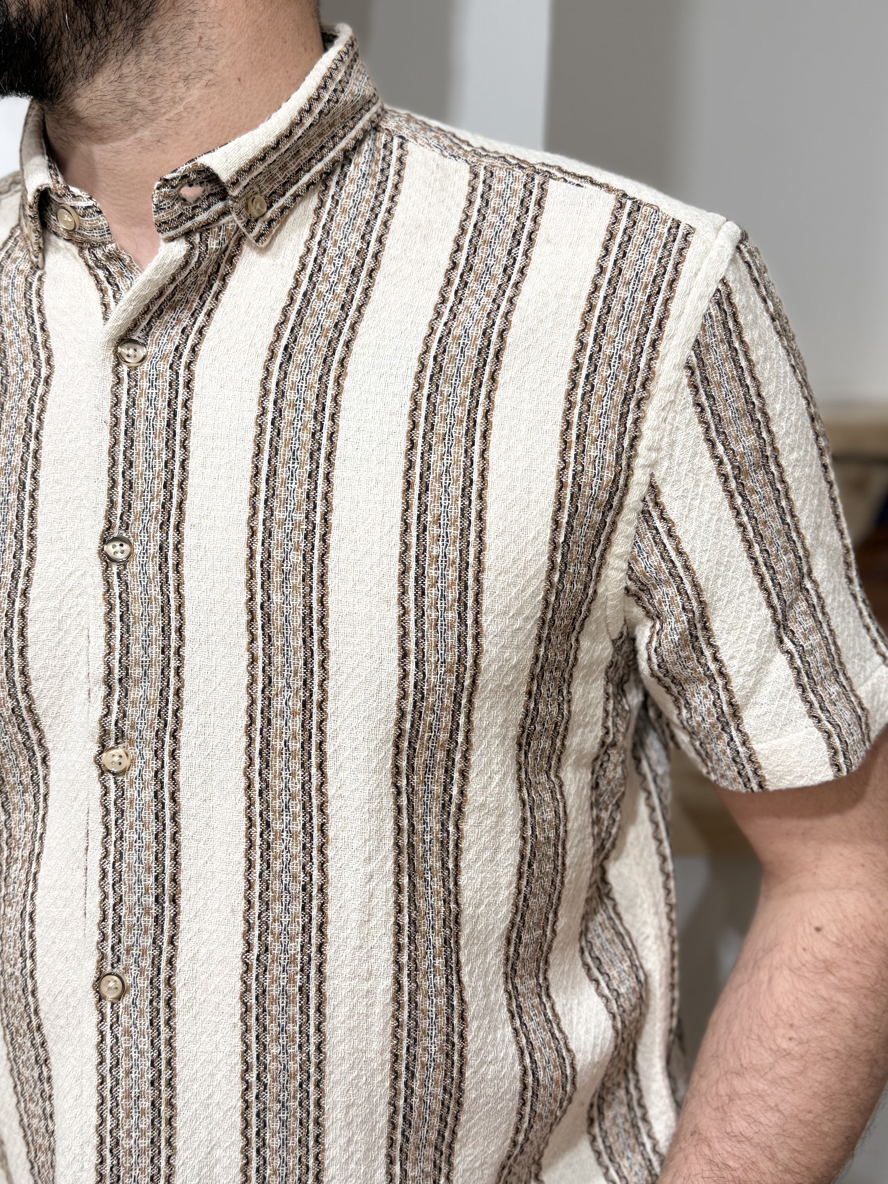 – Rayures verticales beige, sable et brun