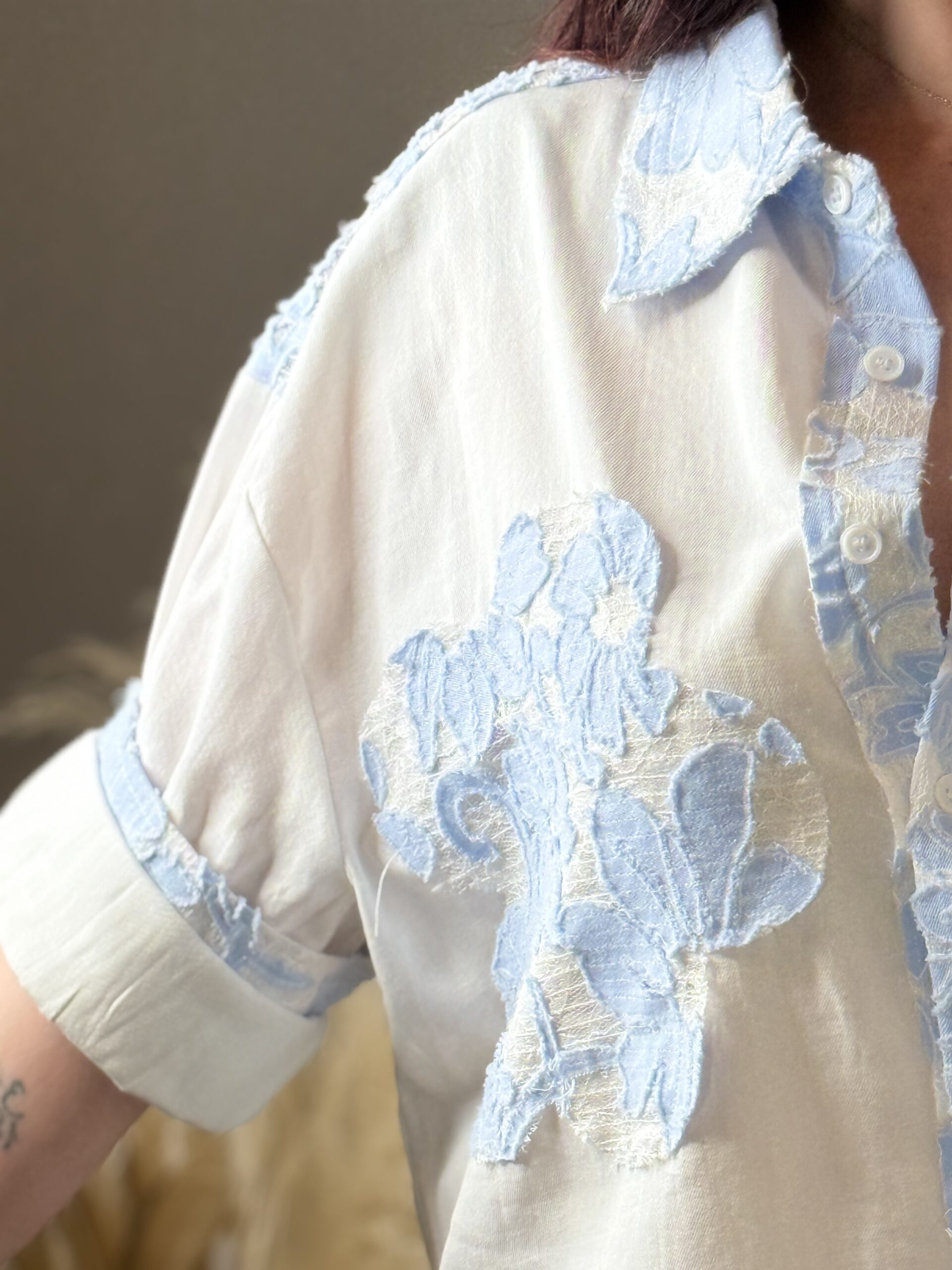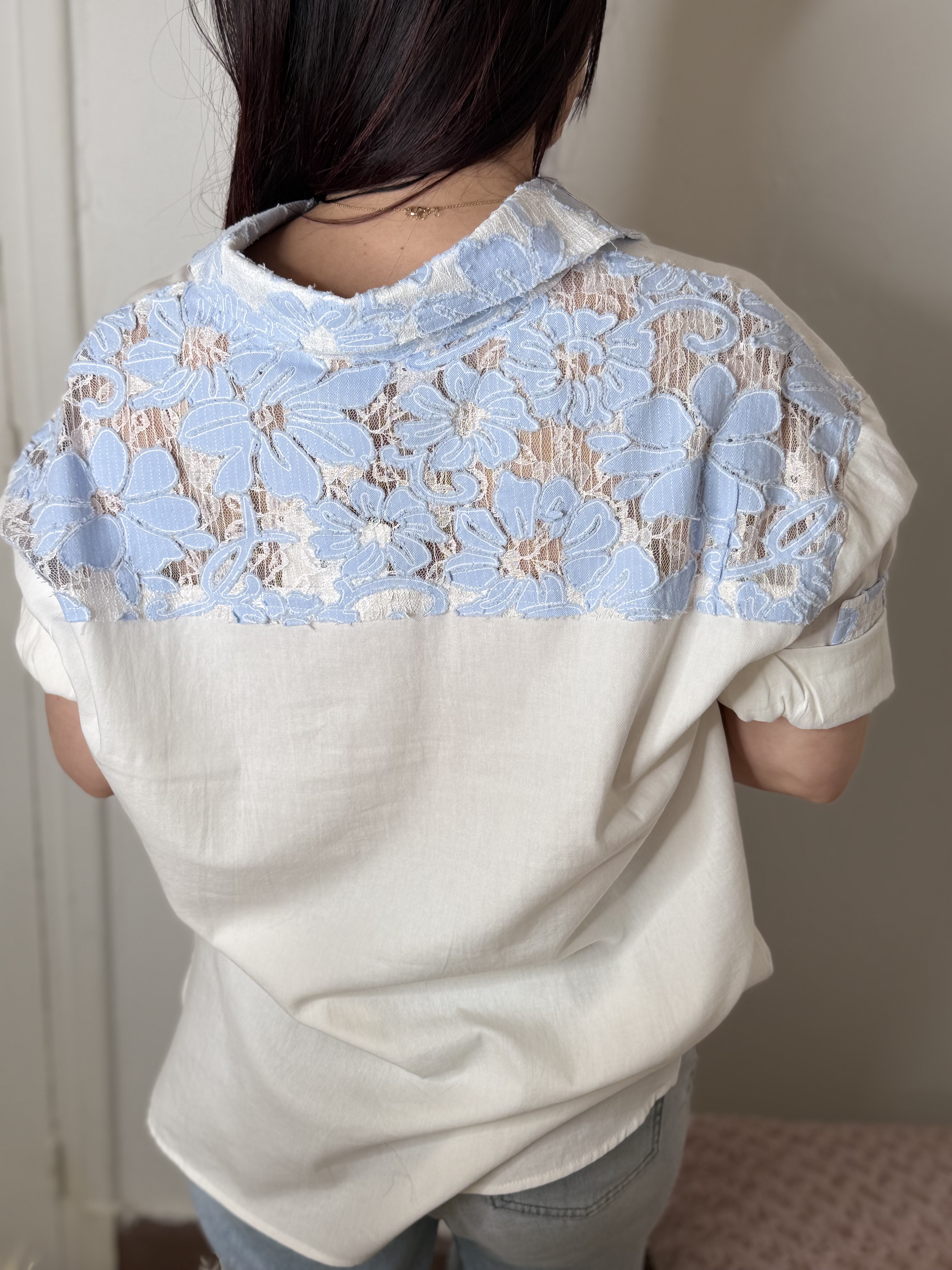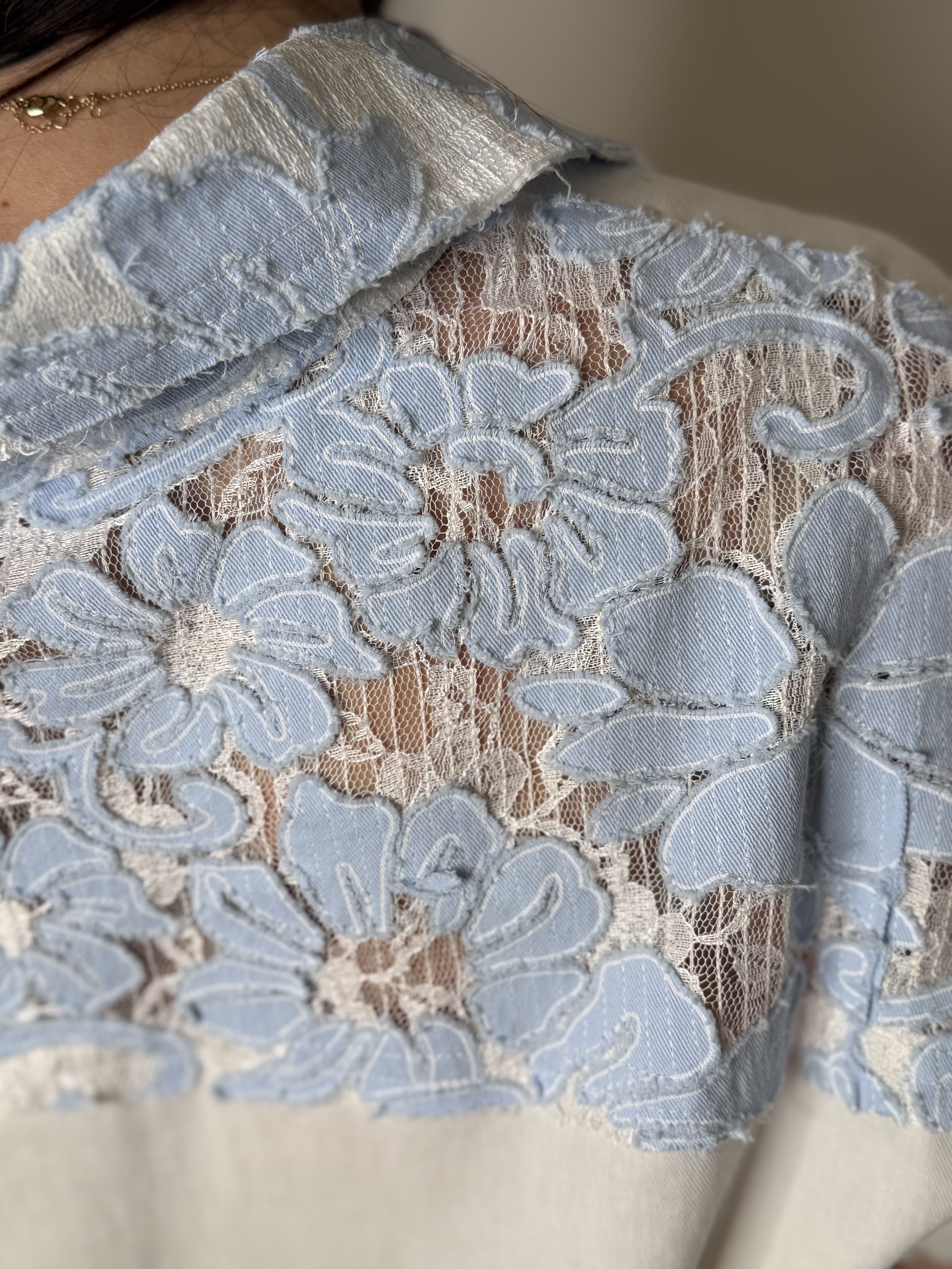 Son tissu léger et agréable, composé à 60% polyester et 40% coton, assure confort et tenue parfaite tout au long de la journée. On tombe sous le charme de ses empiècements en dentelle florale bleu ciel, subtilement ajourés, qui créent un joli jeu de transparence tout en apportant du relief à la silhouette.