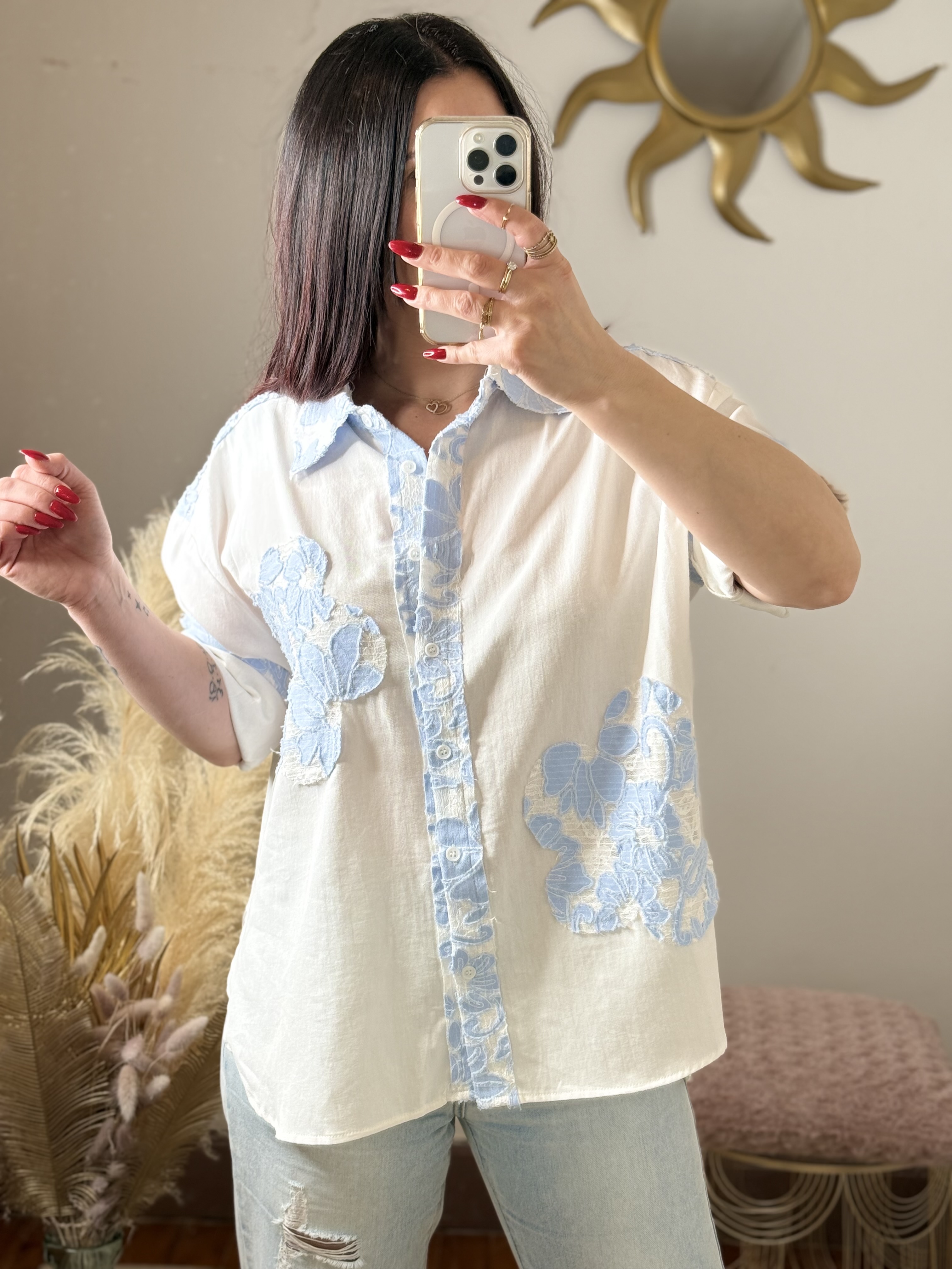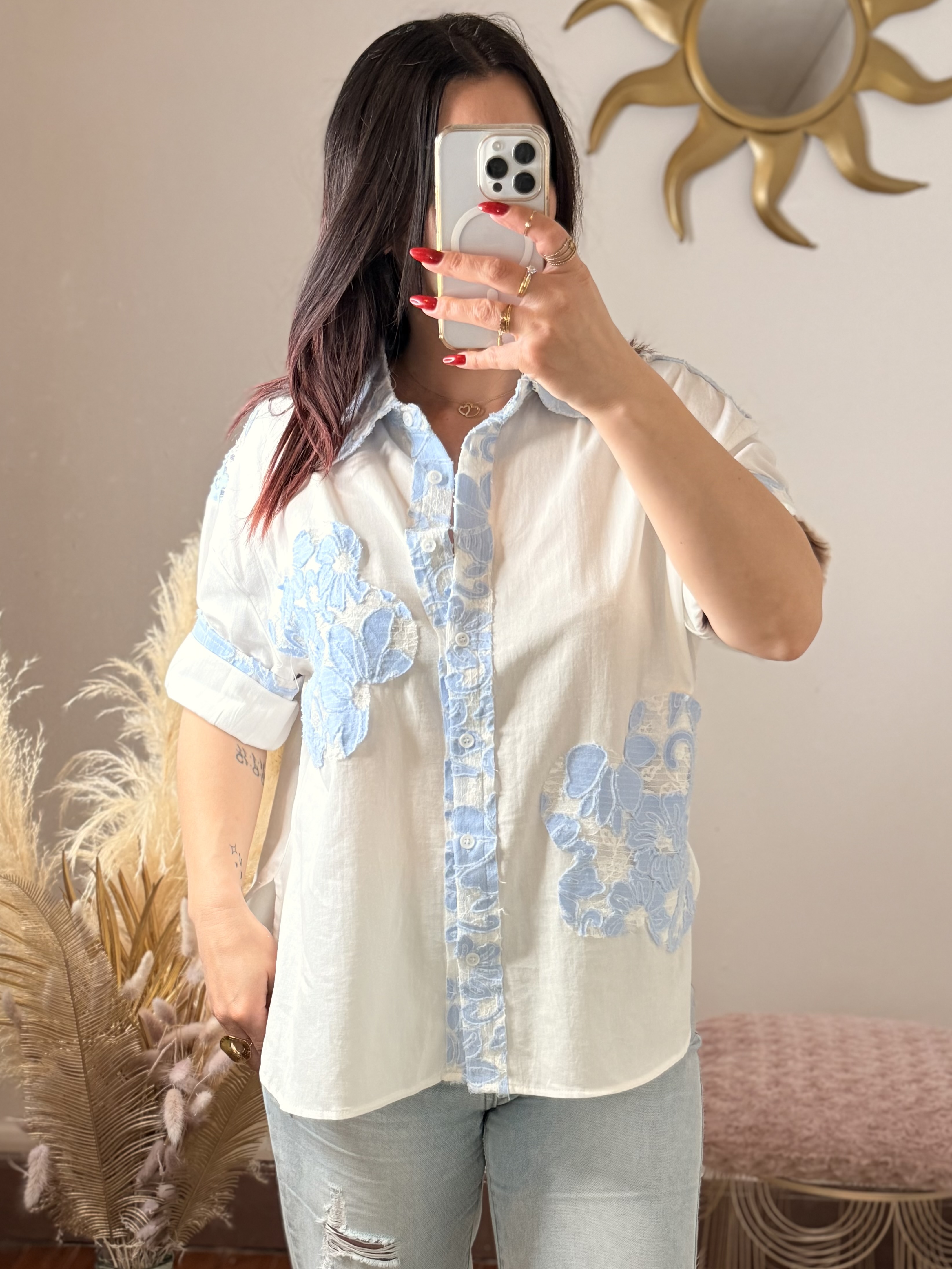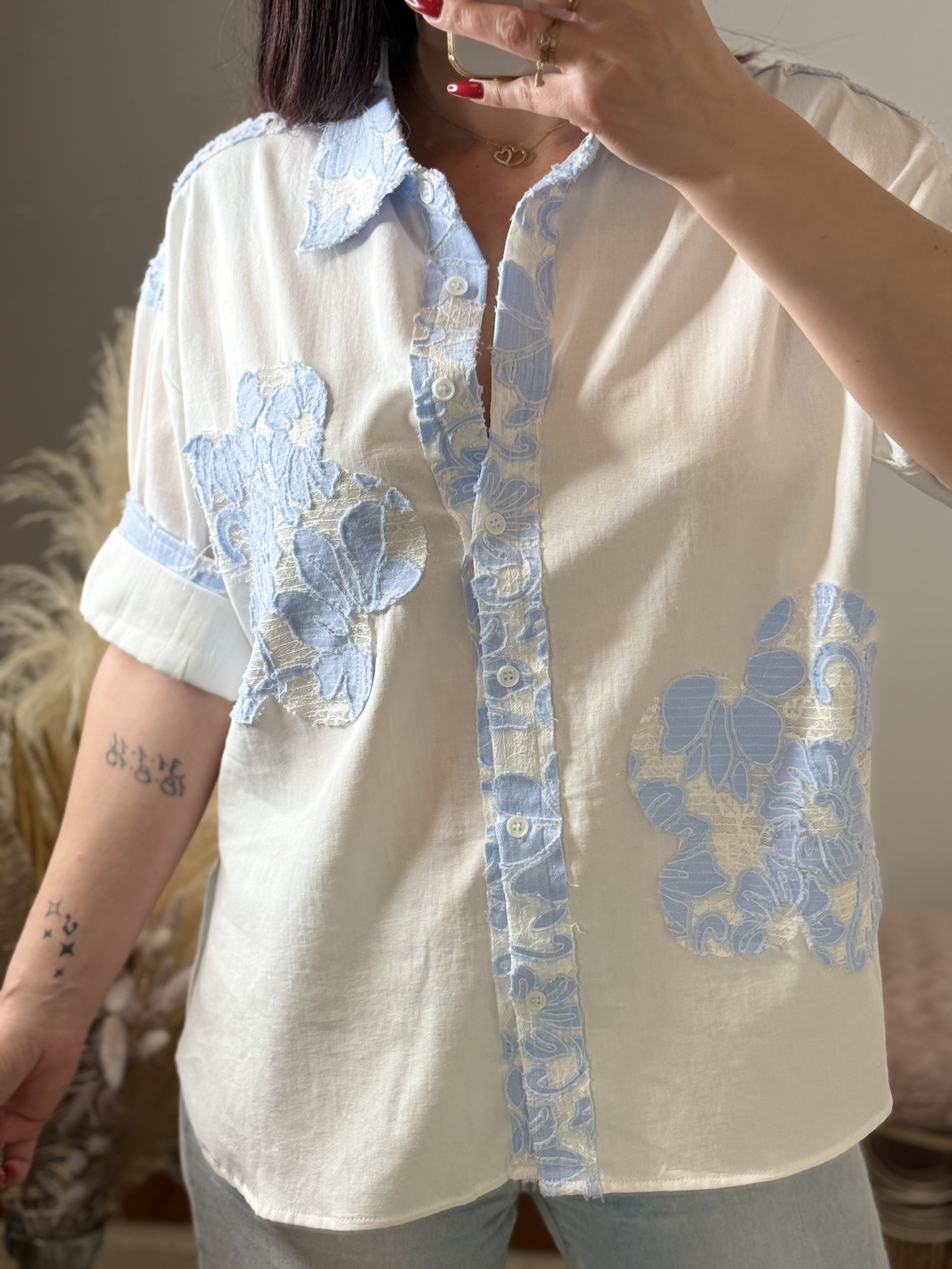 Son tissu léger et agréable, composé à 60% polyester et 40% coton, assure confort et tenue parfaite tout au long de la journée. On tombe sous le charme de ses empiècements en dentelle florale bleu ciel, subtilement ajourés, qui créent un joli jeu de transparence tout en apportant du relief à la silhouette.