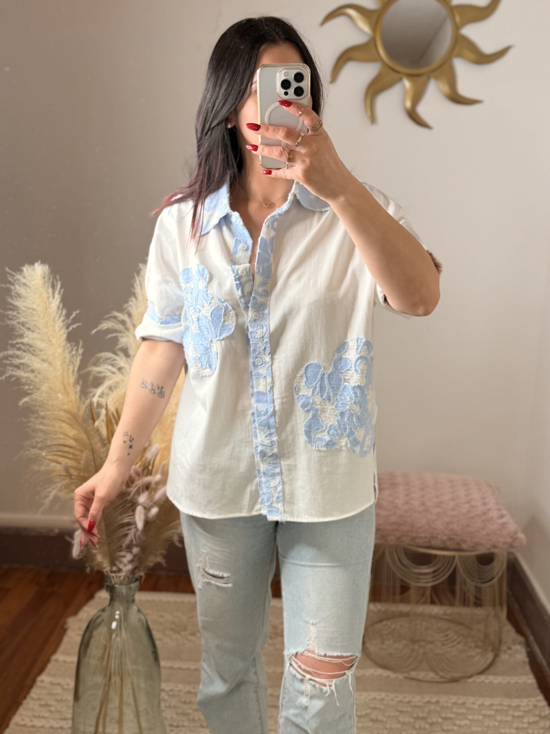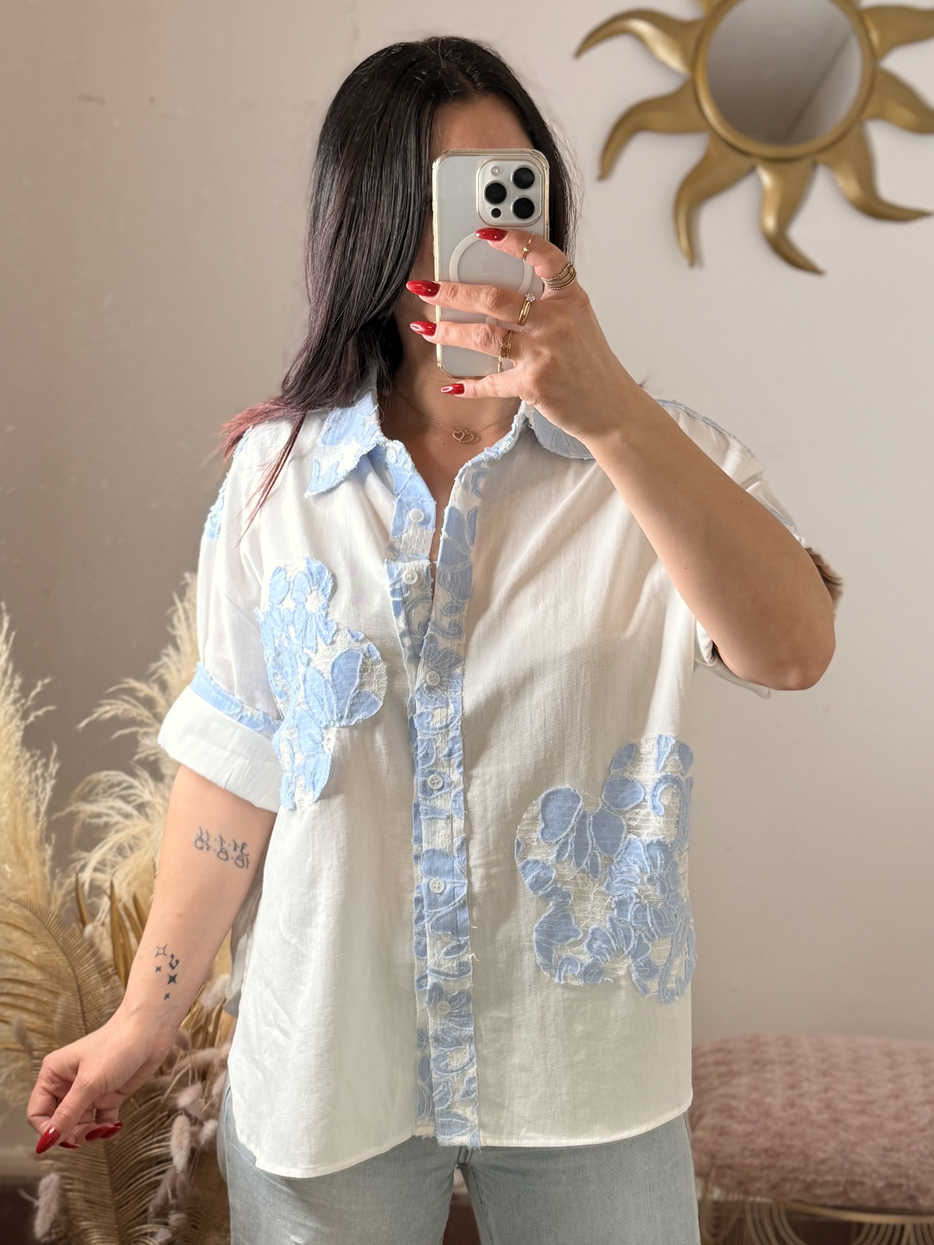 Sa coupe fluide et ses manches courtes légèrement retroussées en font une pièce idéale pour la saison, à la fois chic et décontractée.