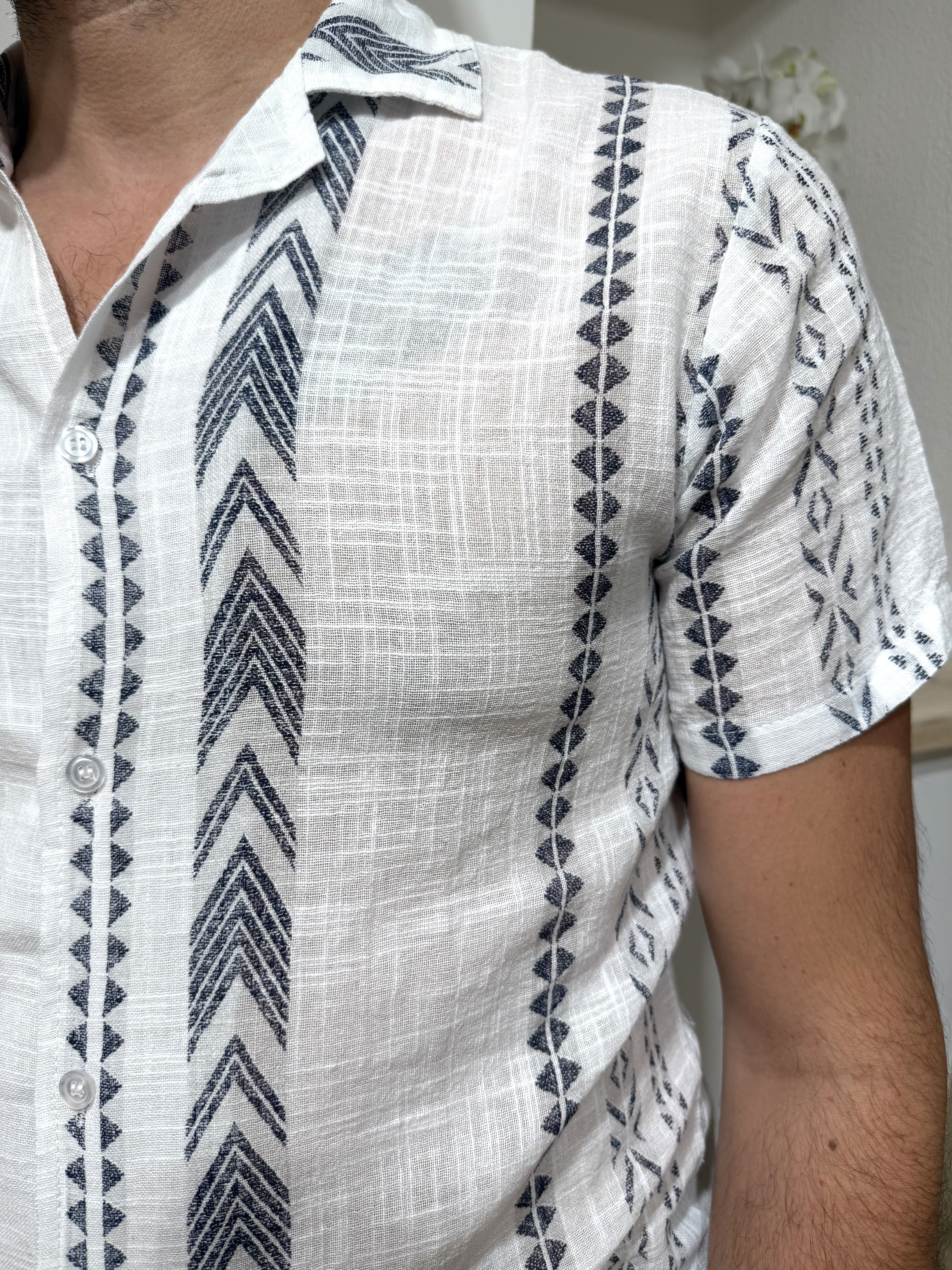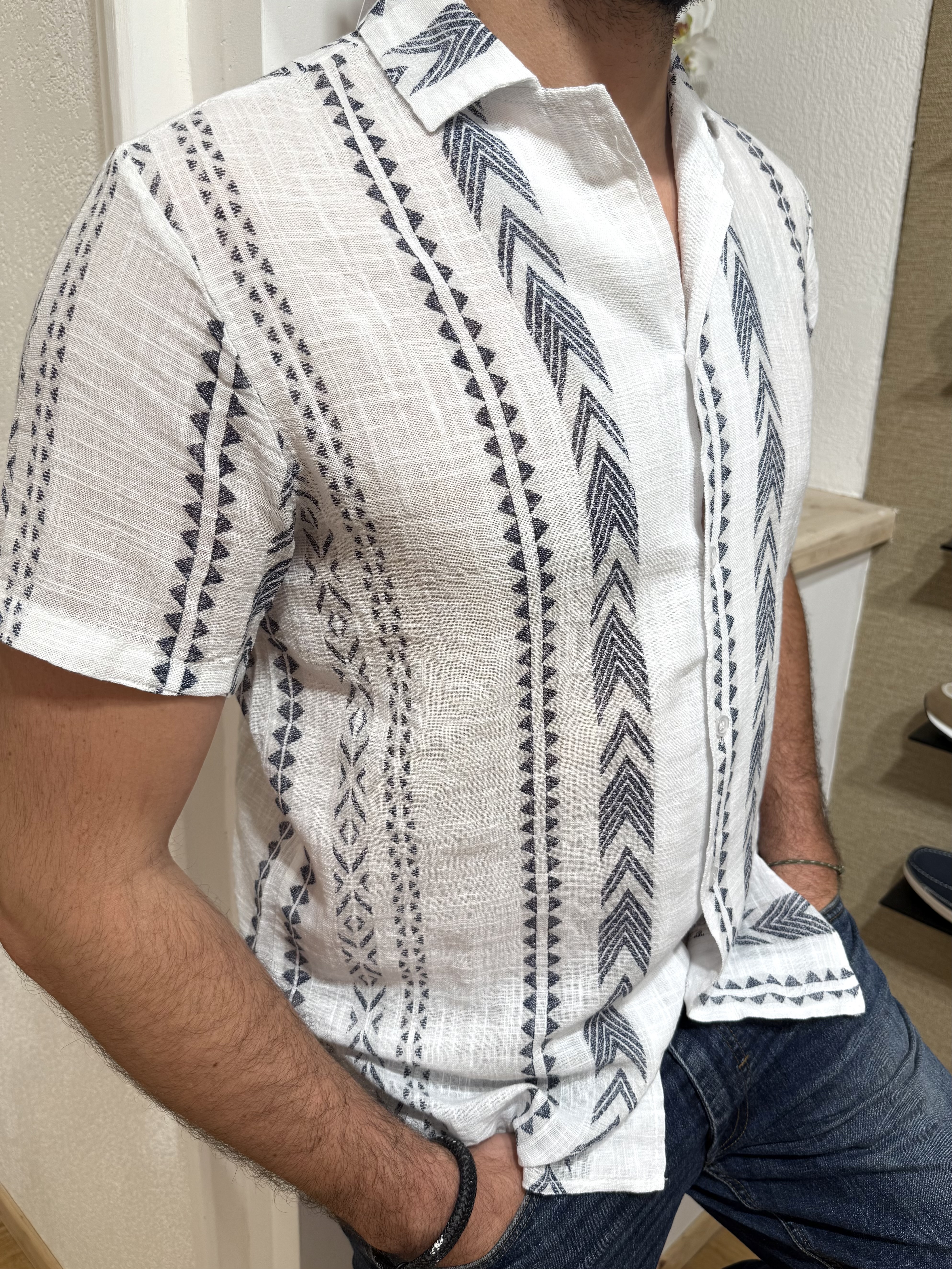 Un vent d’évasion souffle sur votre dressing avec cette chemise blanche à motifs graphiques ethniques noirs. Léger, fluide et agréable à porter, ce modèle à col ouvert est parfait pour une allure estivale chic et décontractée.