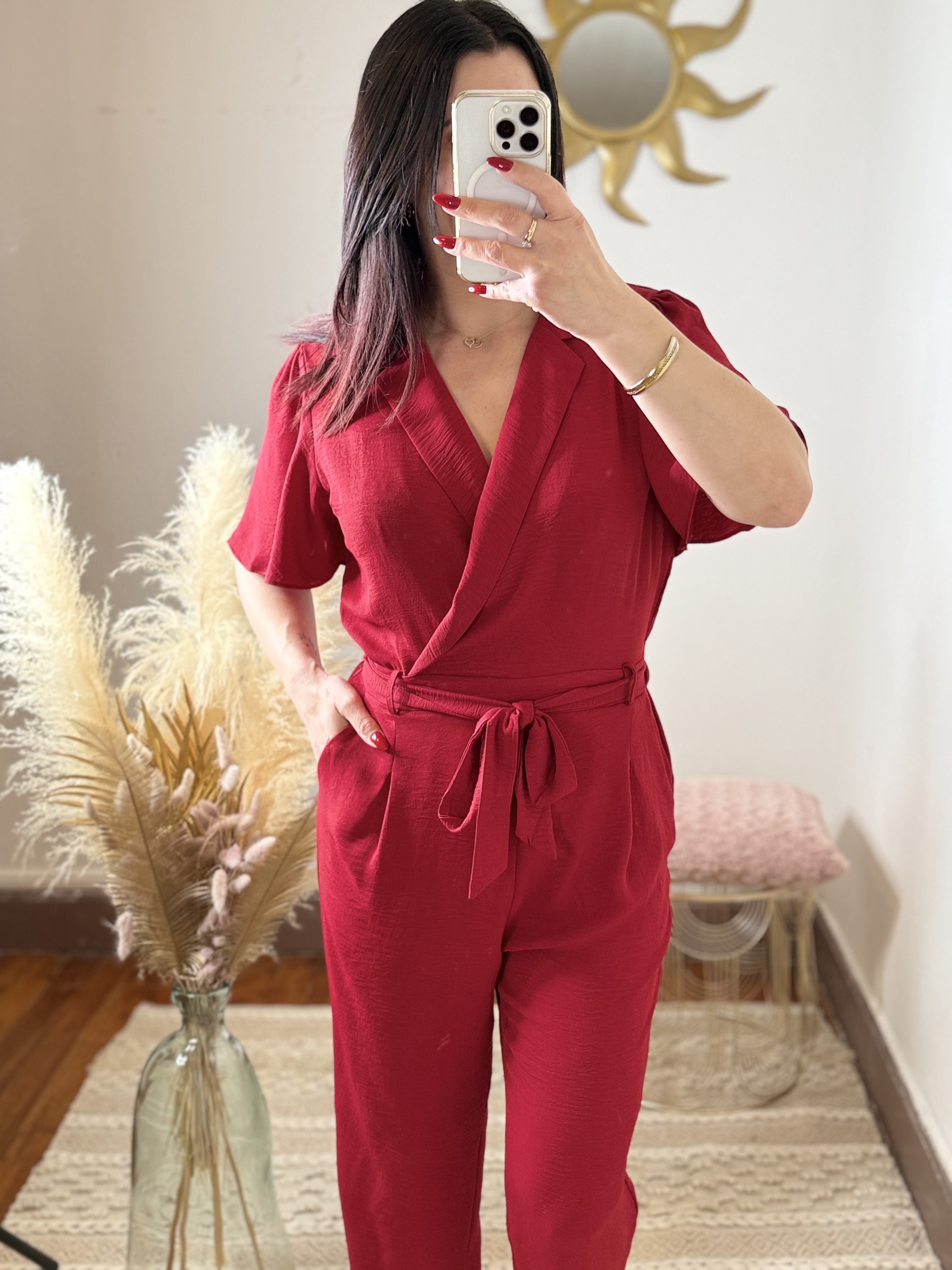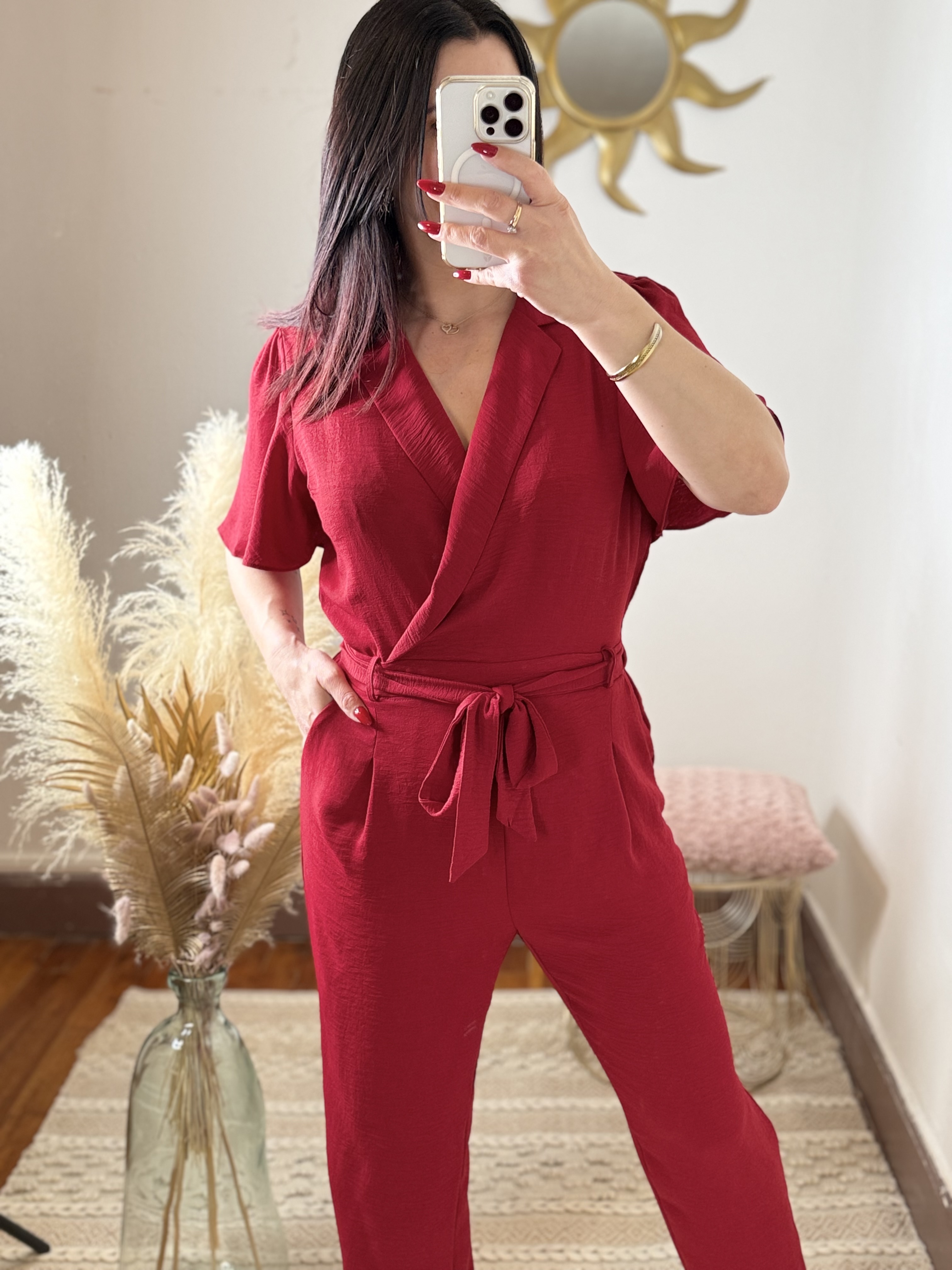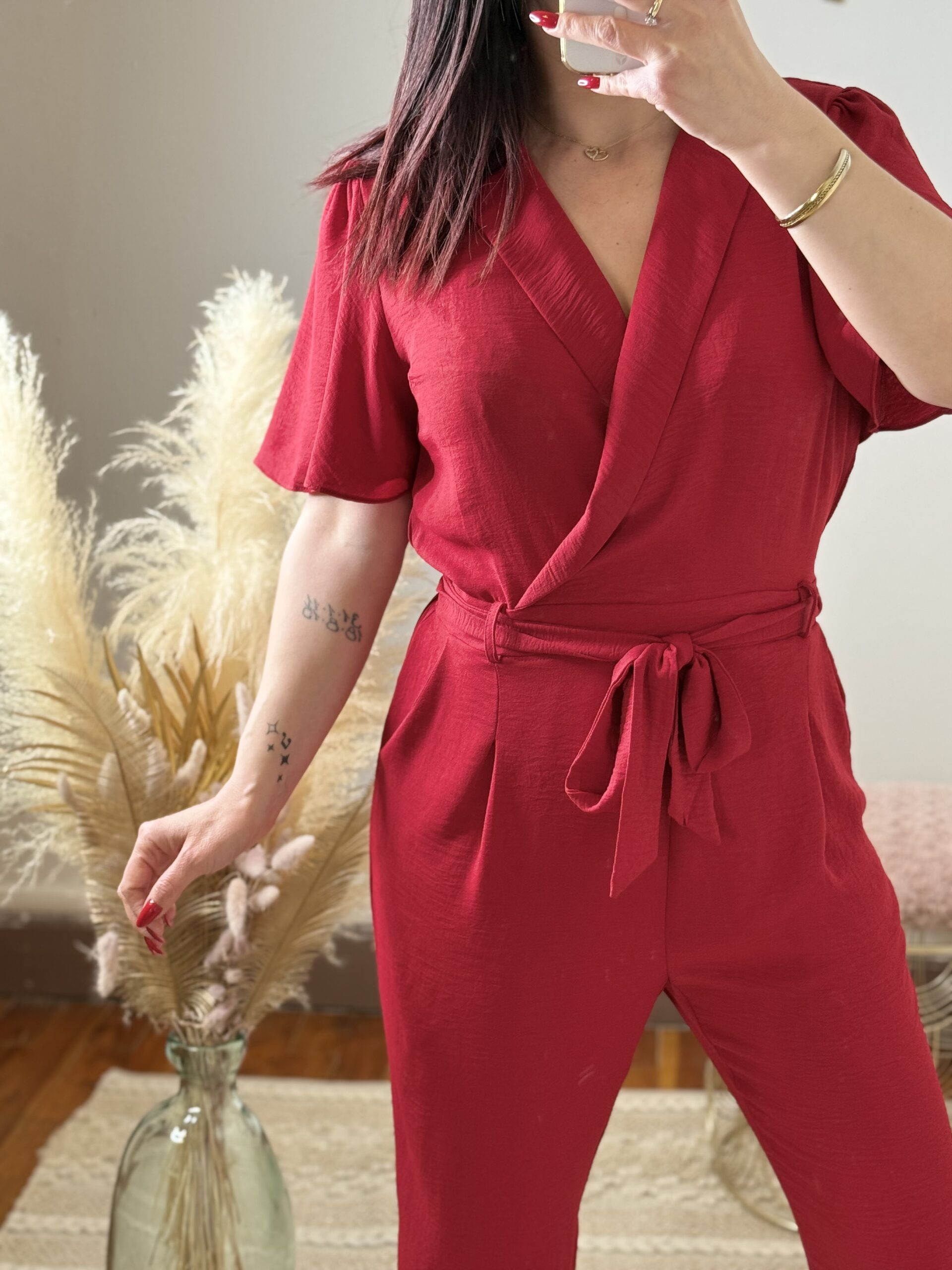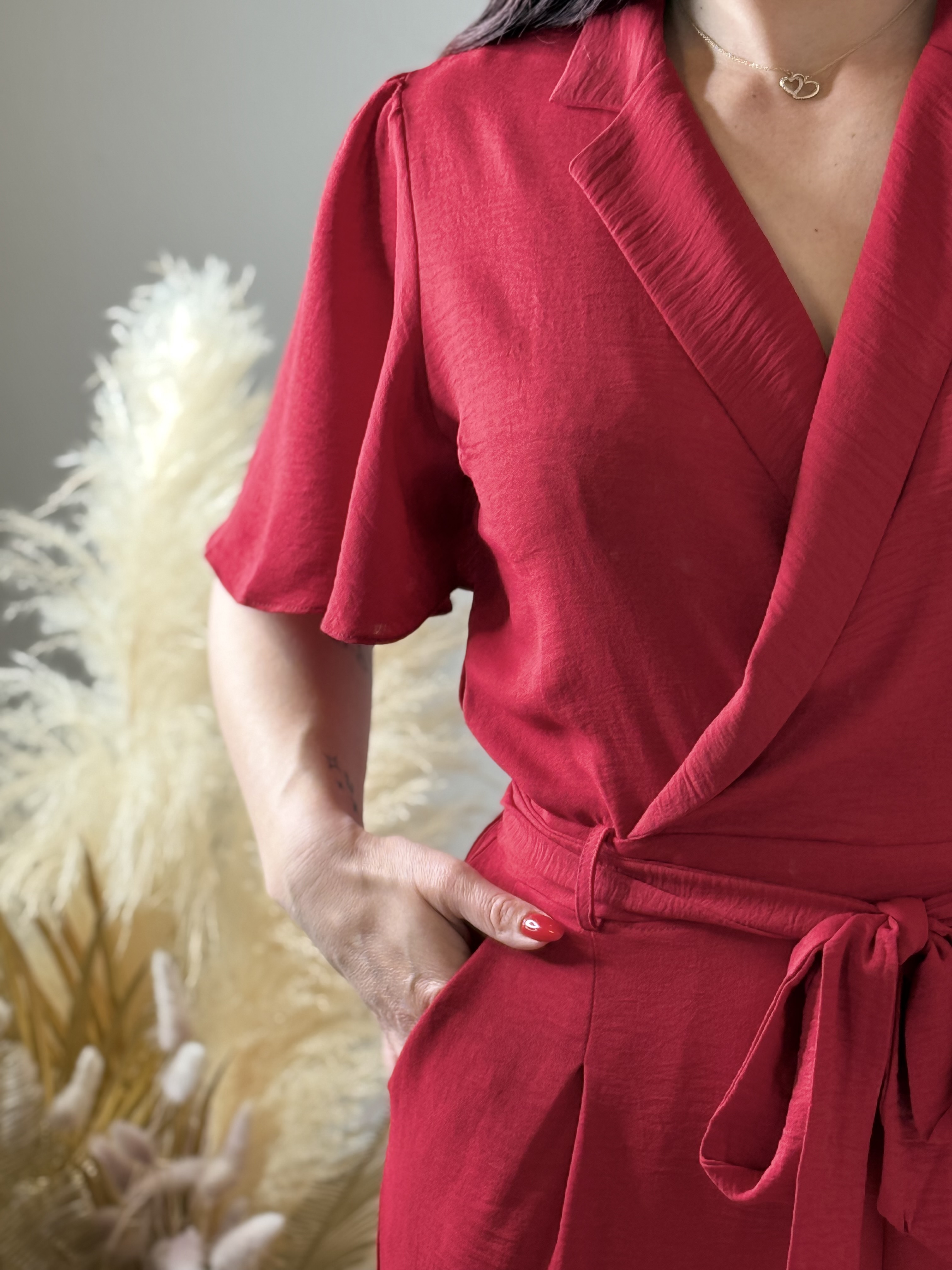 Son coloris rouge intense attire le regard et apporte une touche glamour immédiate. La coupe cache-cœur met délicatement en valeur le décolleté, tandis que la taille marquée par une ceinture à nouer structure la silhouette et souligne les courbes avec finesse.