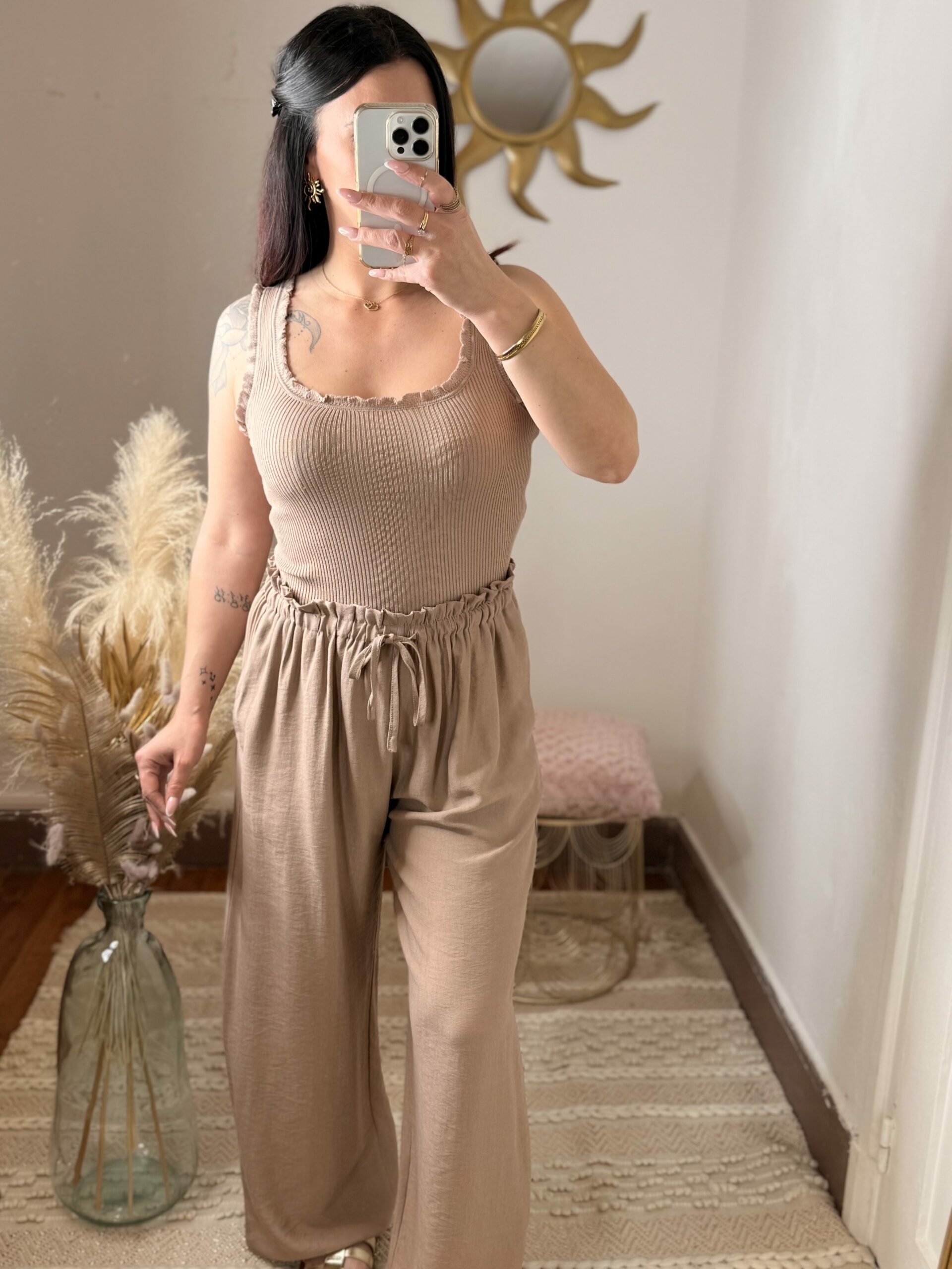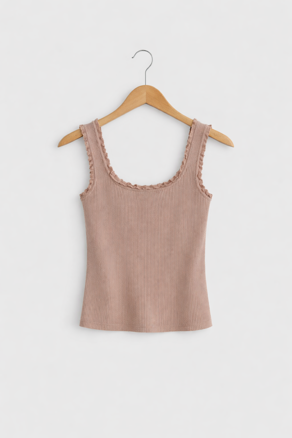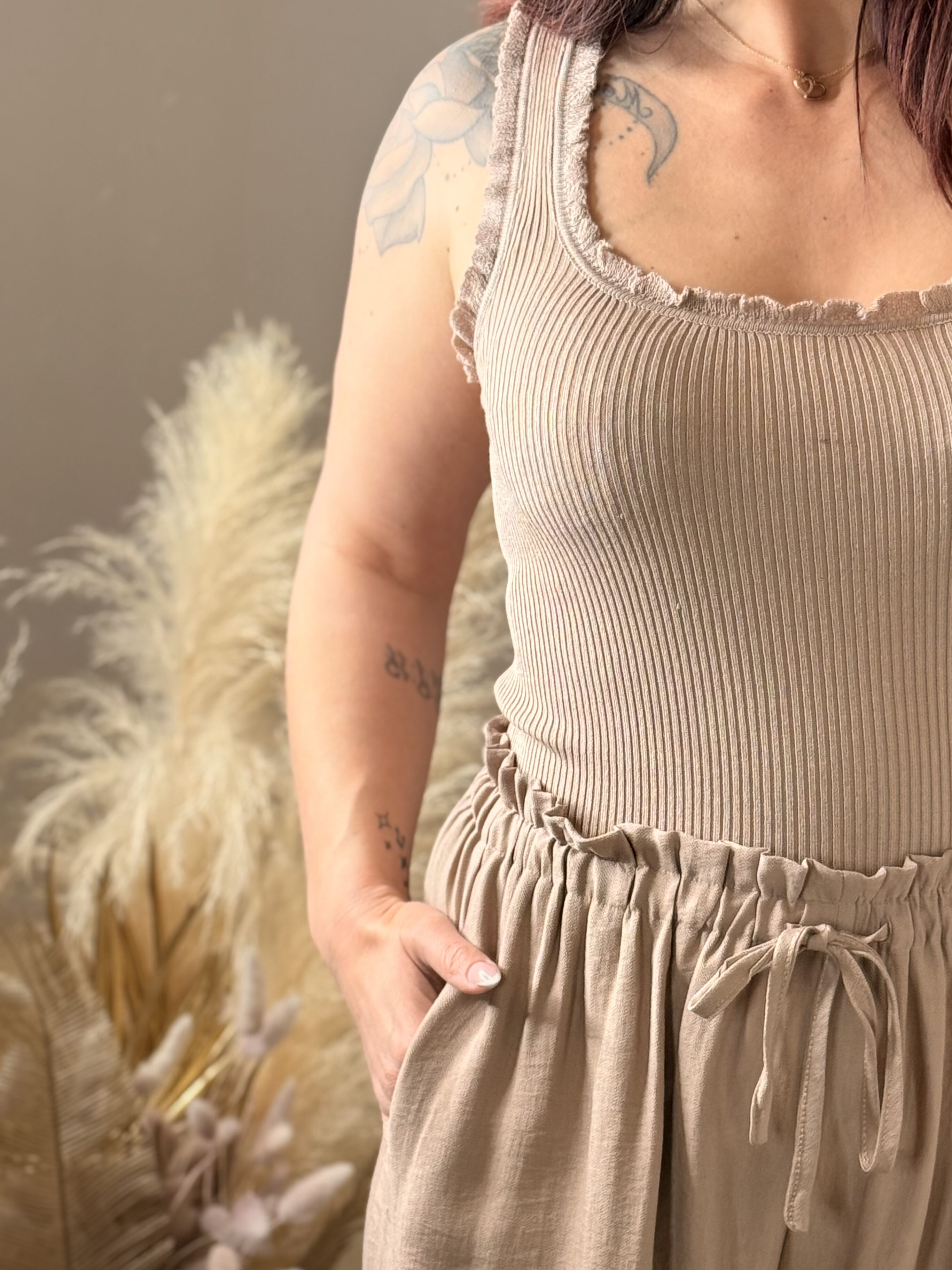 Le débardeur Althéa est la pièce essentielle du dressing, revisité avec une touche de féminité subtile. Sa maille côtelée épouse parfaitement la silhouette, tandis que ses finitions délicatement volantées apportent un détail raffiné et tendance.