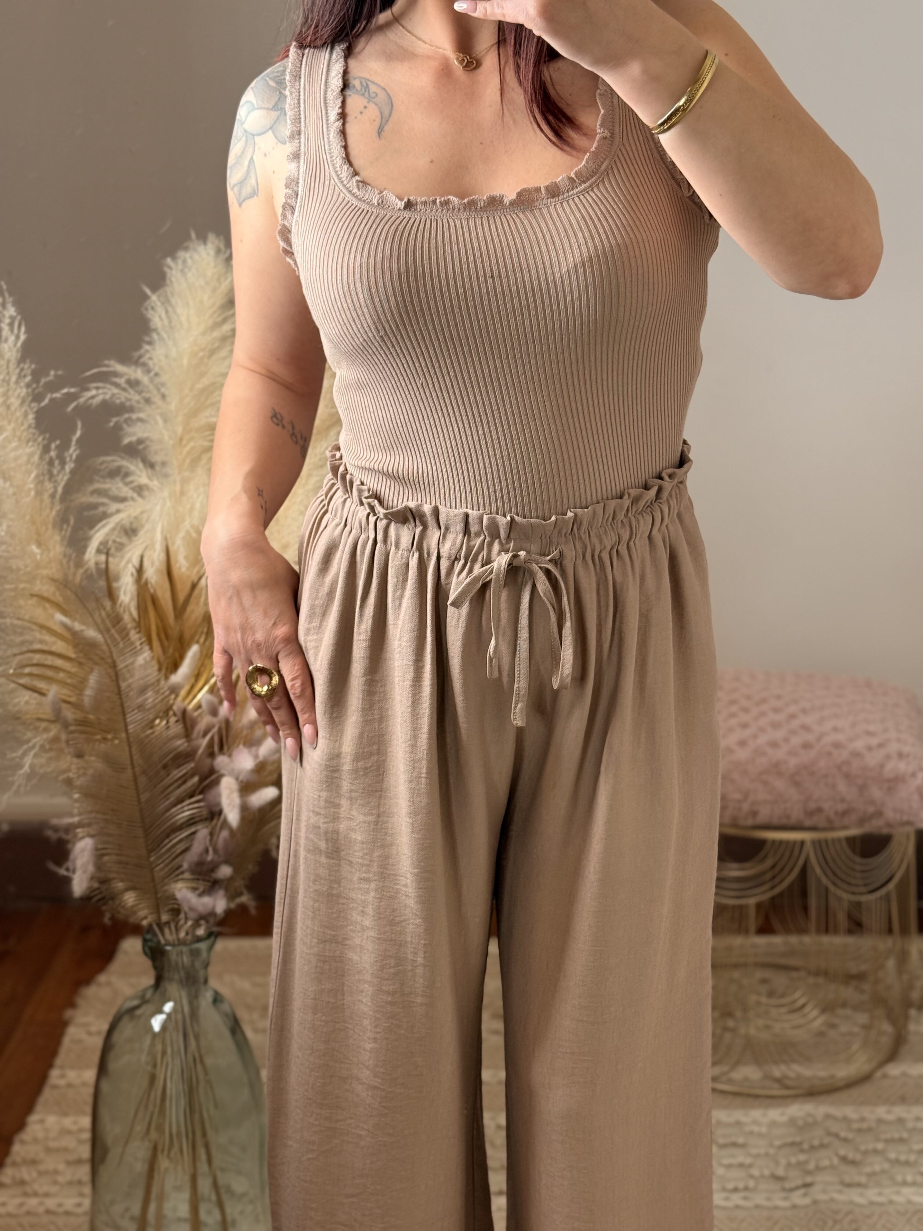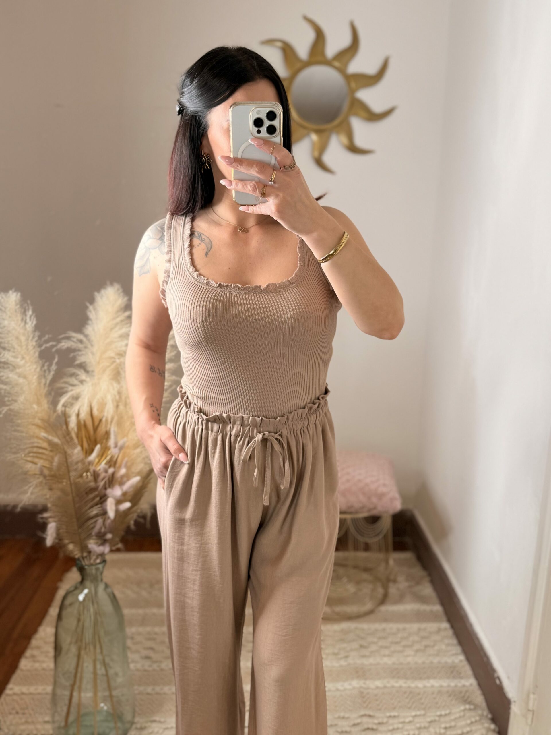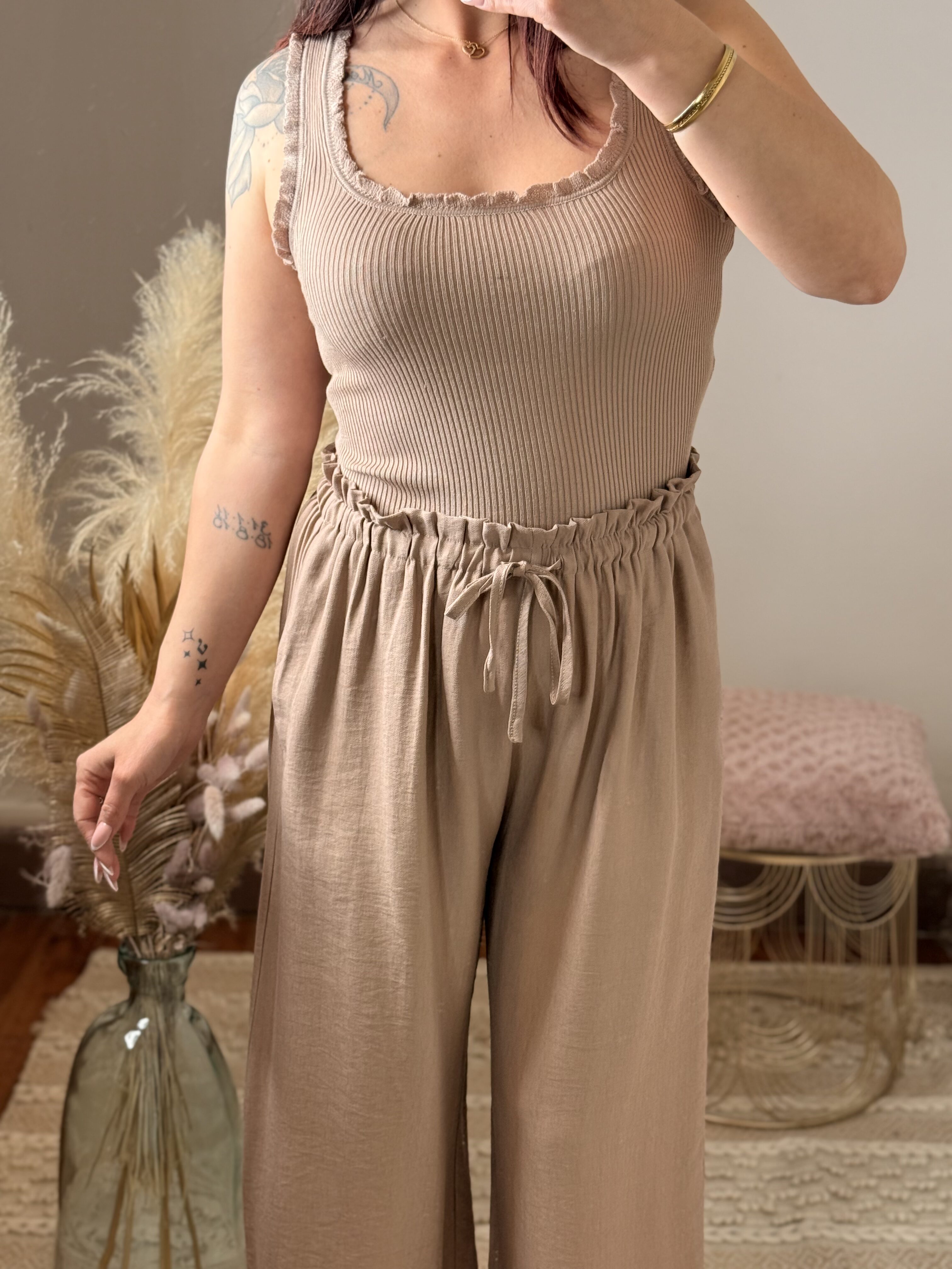 Le débardeur Althéa est la pièce essentielle du dressing, revisité avec une touche de féminité subtile. Sa maille côtelée épouse parfaitement la silhouette, tandis que ses finitions délicatement volantées apportent un détail raffiné et tendance.