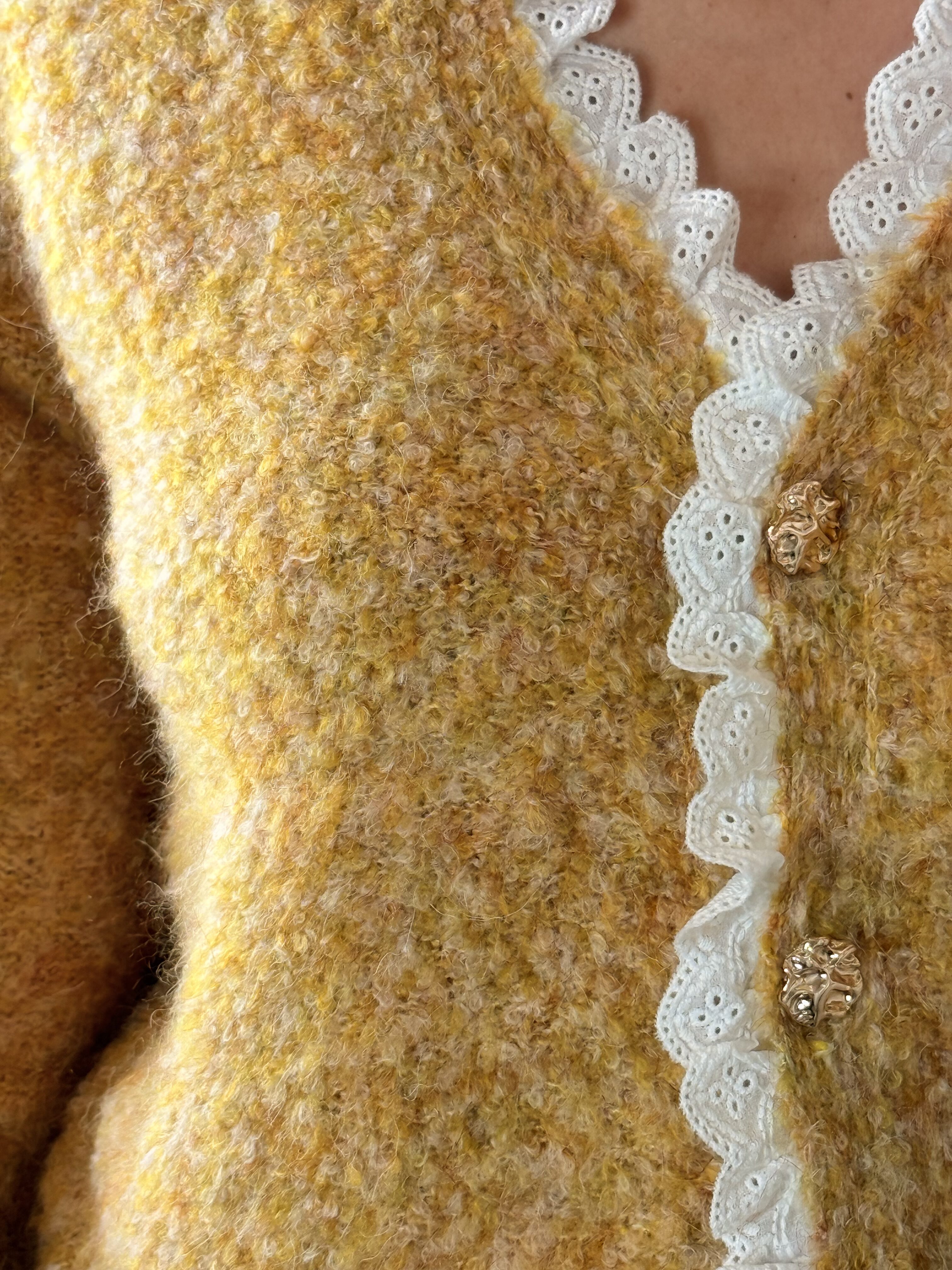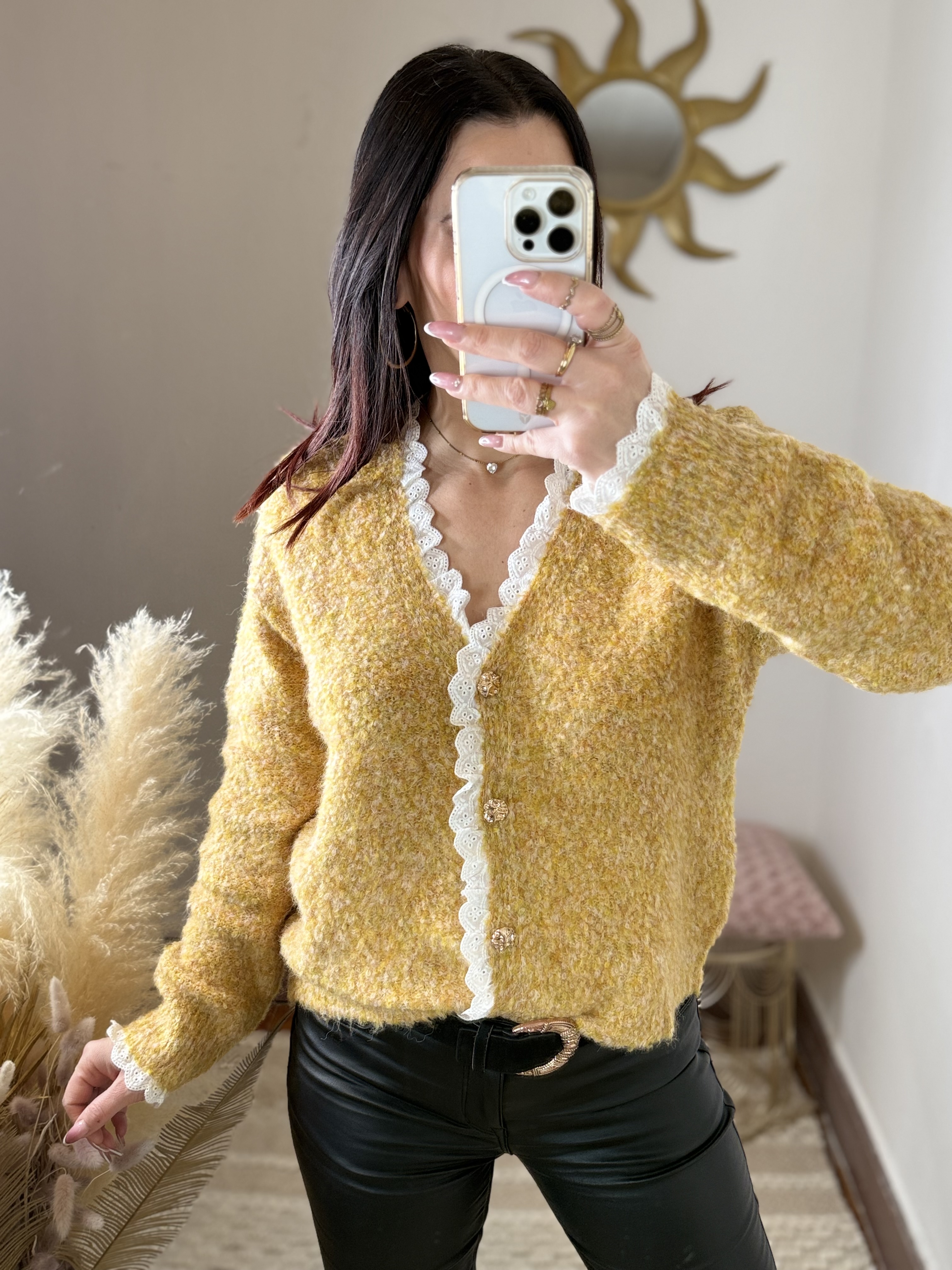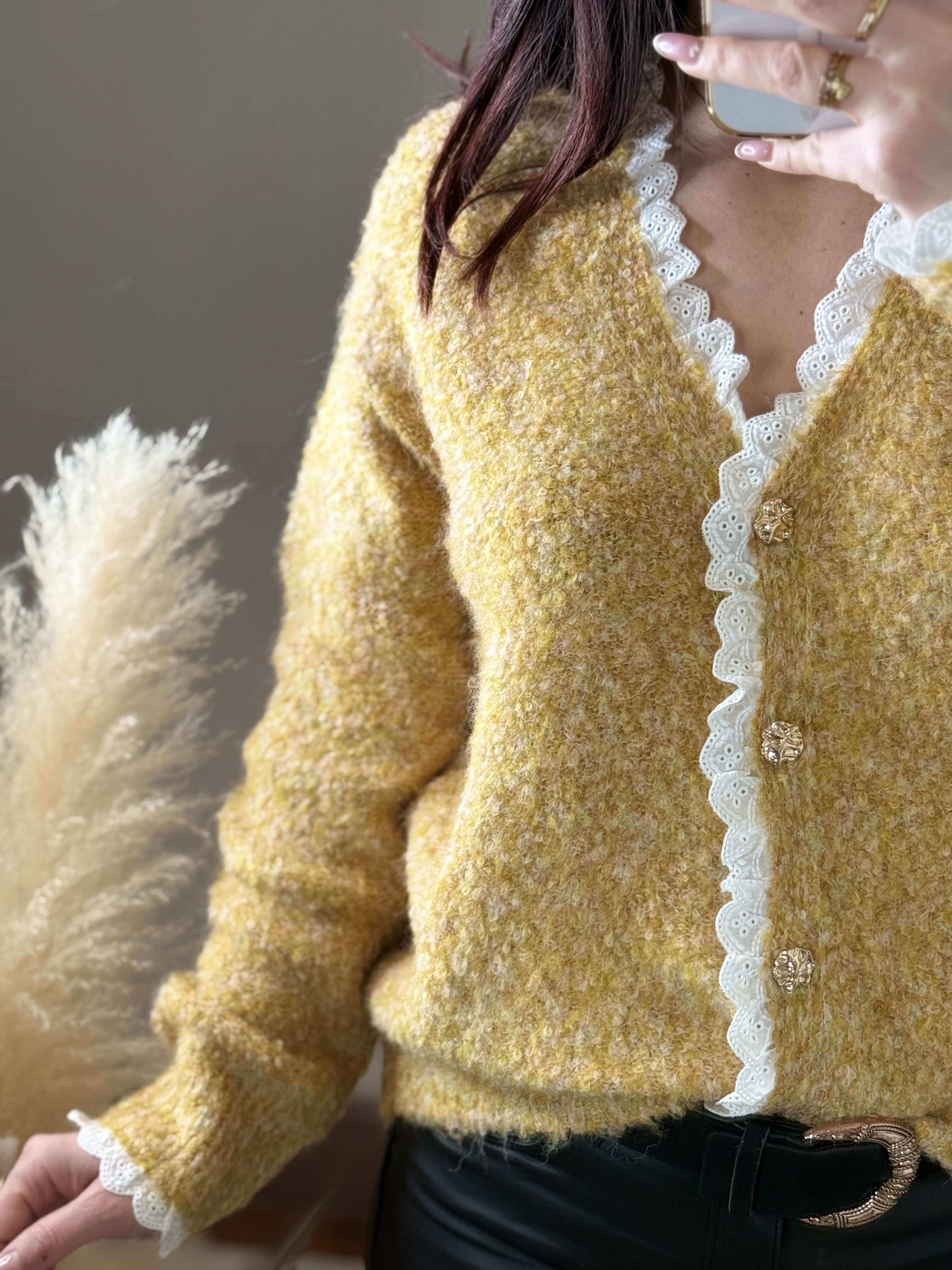 Le gilet Clémence séduit par son allure délicate et raffinée. Sa maille écrue, douce et lumineuse, est sublimée par de jolis détails en dentelle fine le long de l’encolure, de la patte de boutonnage et des poignets, qui apportent une touche féminine et élégante.