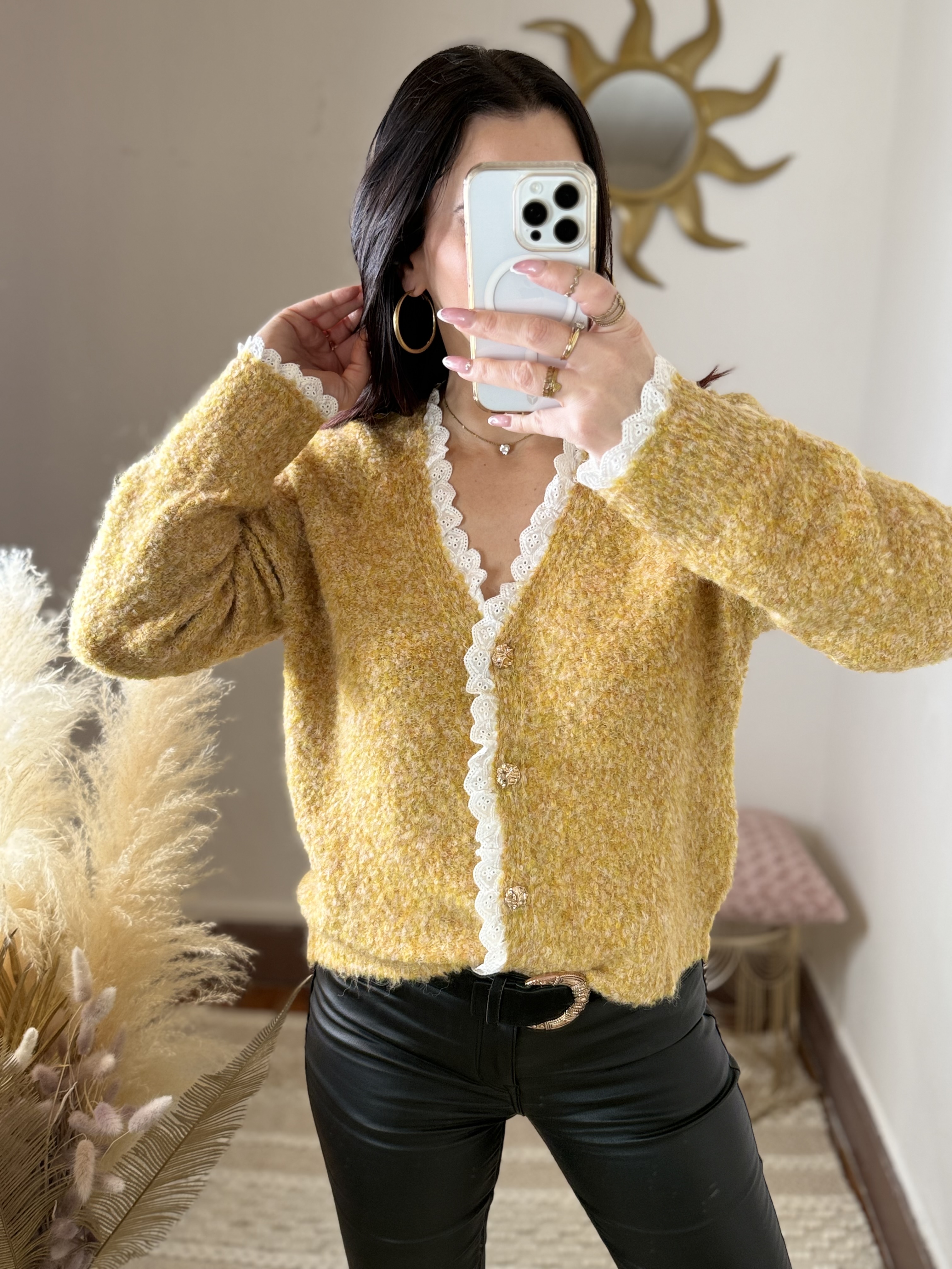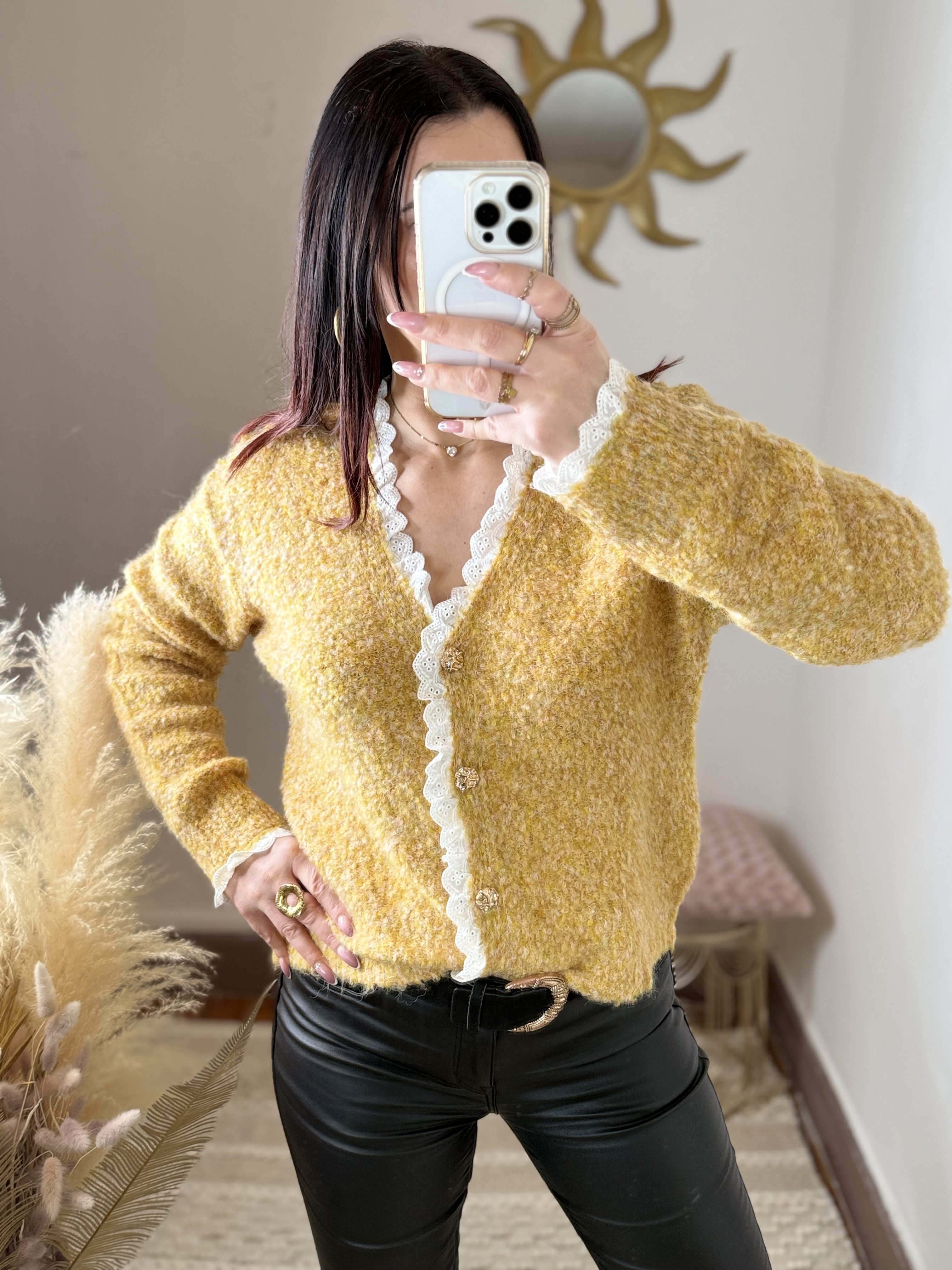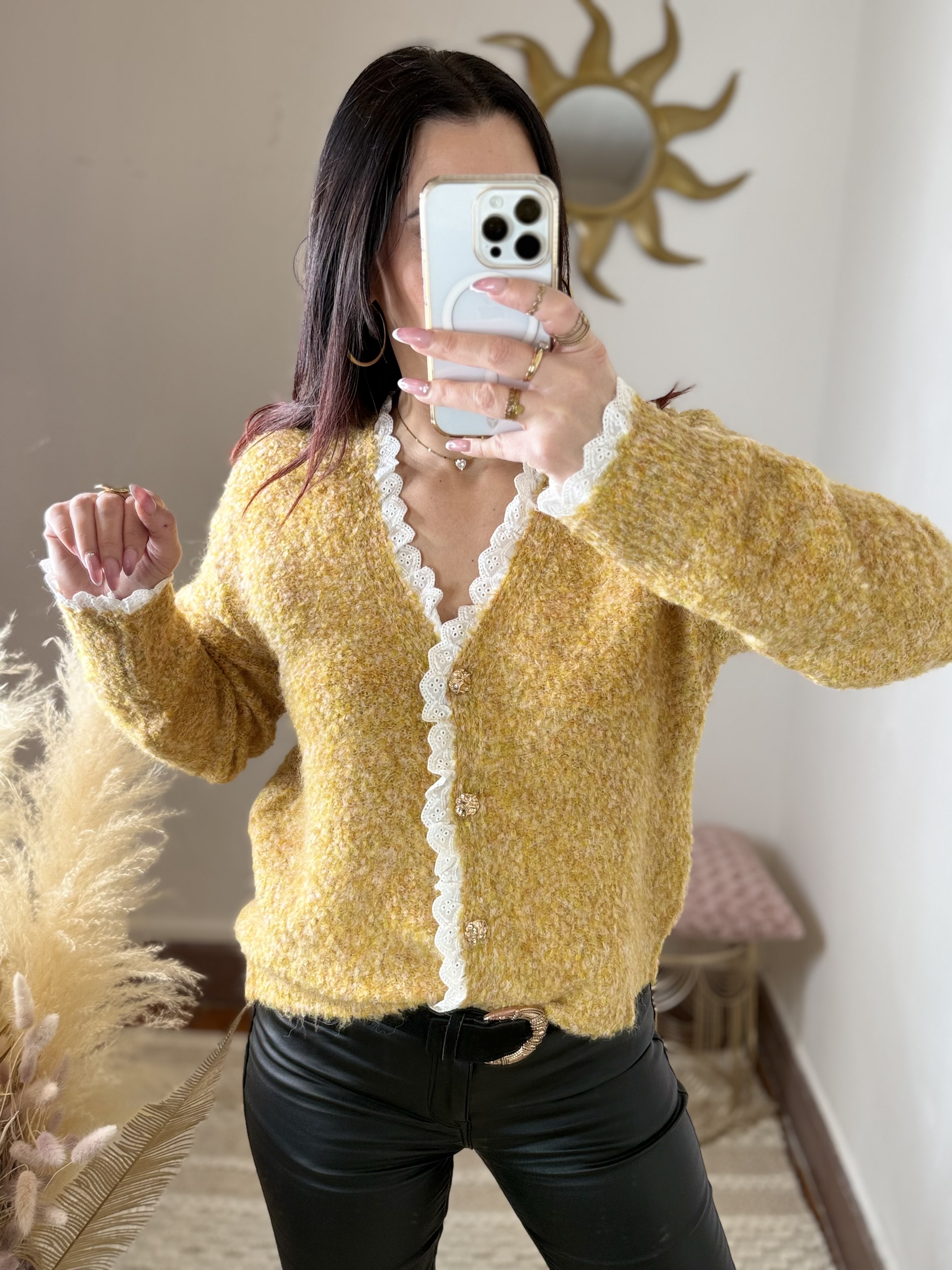 Le gilet Clémence séduit par son allure délicate et raffinée. Sa maille écrue, douce et lumineuse, est sublimée par de jolis détails en dentelle fine le long de l’encolure, de la patte de boutonnage et des poignets, qui apportent une touche féminine et élégante.