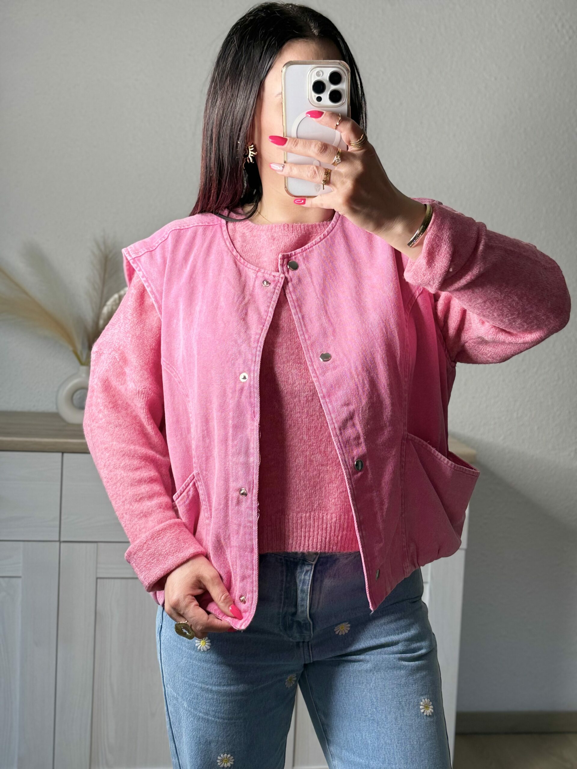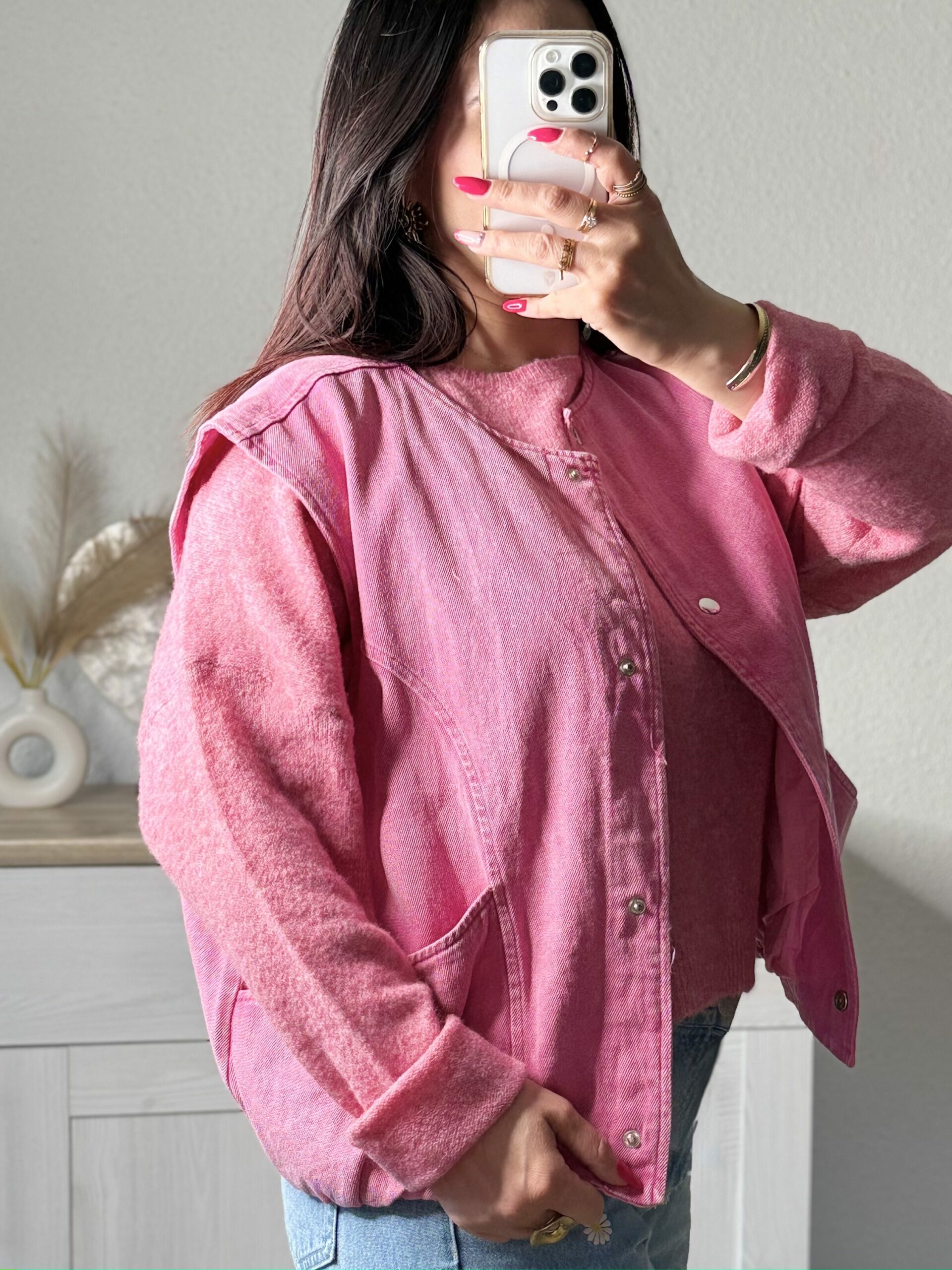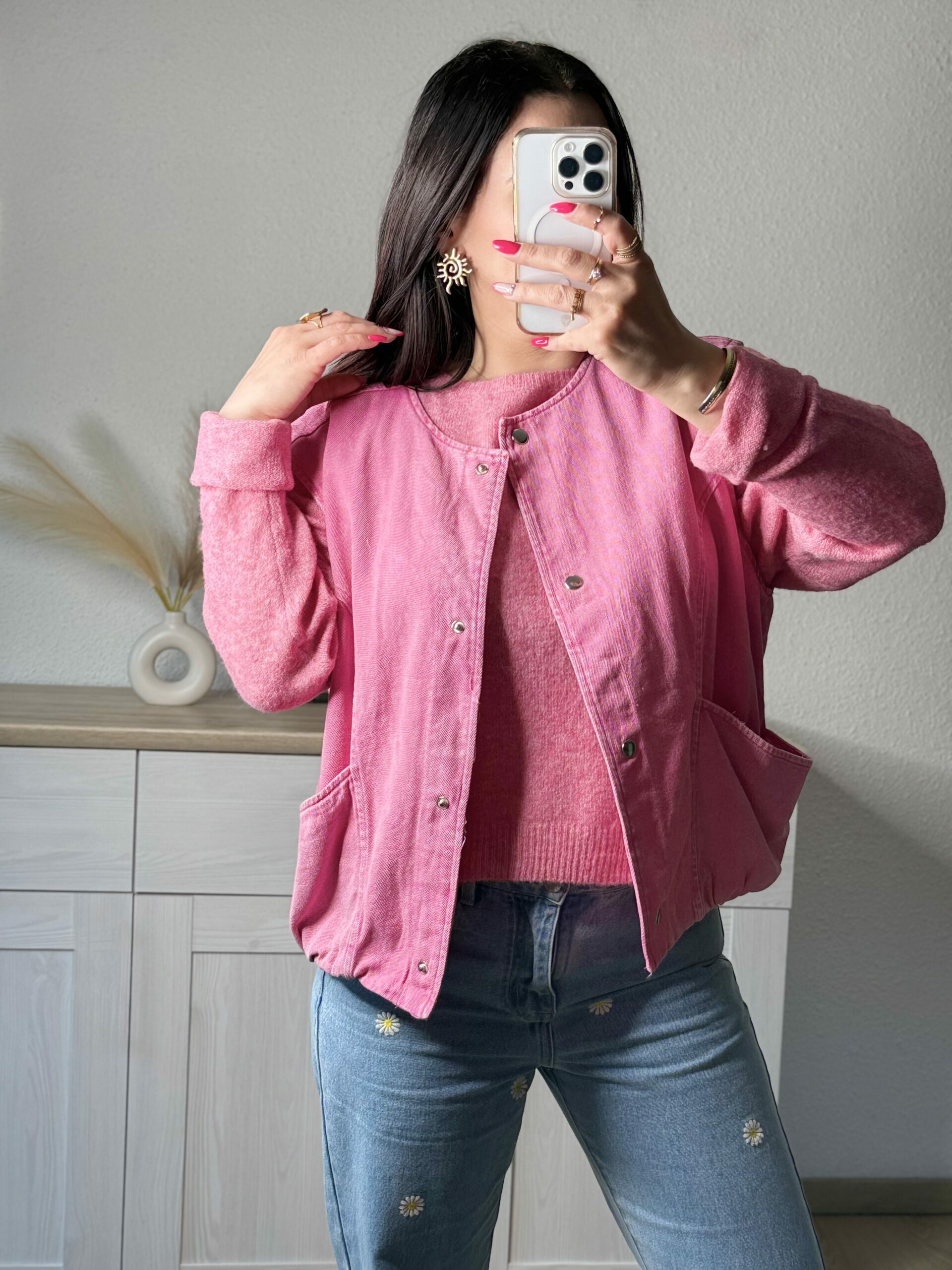 Confectionné en denim 100% coton, il séduit par sa teinte rose intense légÚrement délavée qui lui donne un effet vintage moderne. Sa coupe structurée, ses découpes travaillées et sa base subtilement resserrée créent une silhouette féminine tout en gardant une touche casual assumée.