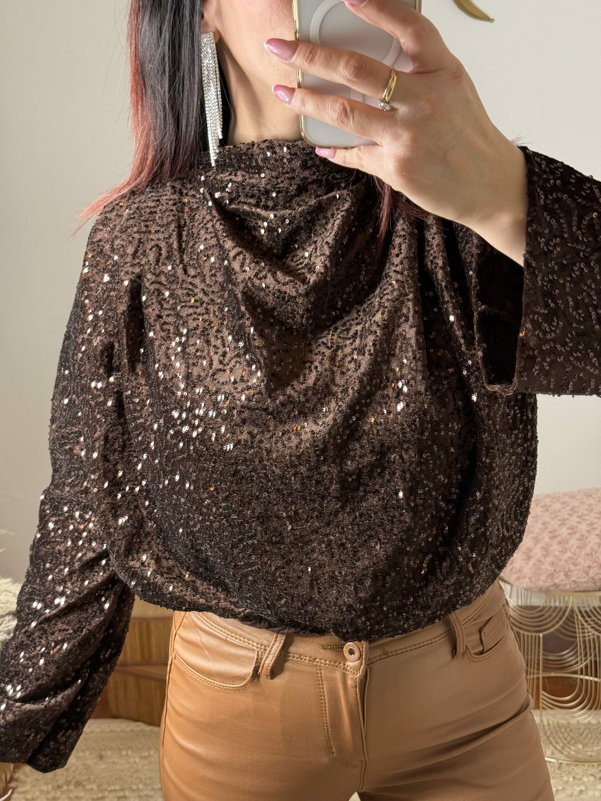Le haut Milena est la piÚce parfaite pour illuminer vos soirées. EntiÚrement recouvert de sequins Choco scintillants, il offre un rendu glamour tout en restant confortable grùce à sa coupe légÚrement loose.