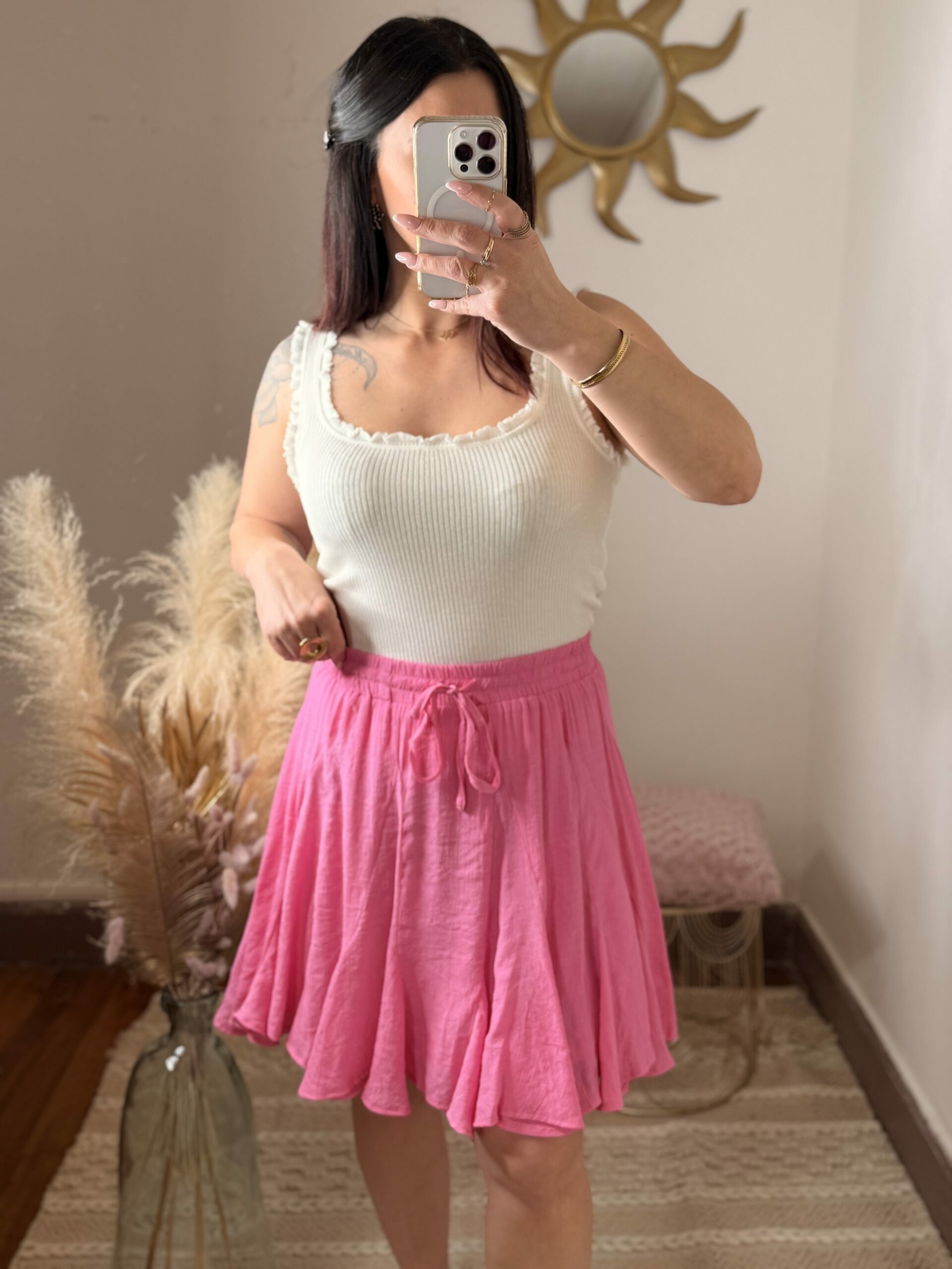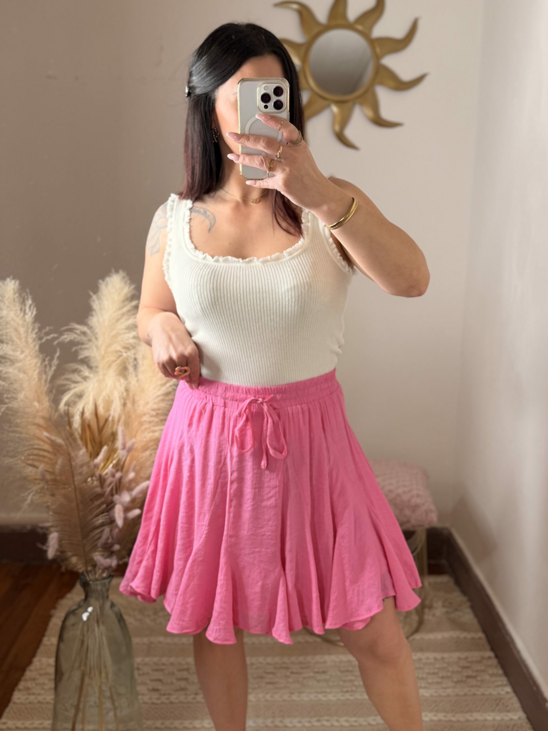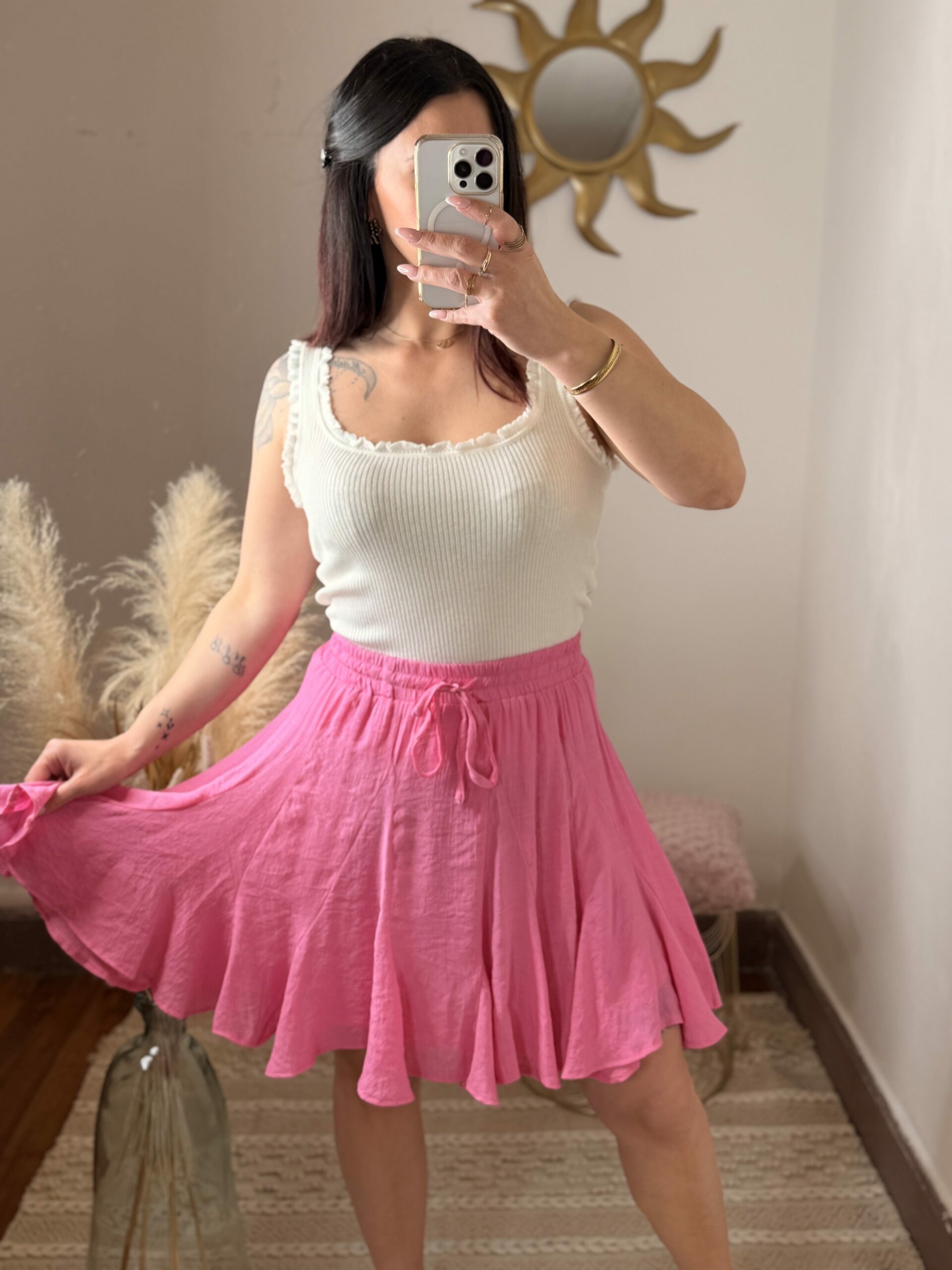 La jupe Aélina est la pièce parfaite pour apporter de la fraîcheur et du mouvement à ton dressing. Avec son rose vibrant, elle attire le regard tout en restant élégante et facile à porter.