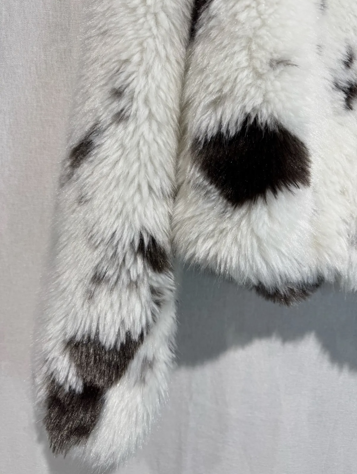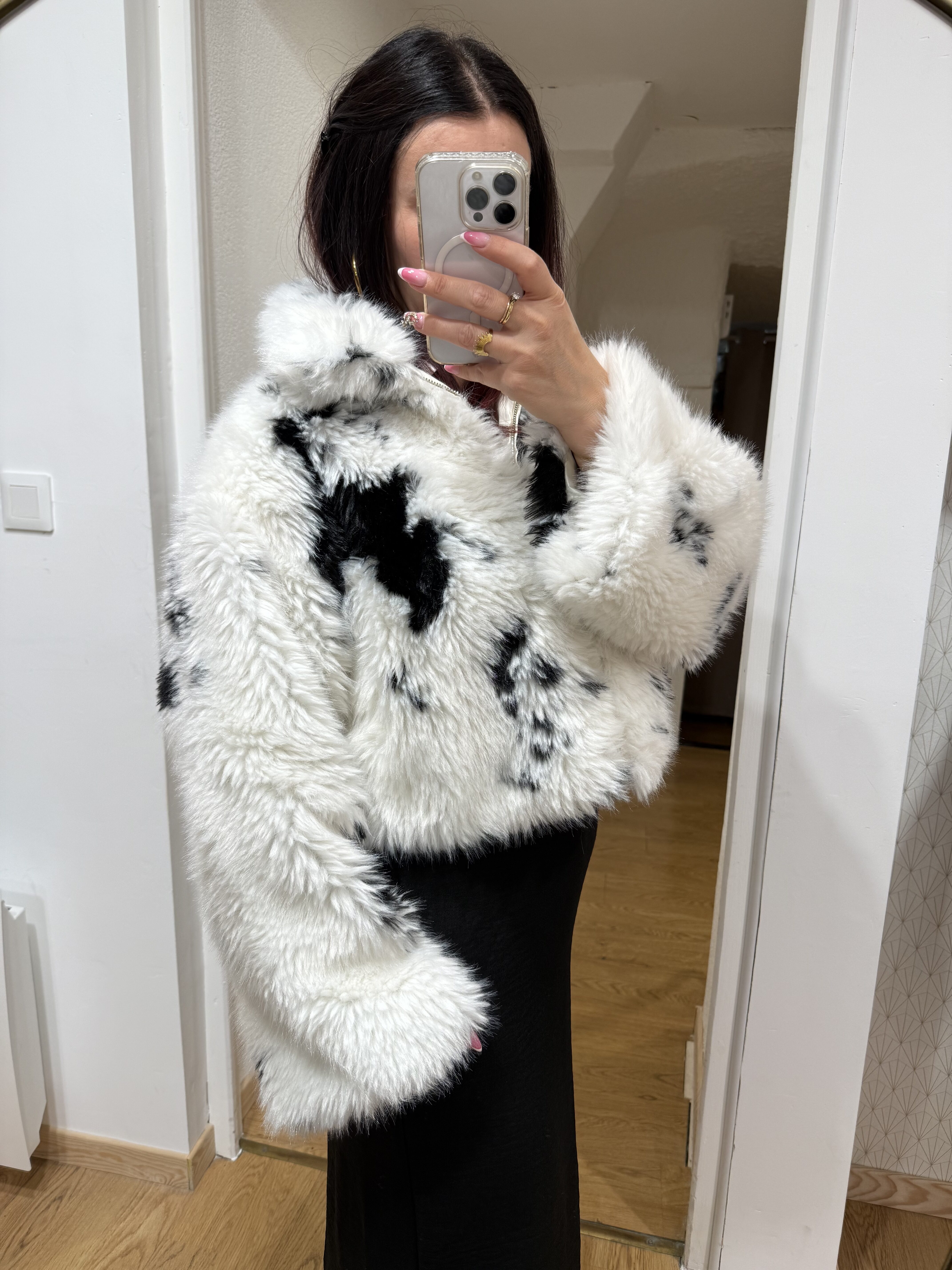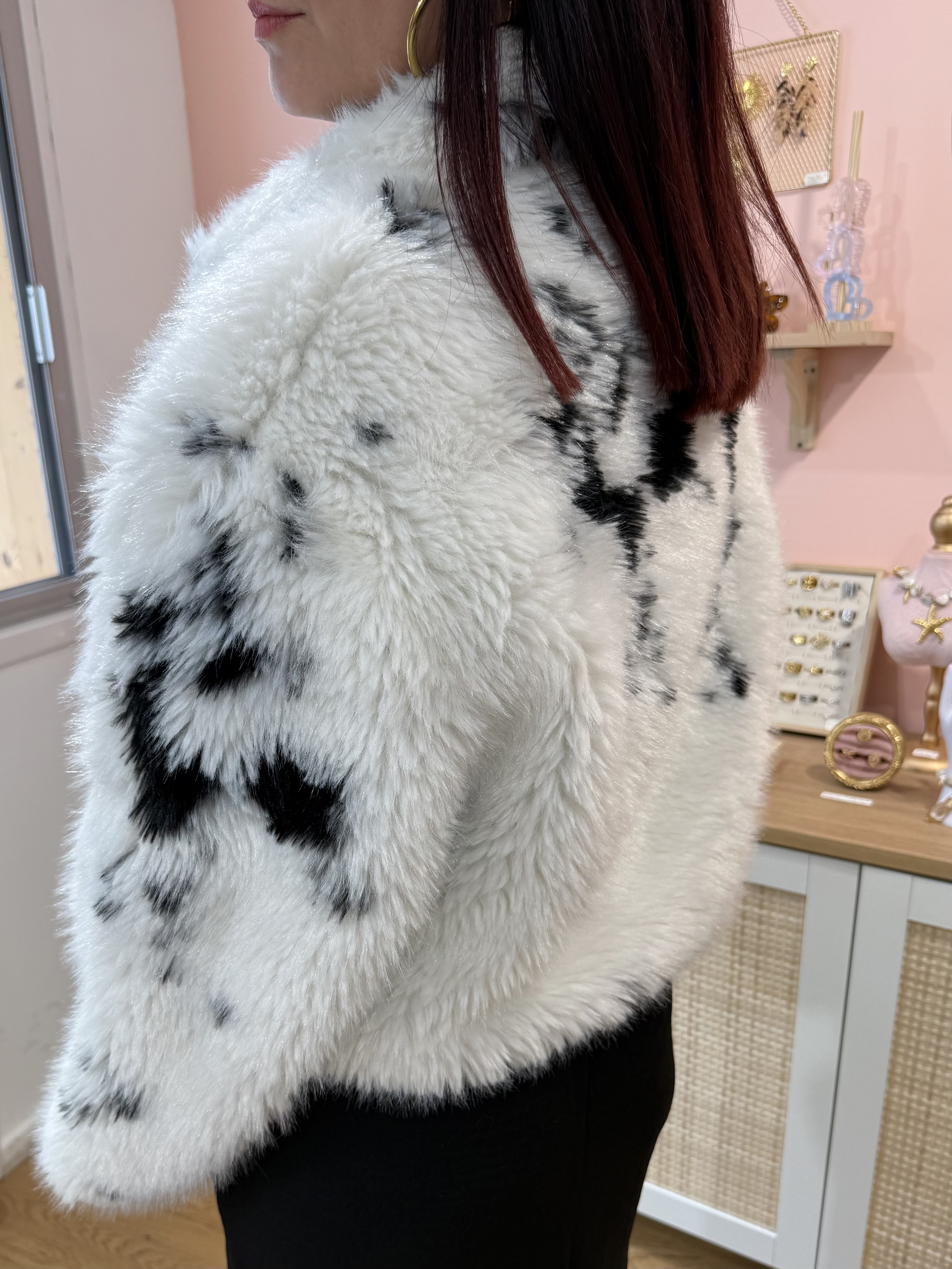 Le manteau Elena impose son style avec élégance et originalité. Confectionné dans une fausse fourrure ultra-douce, il séduit par son jeu de contrastes : une base blanche éclatante rehaussée de taches noires graphiques qui lui donnent un caractÚre unique et sophistiqué.
