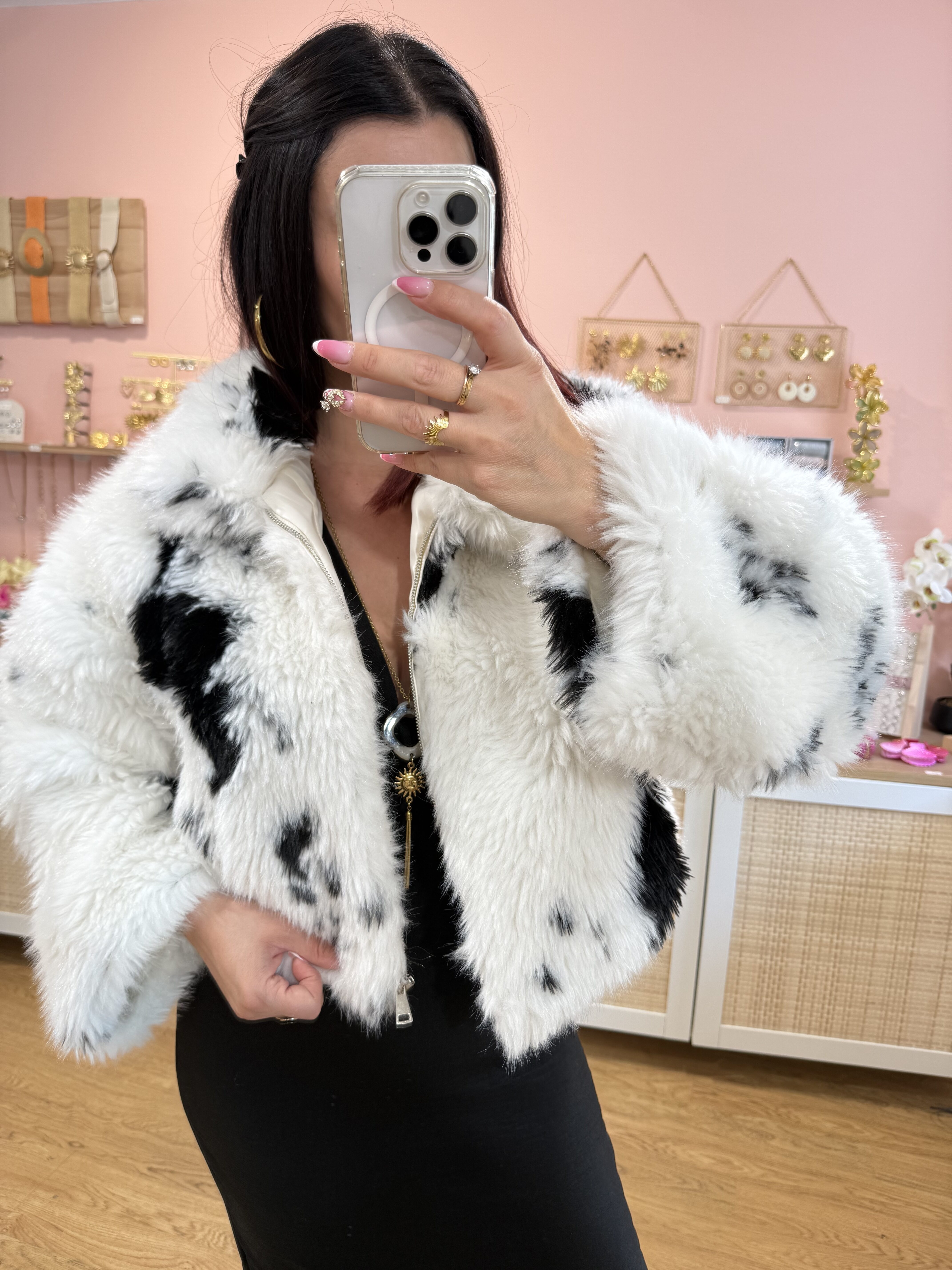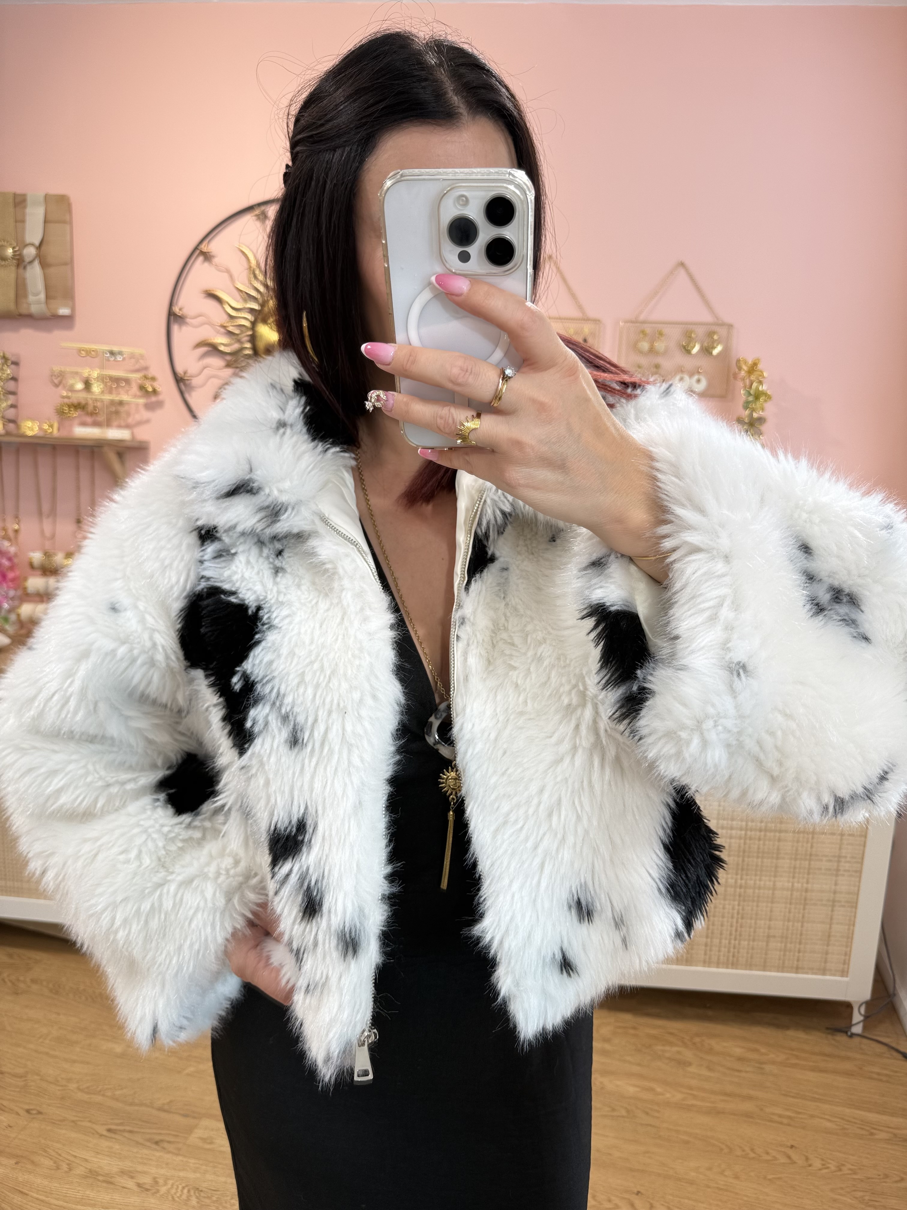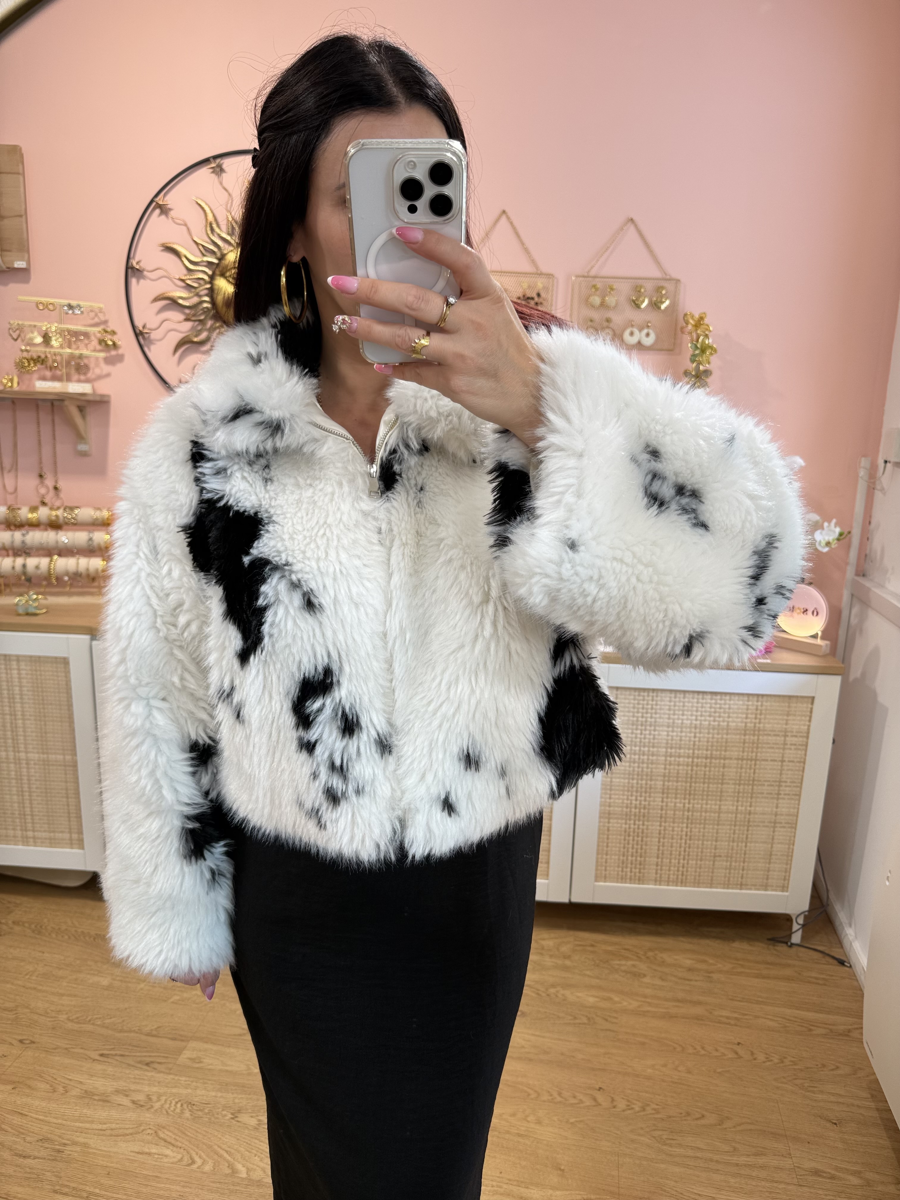 Le manteau Elena impose son style avec élégance et originalité. Confectionné dans une fausse fourrure ultra-douce, il séduit par son jeu de contrastes : une base blanche éclatante rehaussée de taches noires graphiques qui lui donnent un caractÚre unique et sophistiqué.