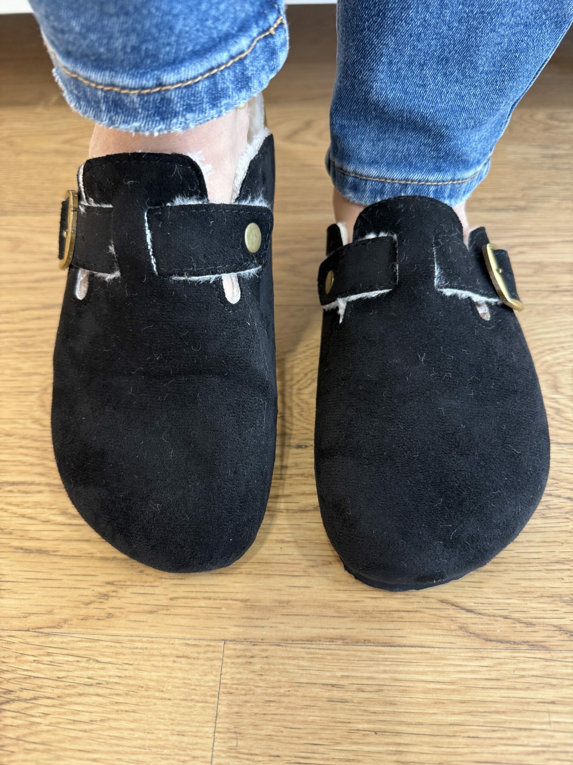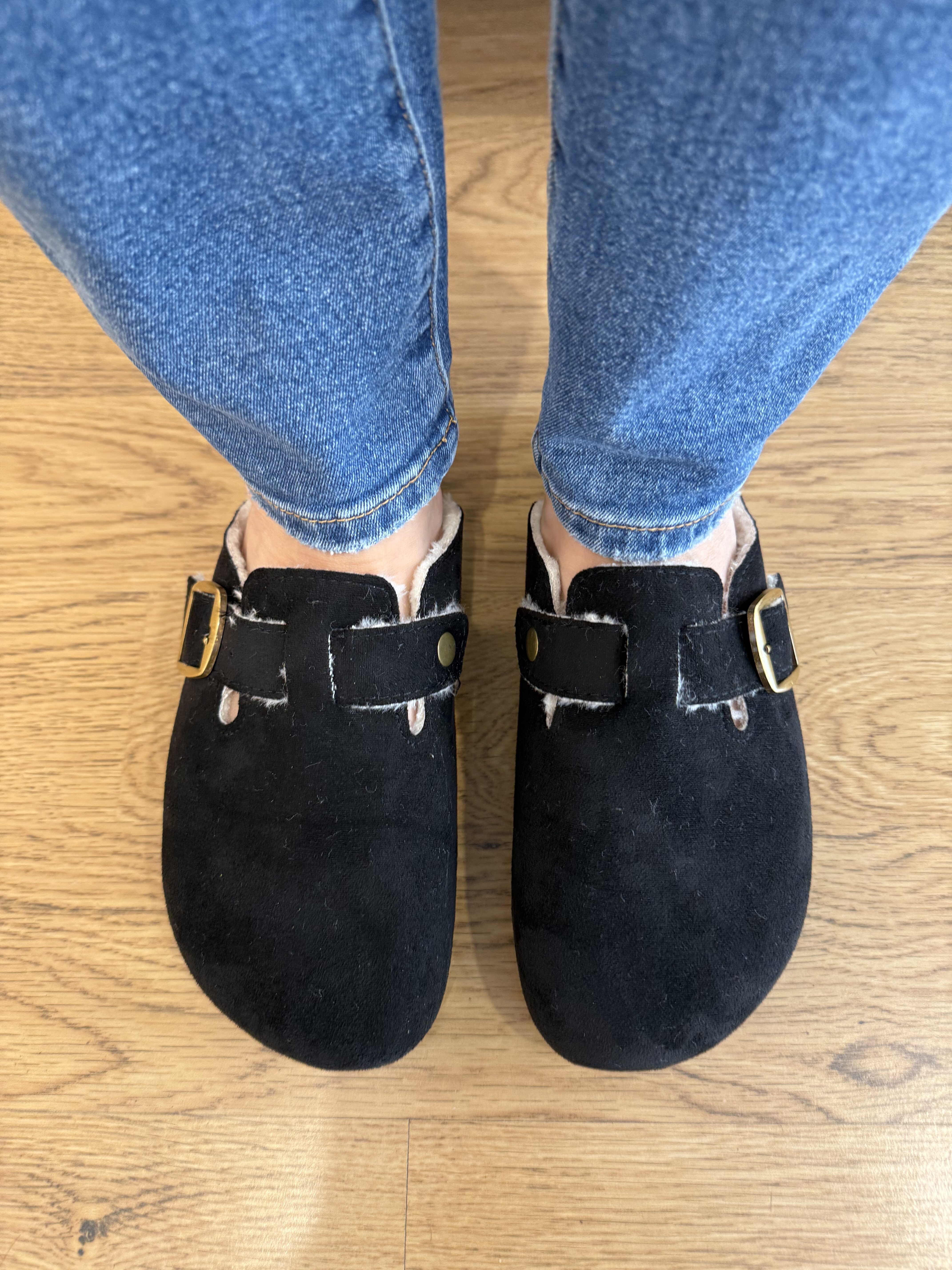 Ces mules en suédine noire associent confort et style avec leur intérieur doublé en fausse fourrure ultra douce. Leur design à boucle métallique dorée apporte une touche chic et tendance, tandis que leur semelle ergonomique garantit un bon maintien au quotidien.