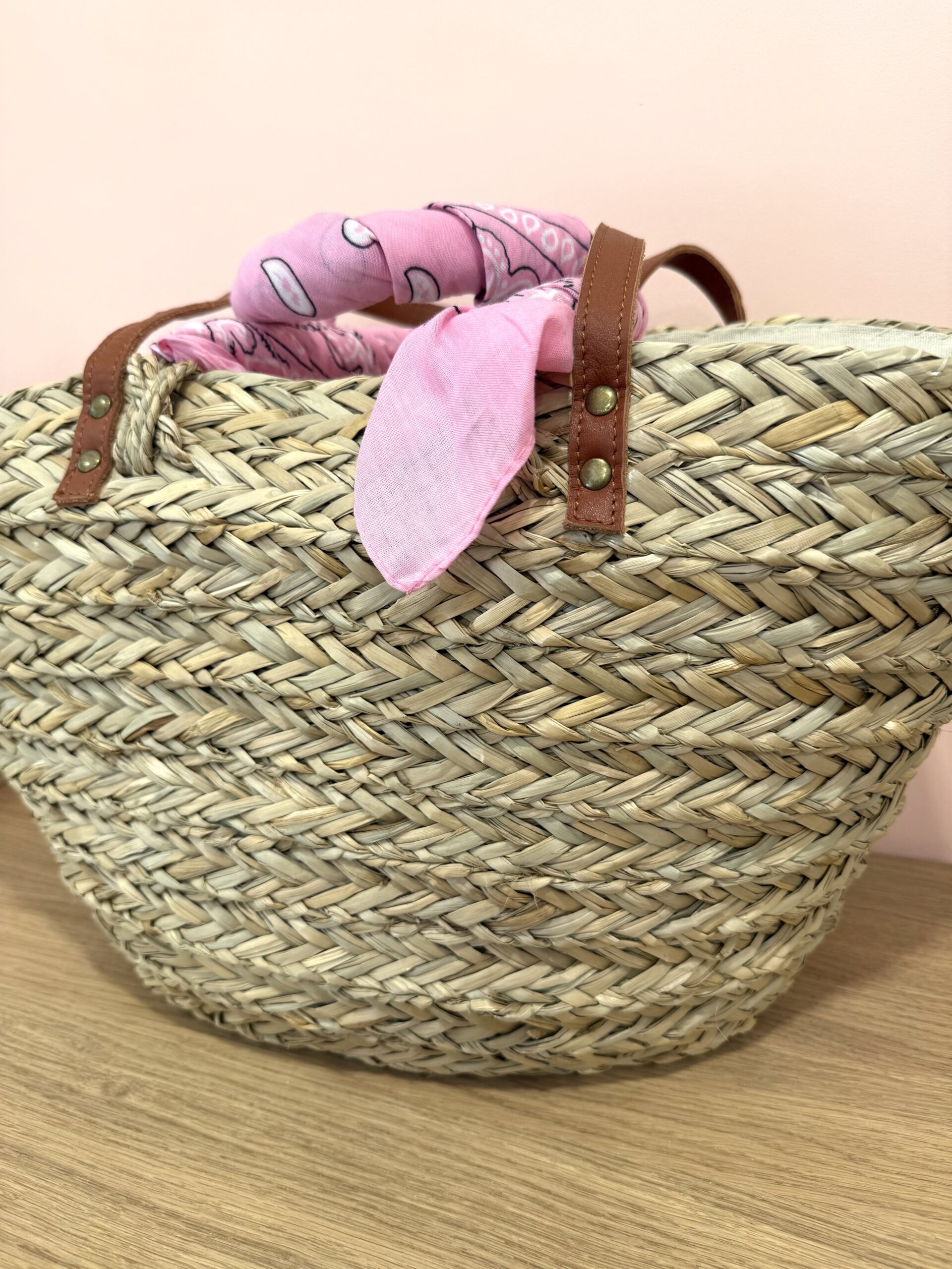 Panier en paille tressée avec anses foulard – Modèle “Capucine”