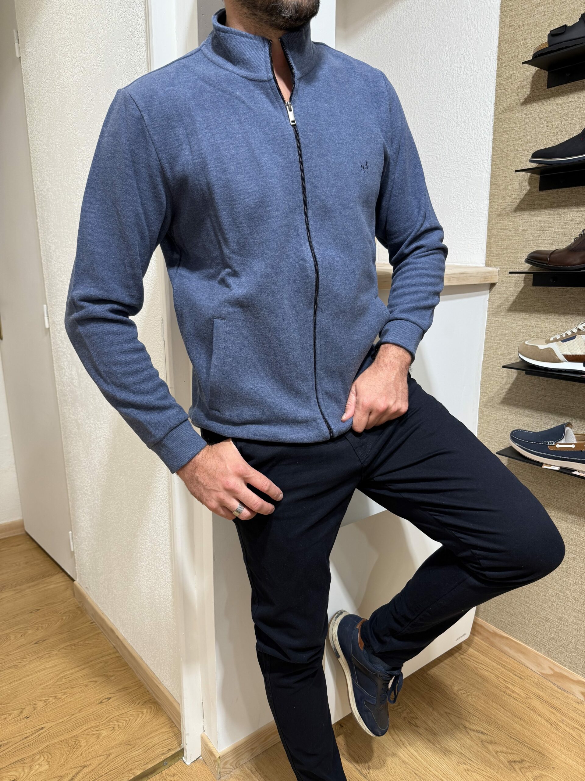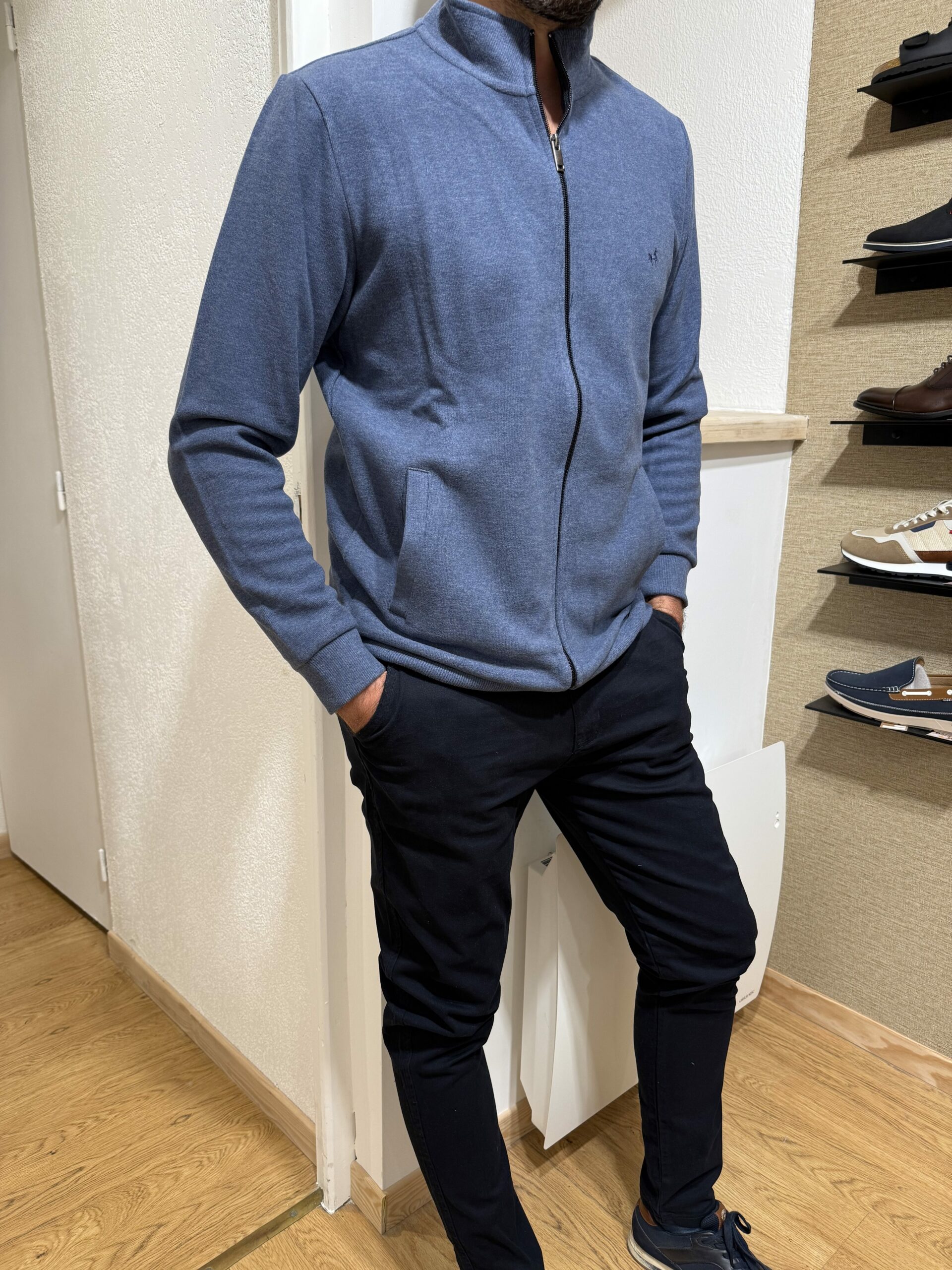 Ses détails soignés, comme les poches stylisées et les petites touches tricolores, lui confèrent une allure moderne et originale. Idéal aussi bien pour une tenue de tous les jours que pour un style plus habillé avec une chemise ou un polo.