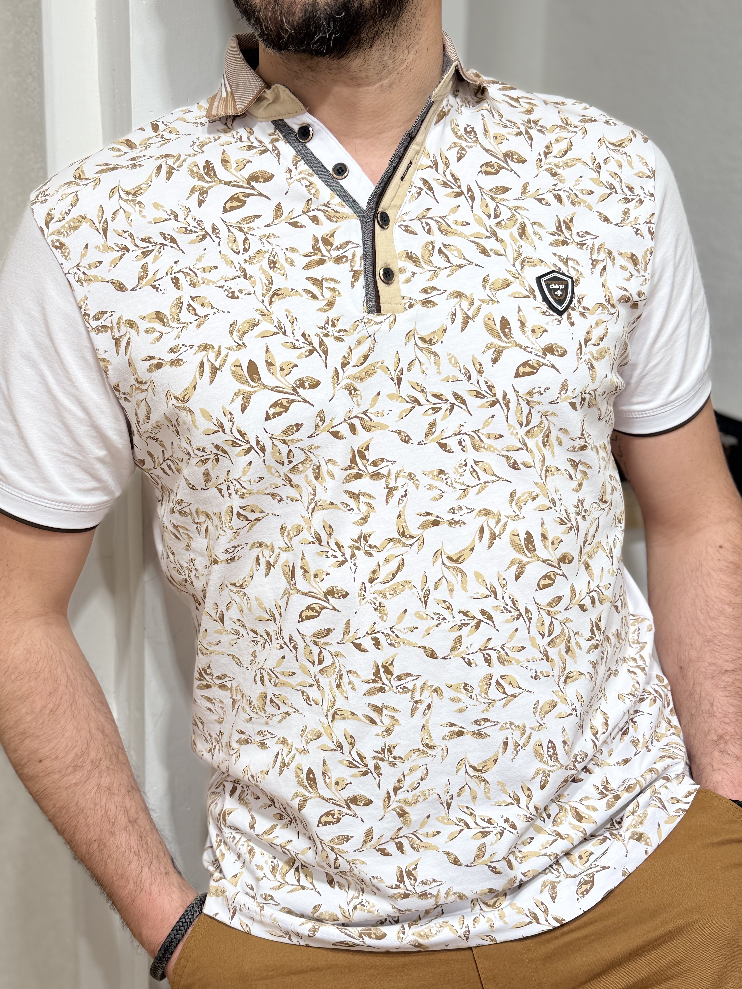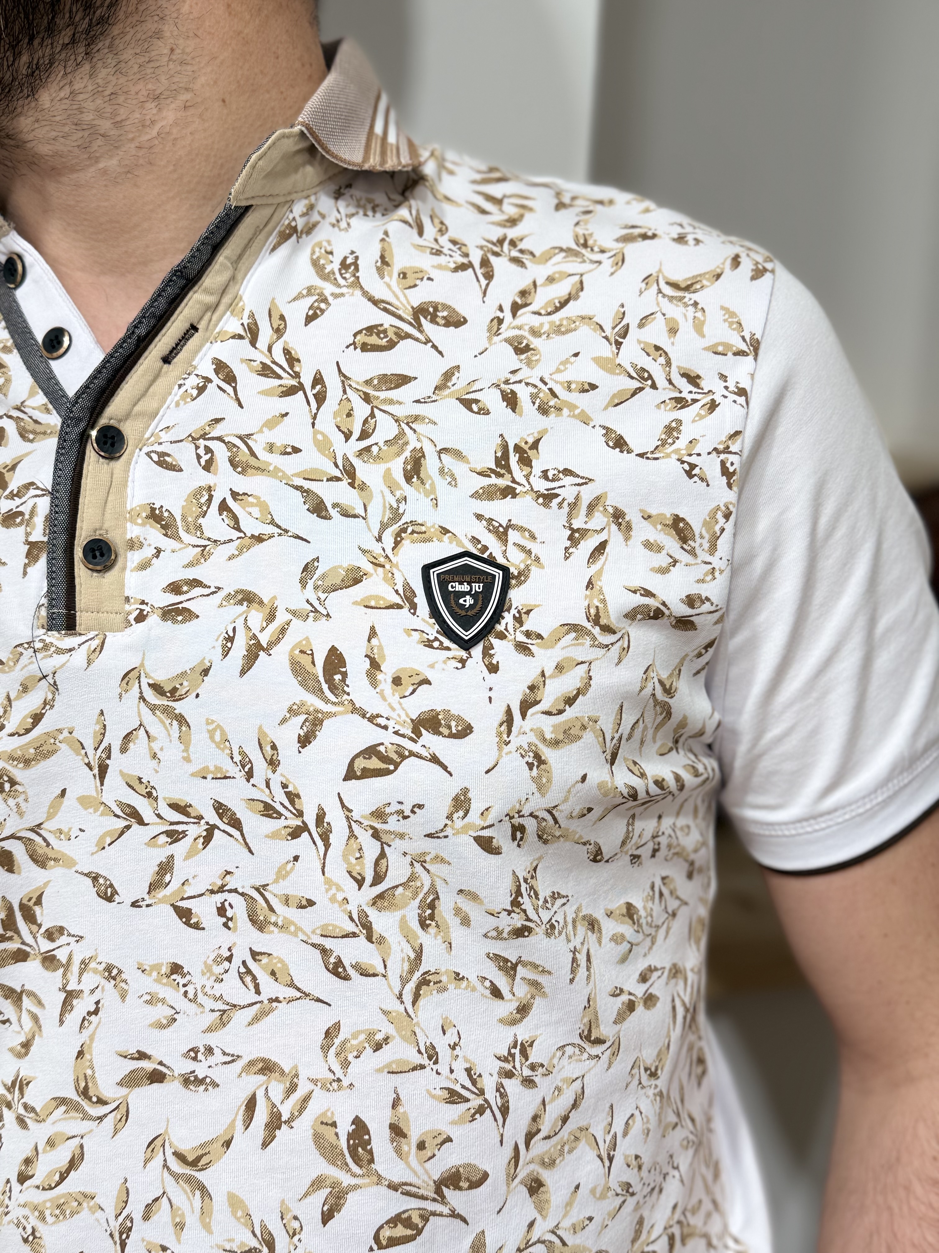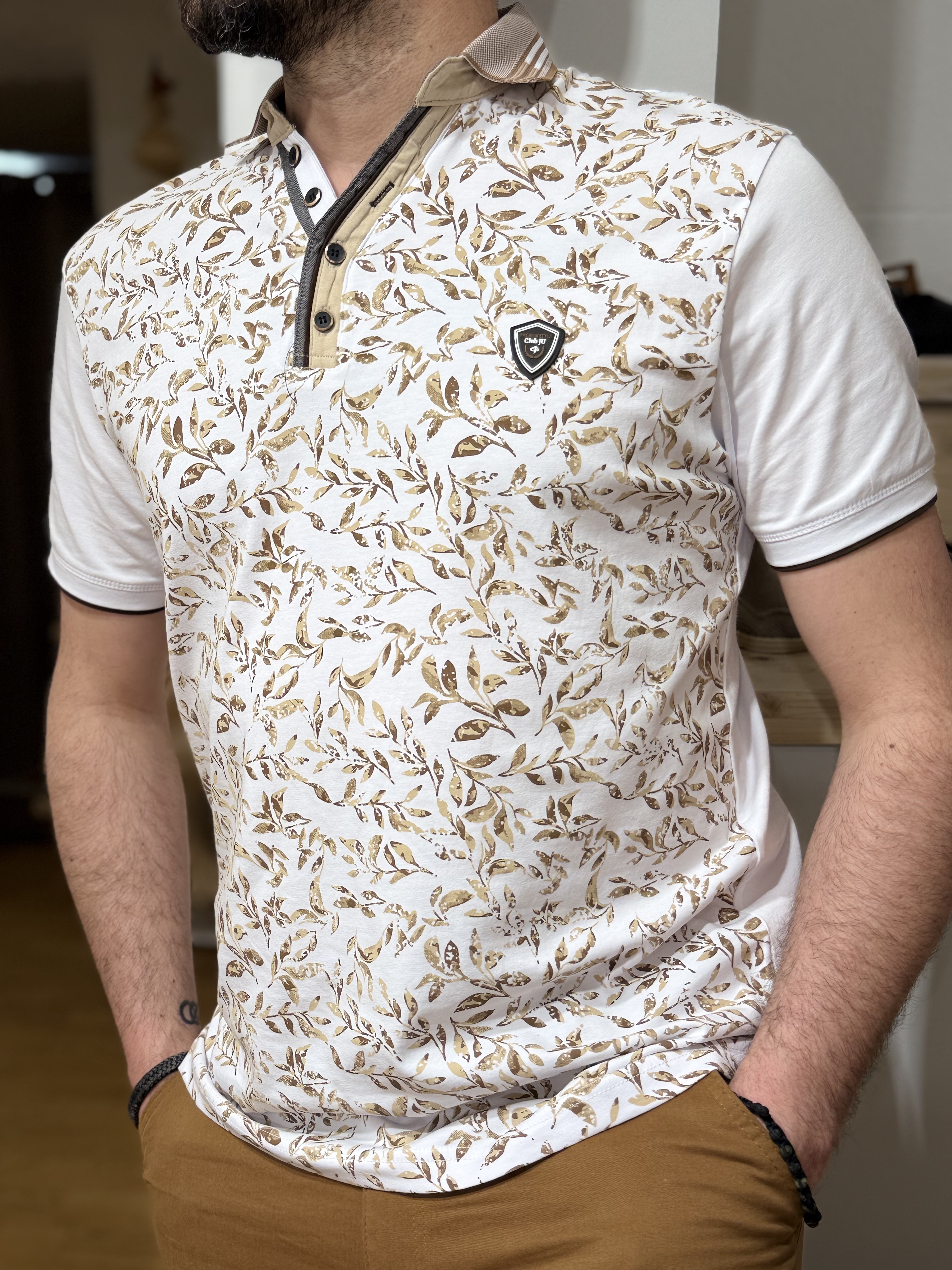 Son imprimé feuillage beige sur fond blanc apporte une touche naturelle et élégante, subtilement travaillée pour un rendu moderne et lumineux.
