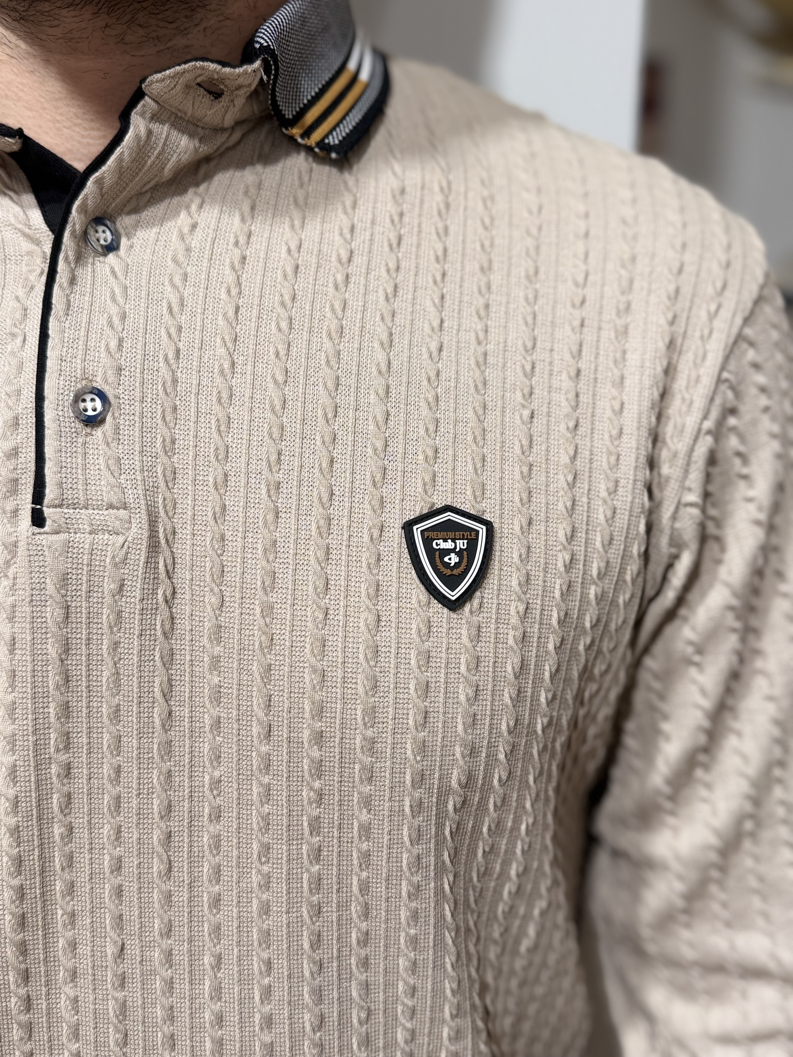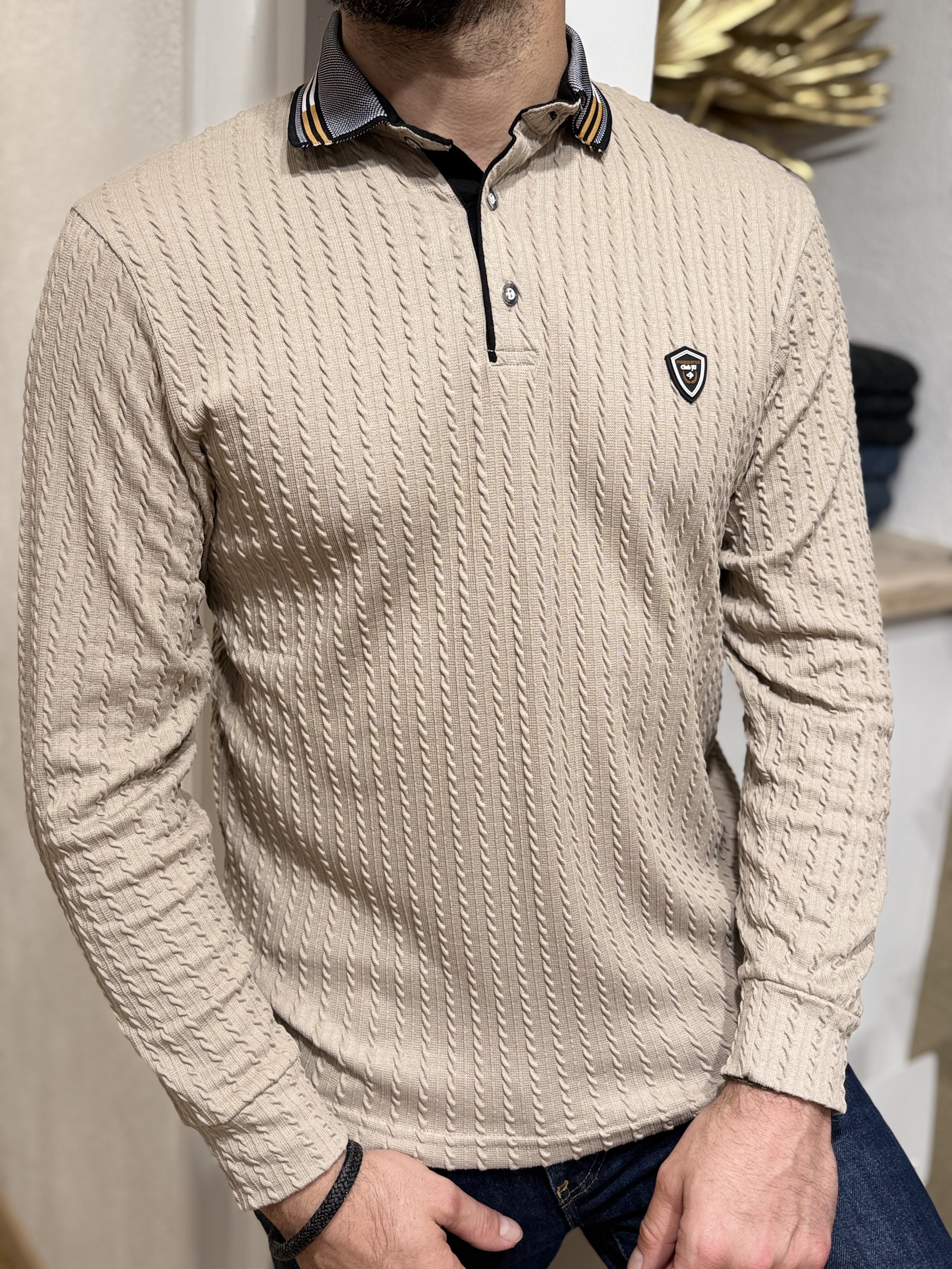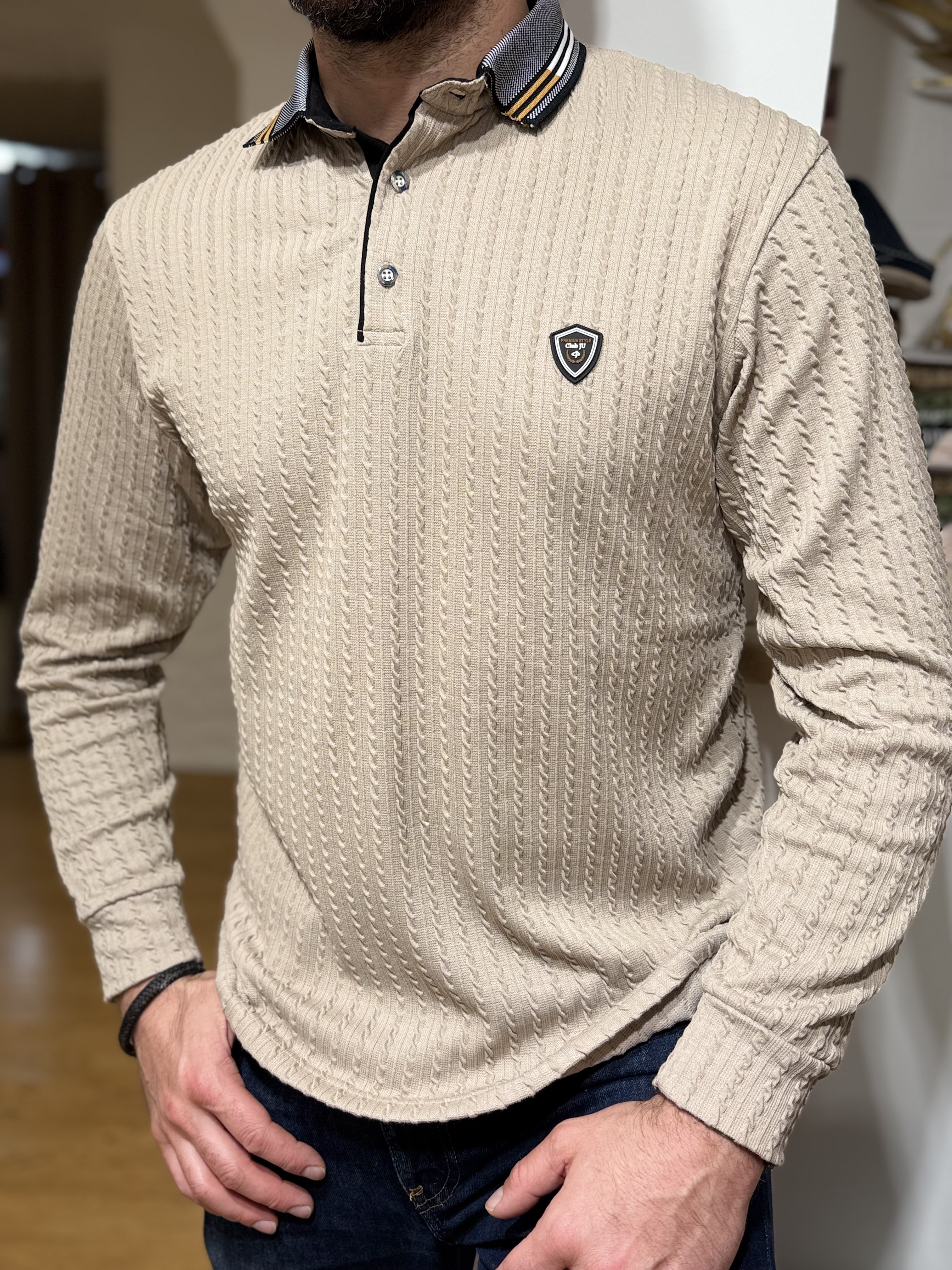 Ce polo beige à manches longues allie élégance et originalité grâce à sa maille torsadée en relief, à la fois douce et structurée.