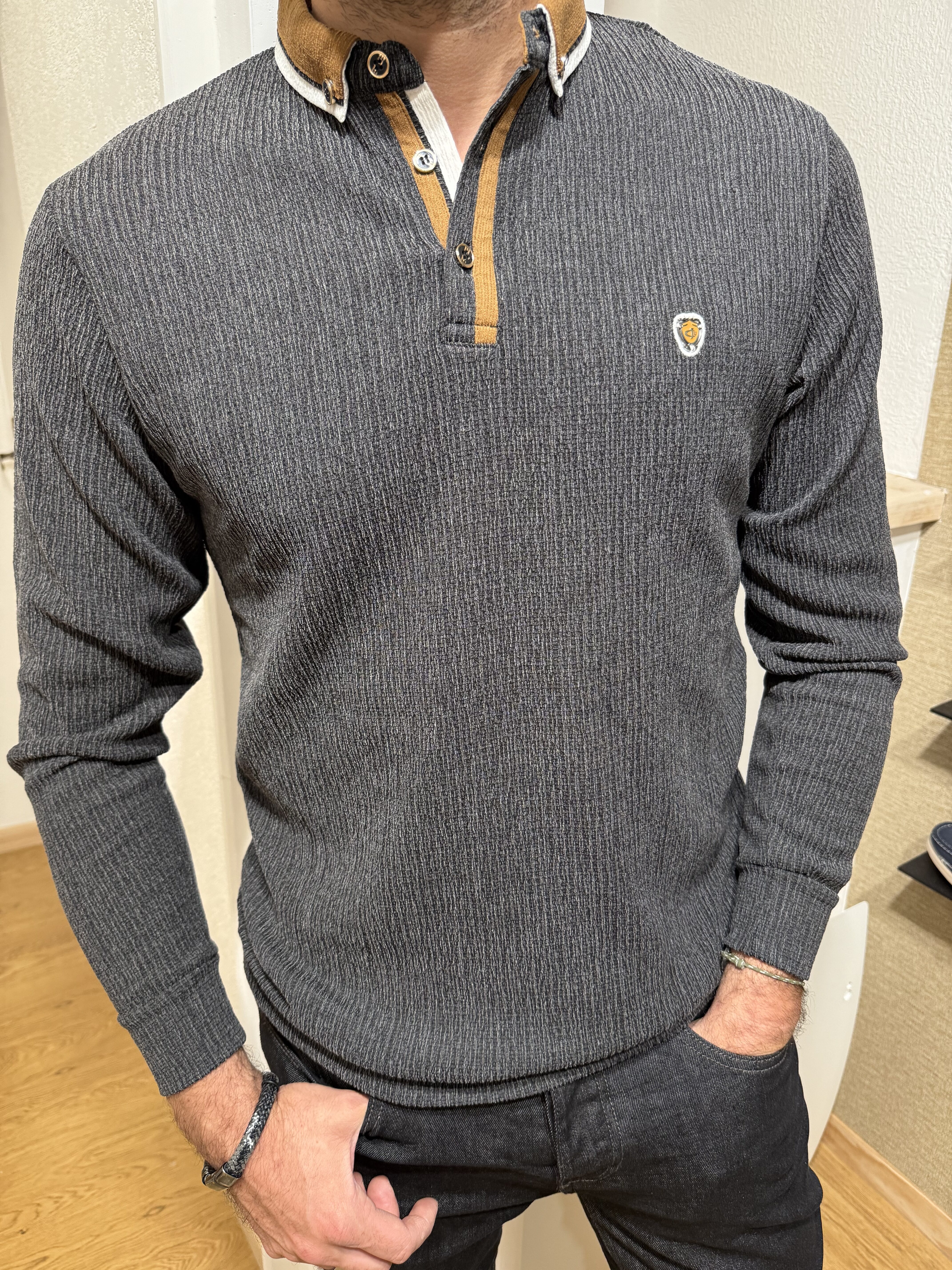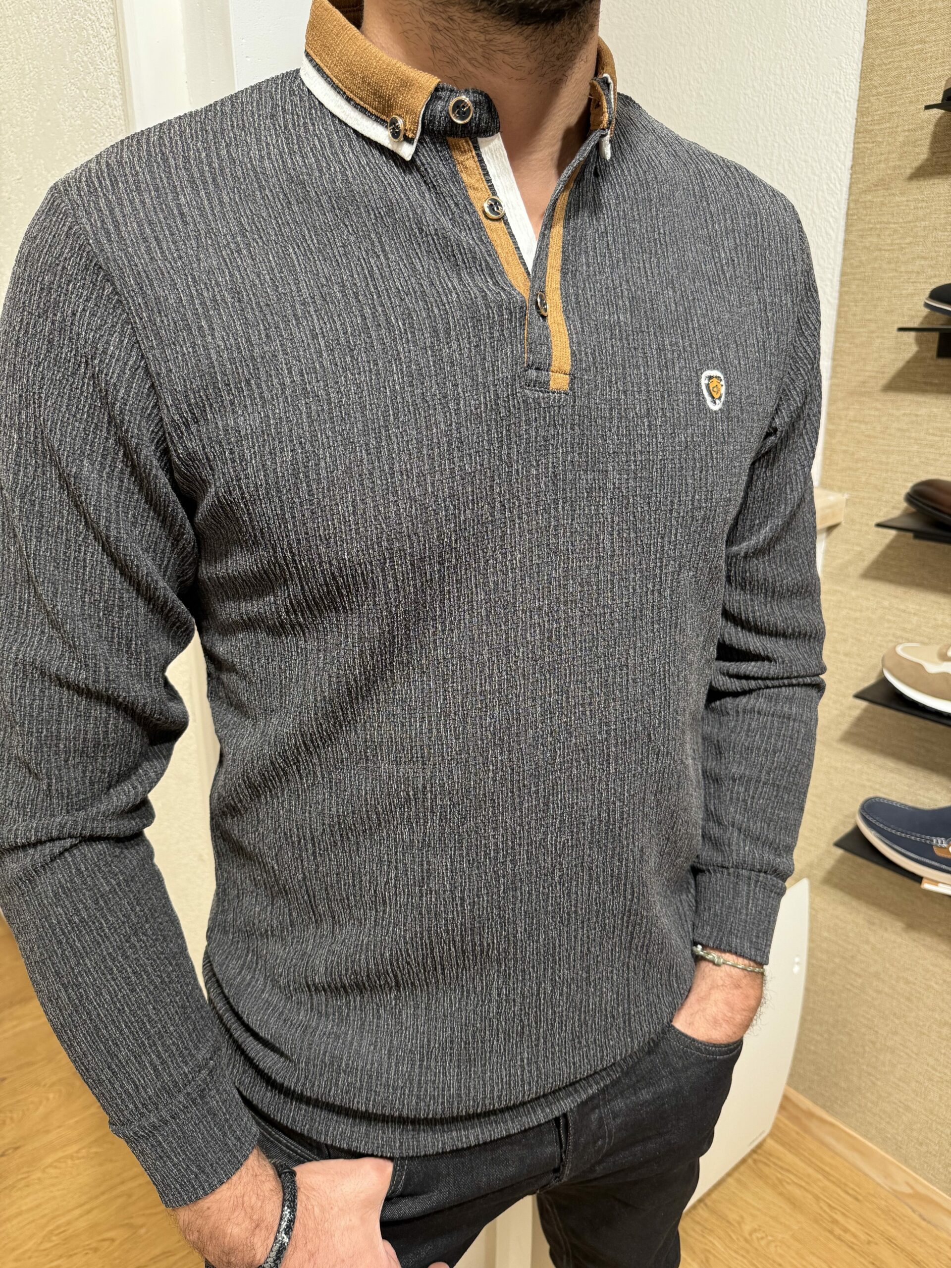 Ce polo manches longues revisite le style casual chic avec sa matière texturée gris chiné et ses détails contrastants camel au col et à la patte de boutonnage. Élégant et confortable, il se distingue par son col raffiné et son écusson poitrine discret.