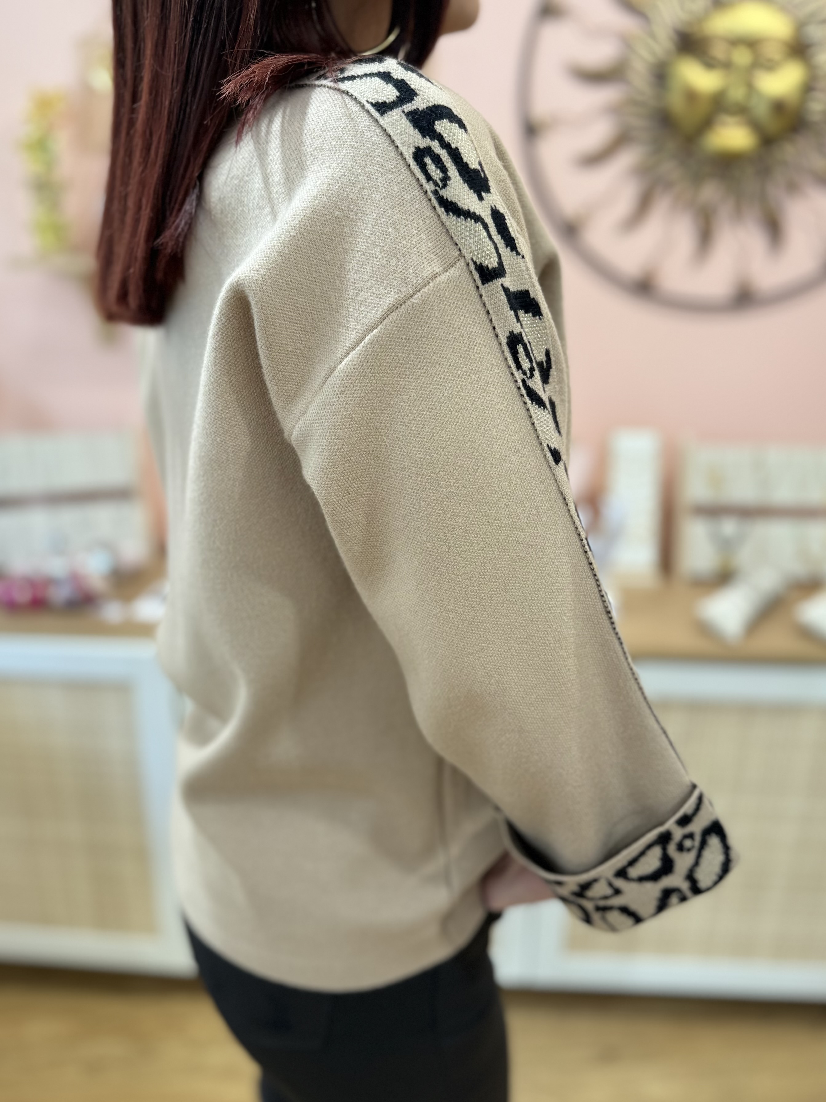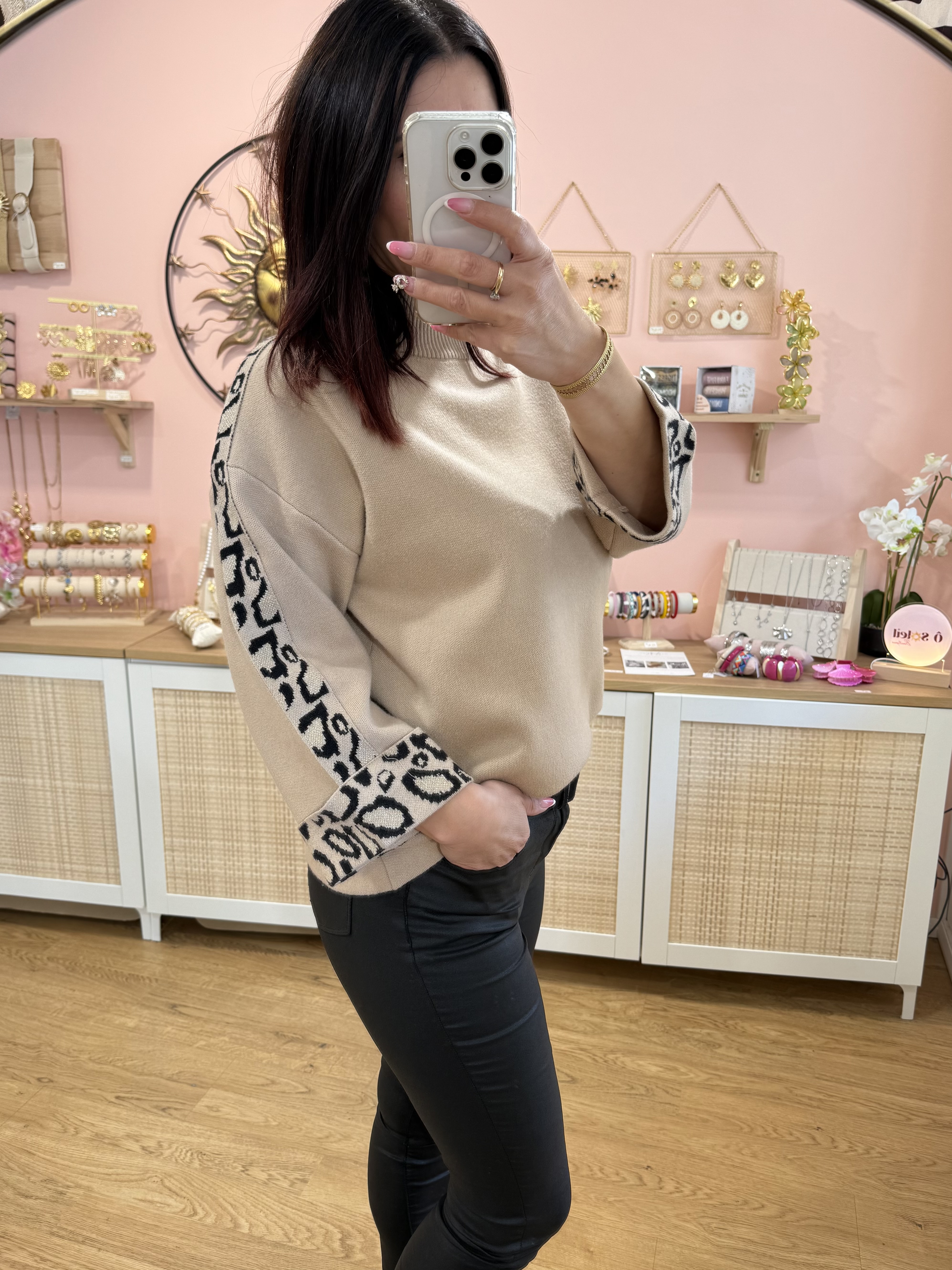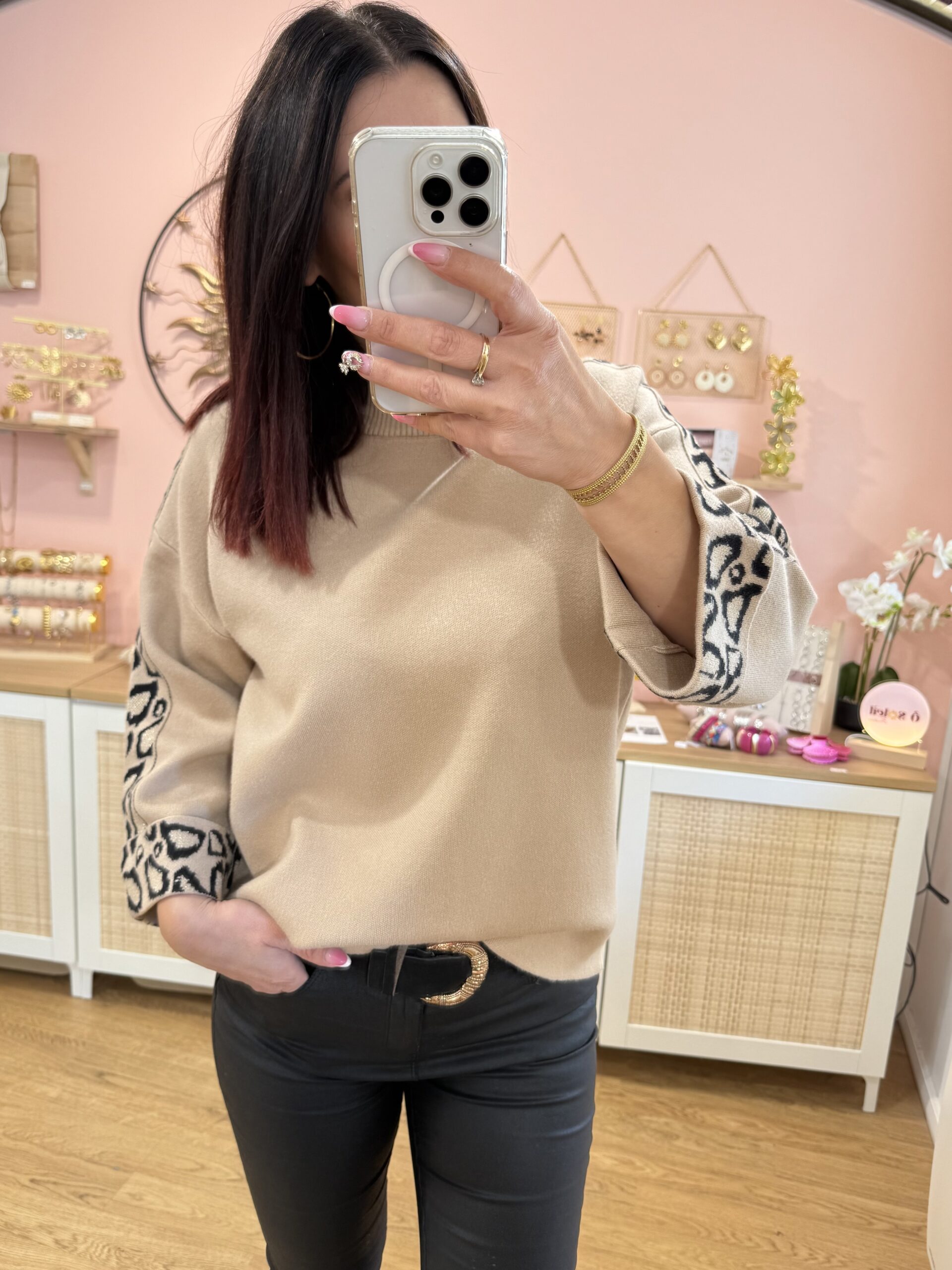 Élégant et confortable, le pull Alya se distingue par sa coupe tendance et ses détails raffinés. Confectionné dans une maille douce, il présente des manches 3/4 droites soulignées par une bande imprimée léopard qui apporte une touche sauvage et moderne à votre tenue. Son col rond et sa coupe légèrement ample en font une pièce facile à porter au quotidien, aussi bien avec un jean qu’avec une jupe ou un pantalon plus habillé.