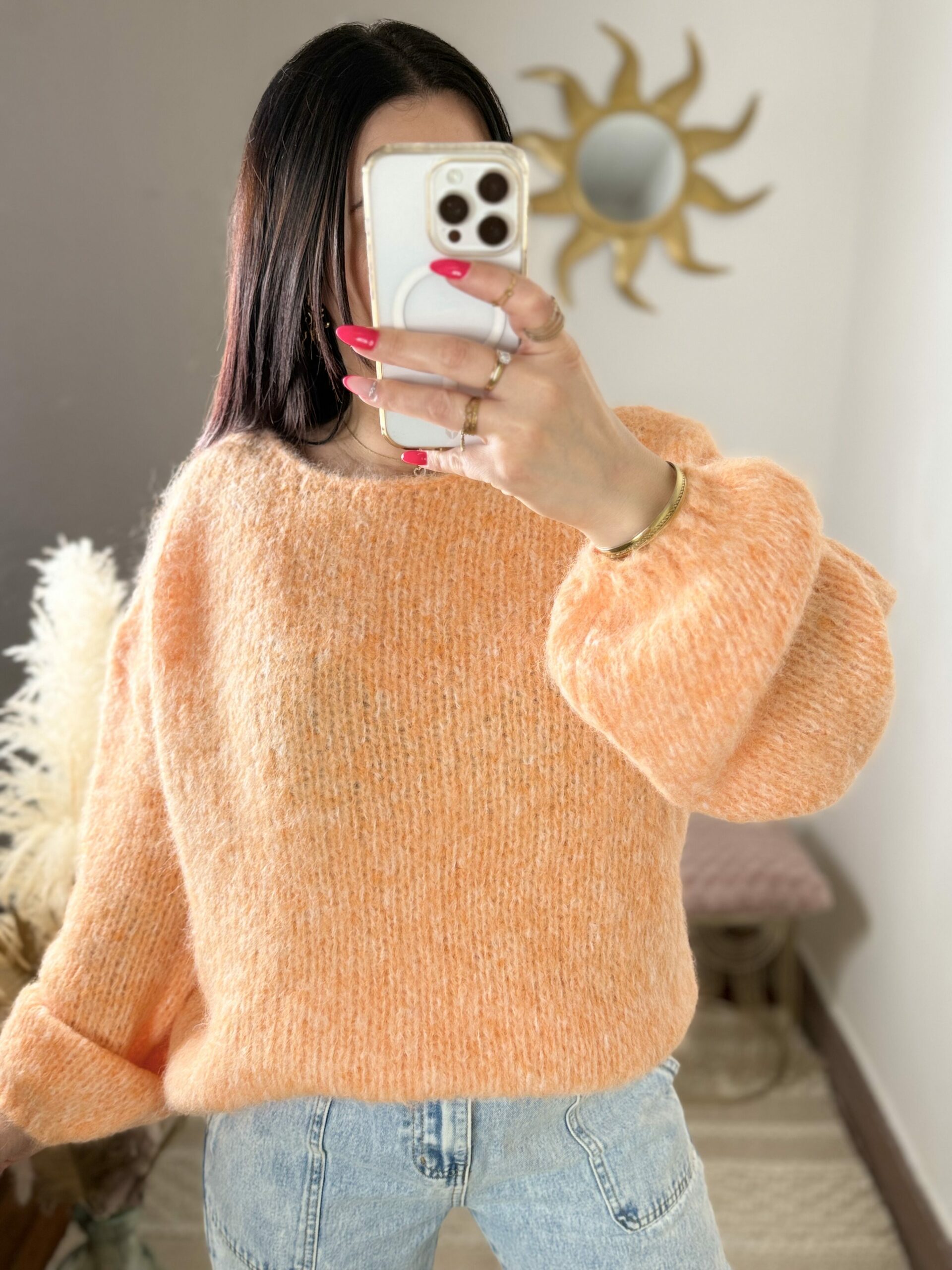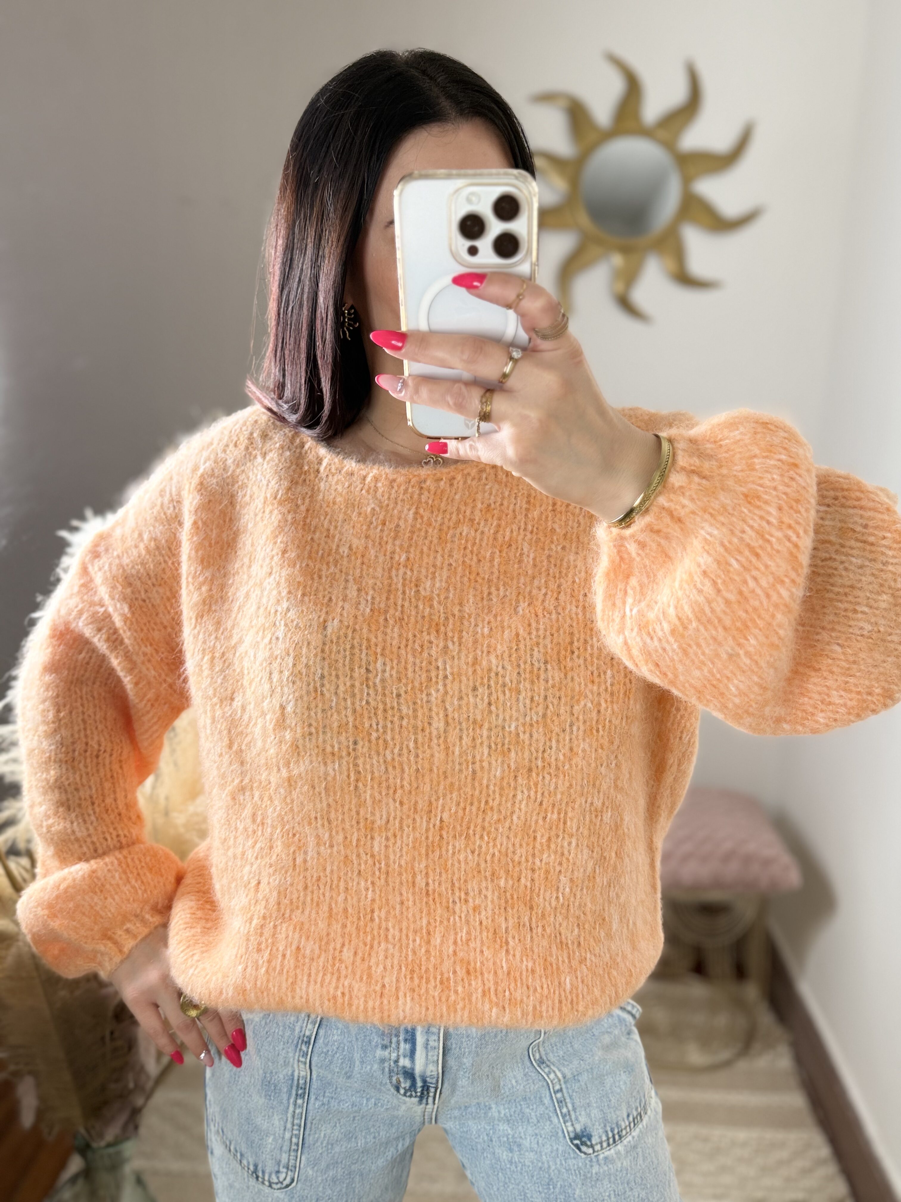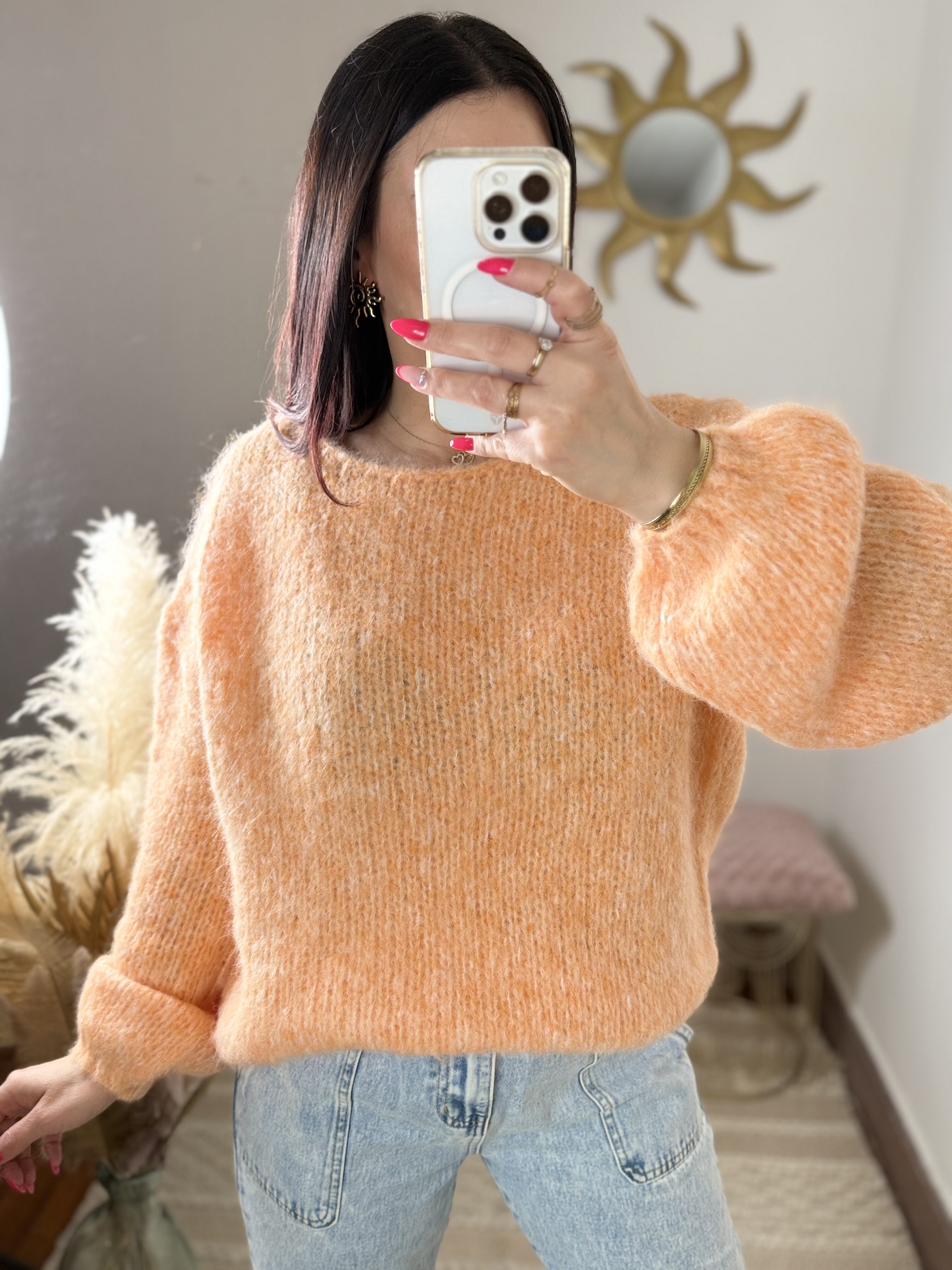 Le pull CALISTA est une véritable dose de lumière dans le vestiaire. Son orange doux effet sorbet illumine le teint et apporte instantanément de la fraîcheur à vos looks, été comme hiver.