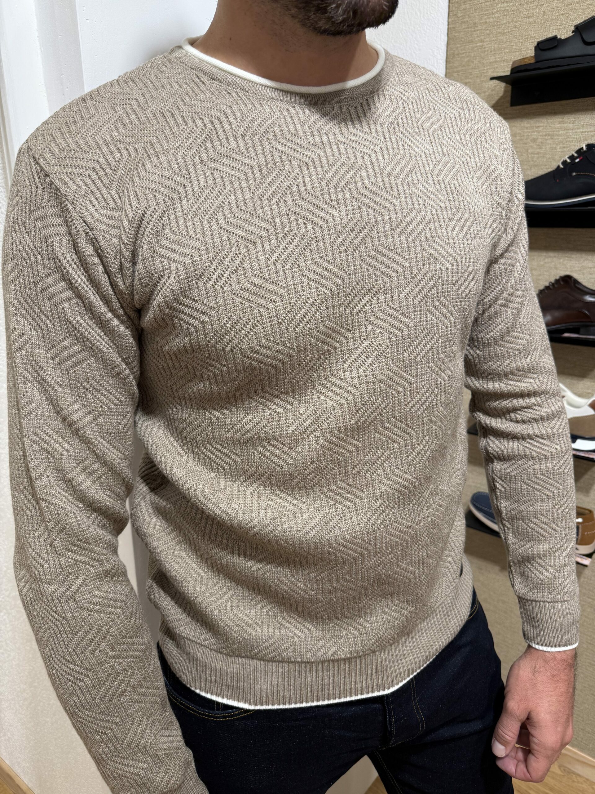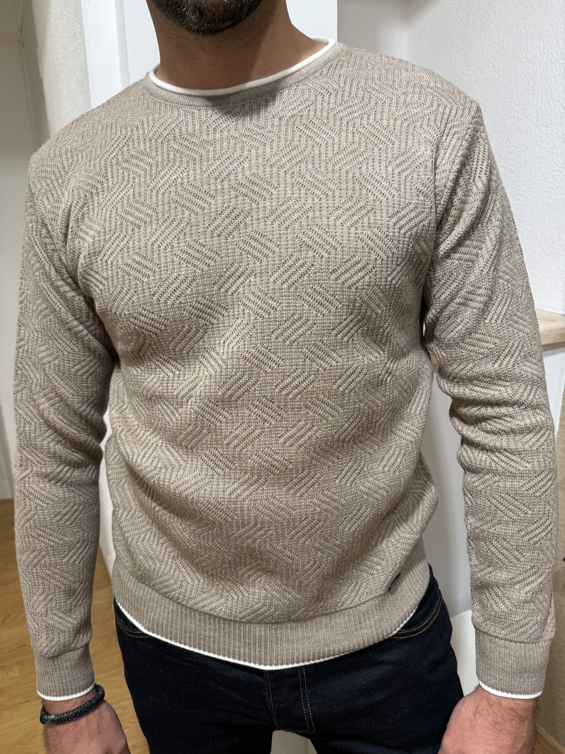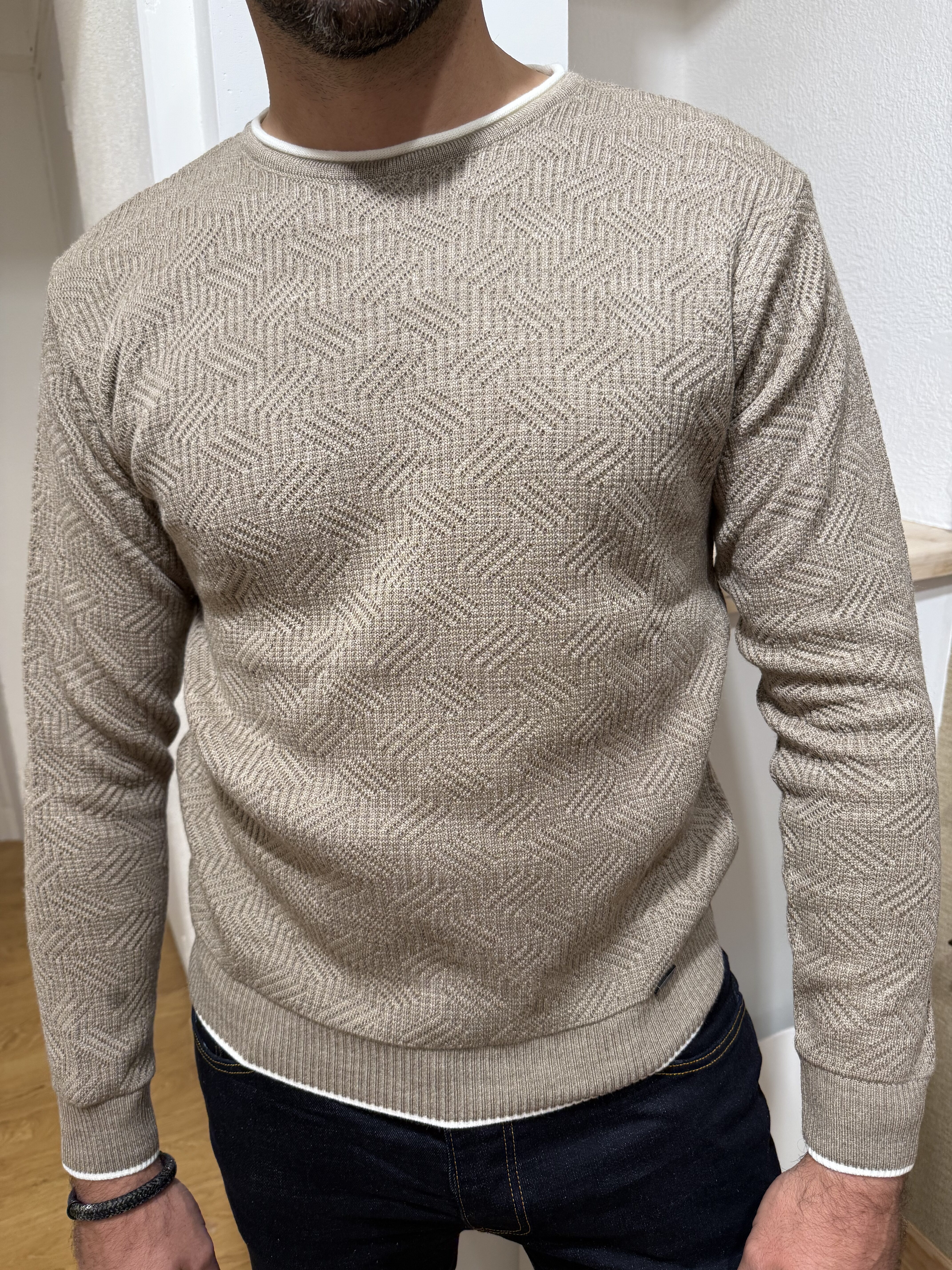 Ce pull fin beige se distingue par son motif géométrique en relief qui lui apporte une touche moderne et sophistiquée. Sa coupe droite et son col rond en font une pièce facile à porter au quotidien, tandis que les finitions côtelées aux poignets et à la taille assurent un tombé impeccable.