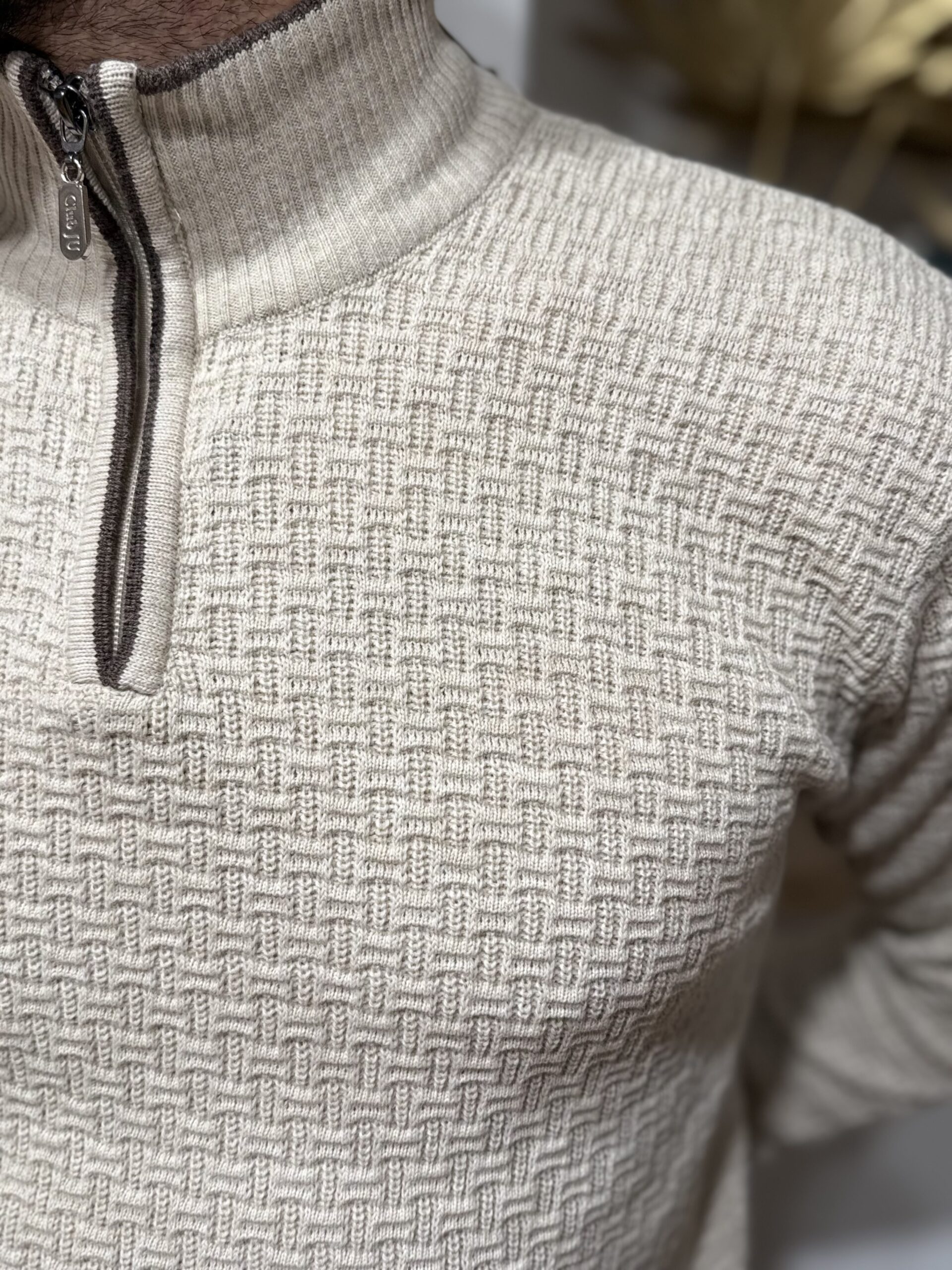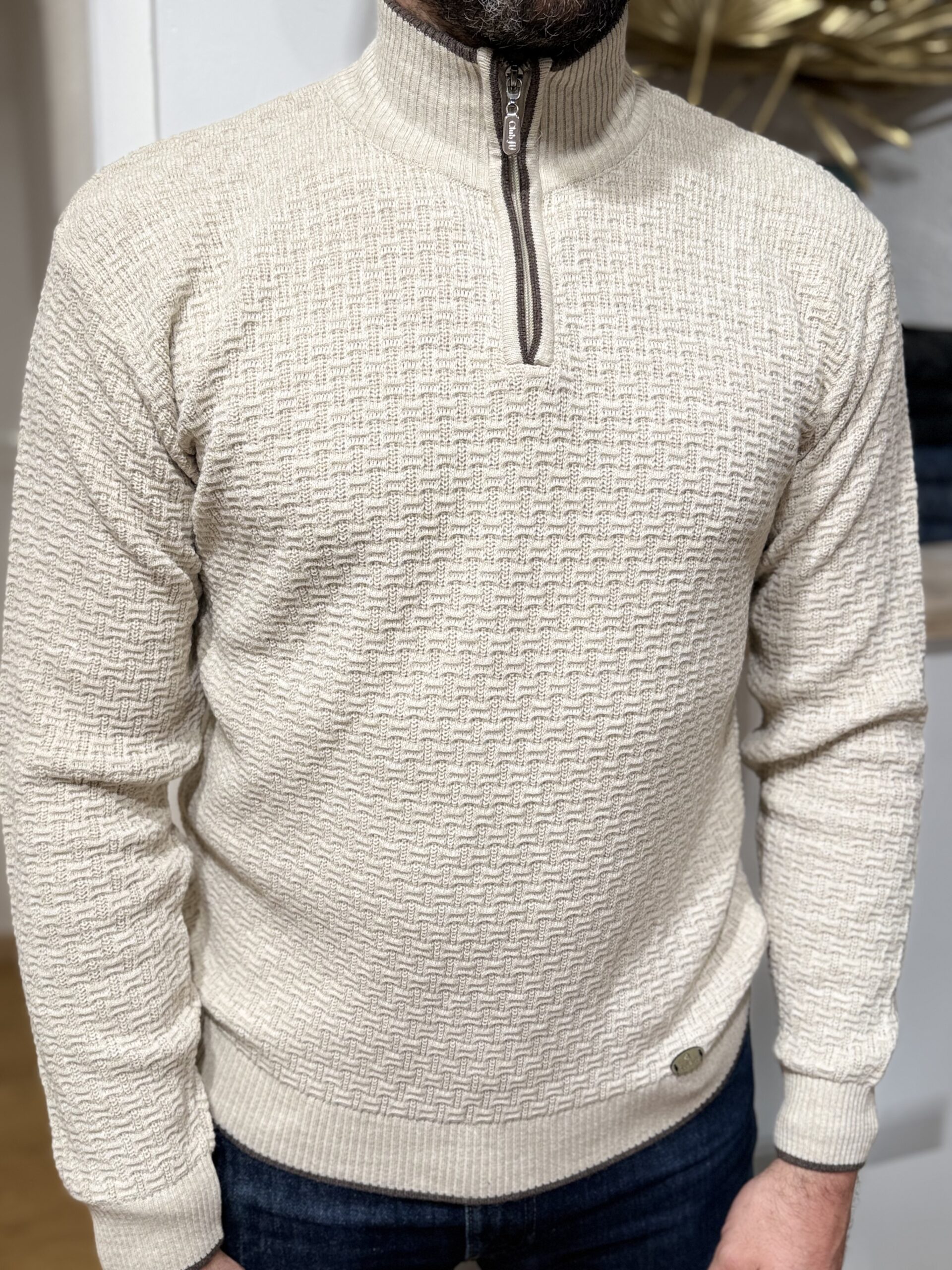 Pull homme zippé col montant – Maille texturée beige