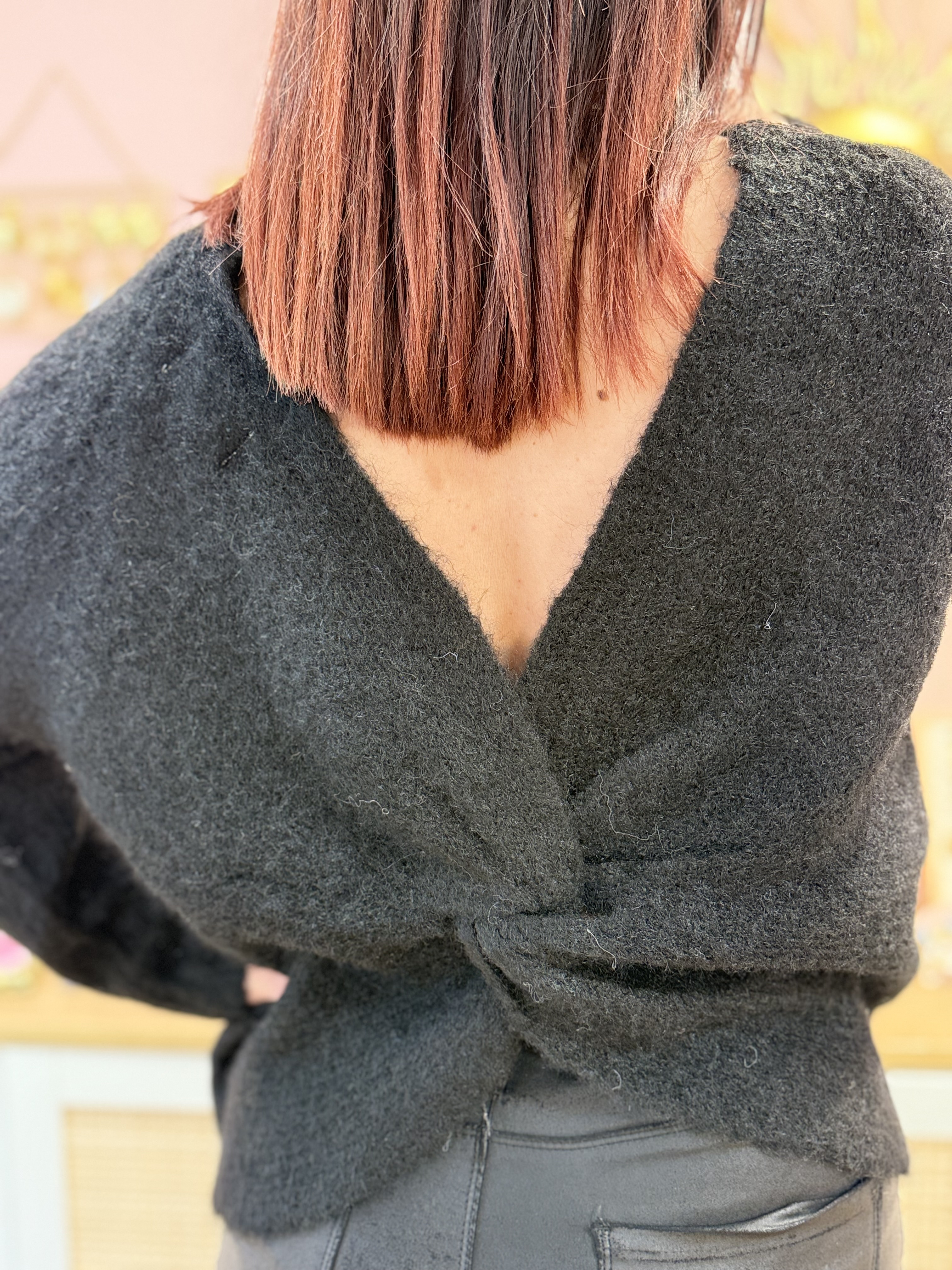 Ce pull en maille duveteuse séduit par sa coupe ample et son coloris noir vibrant qui apporte lumière et bonne humeur à vos tenues. Original et raffiné, il est réversible : vous pouvez le porter avec un décolleté sage à l’avant ou bien dans le dos, twisté par un élégant nœud.