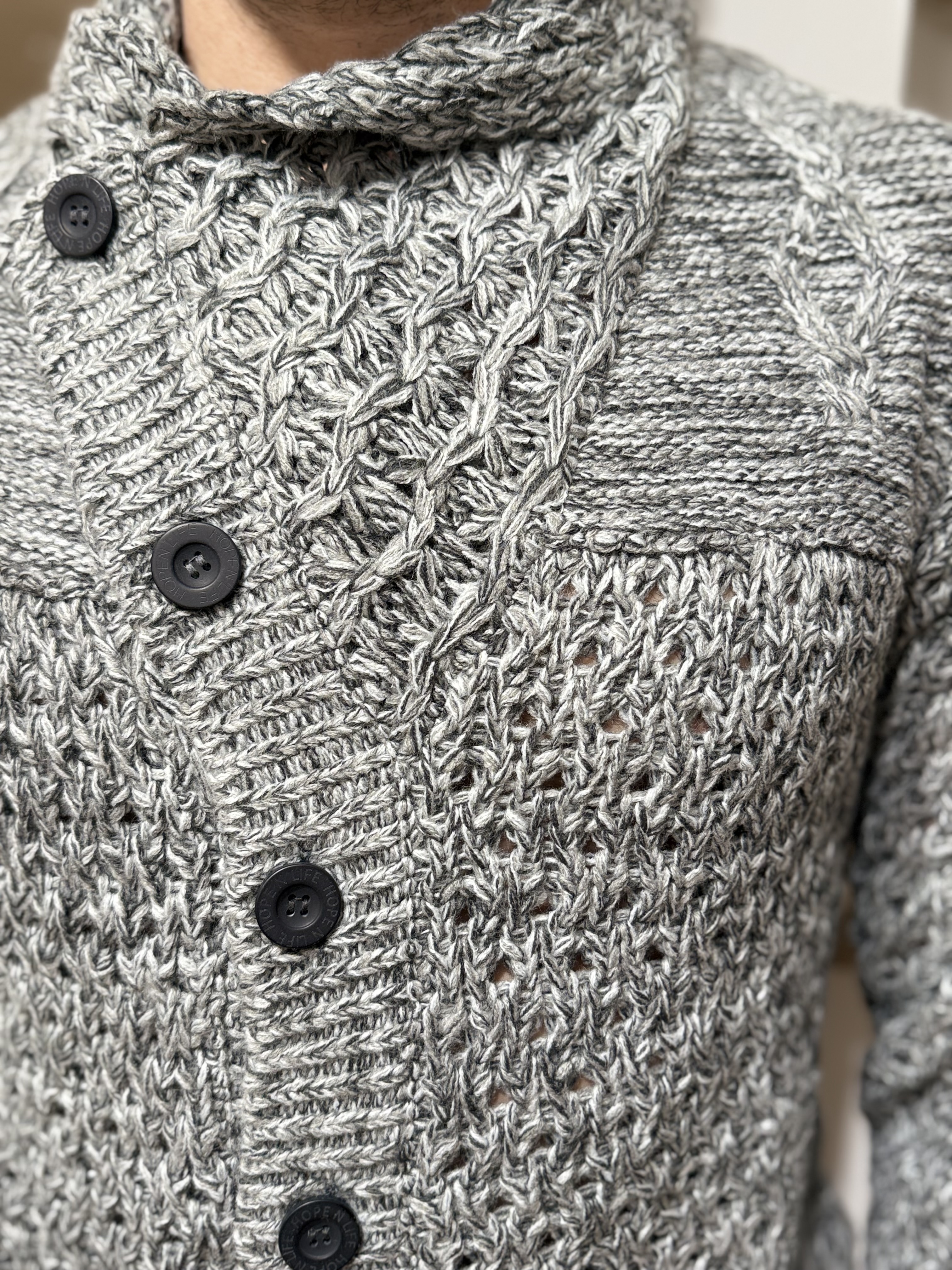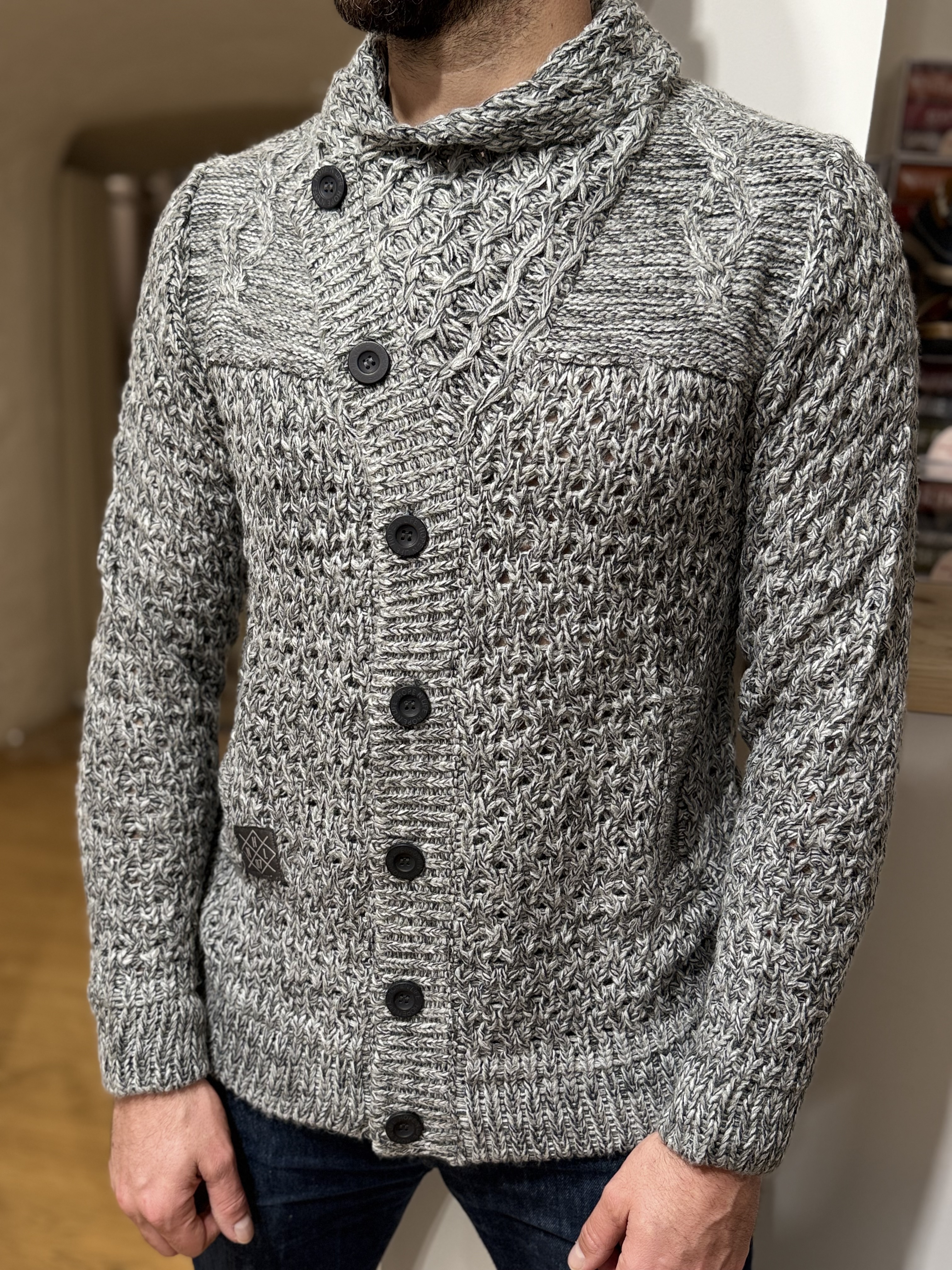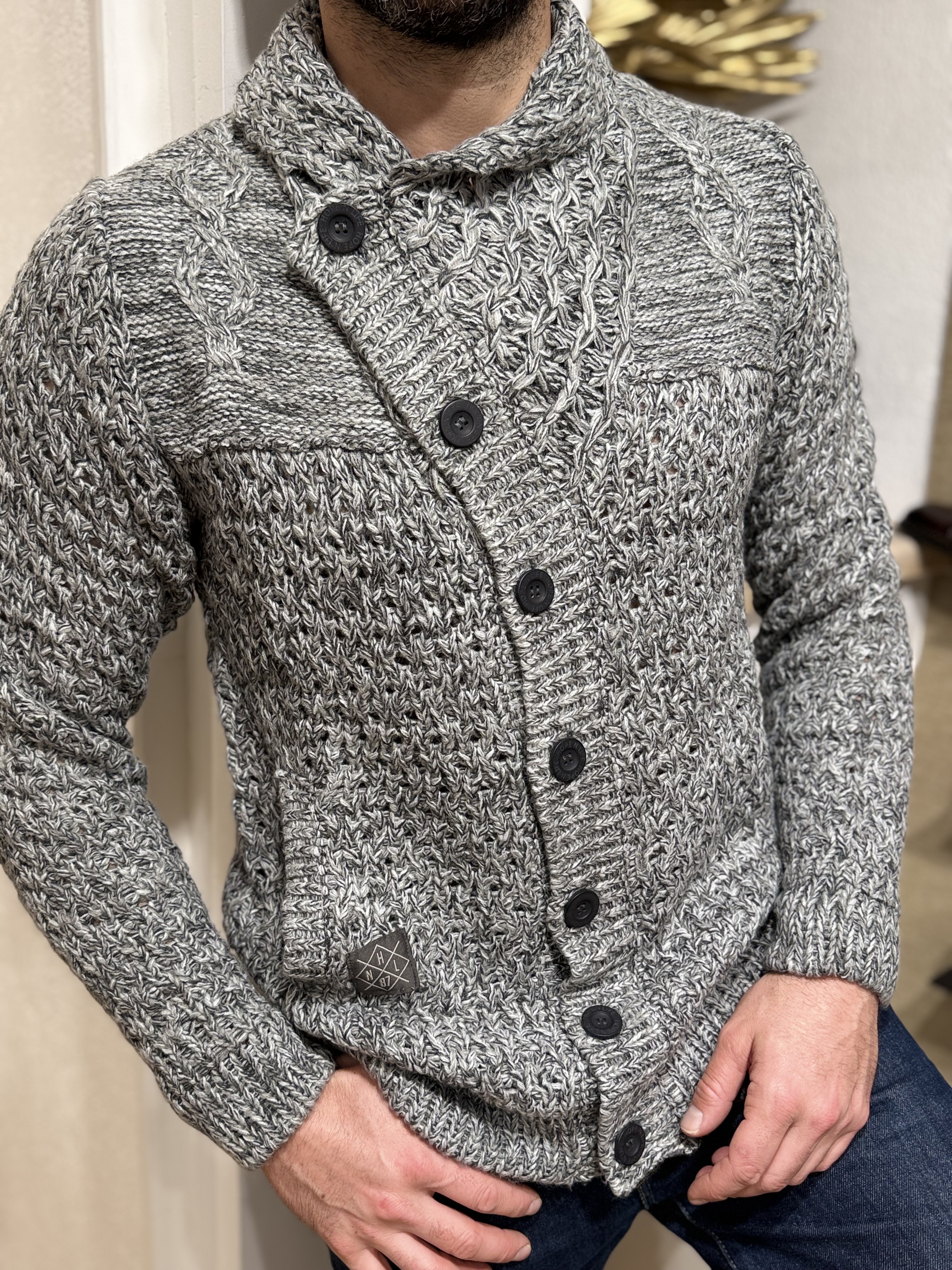 Découvrez Marcus, un pull homme à l’allure authentique et travaillée, parfait pour affronter la saison avec chaleur et style. Confectionné dans une maille épaisse chinée gris/noir, il se distingue par un mélange de points tricotés très qualitatifs : torsades, reliefs texturés et mailles croisées pour un rendu fort en caractère.