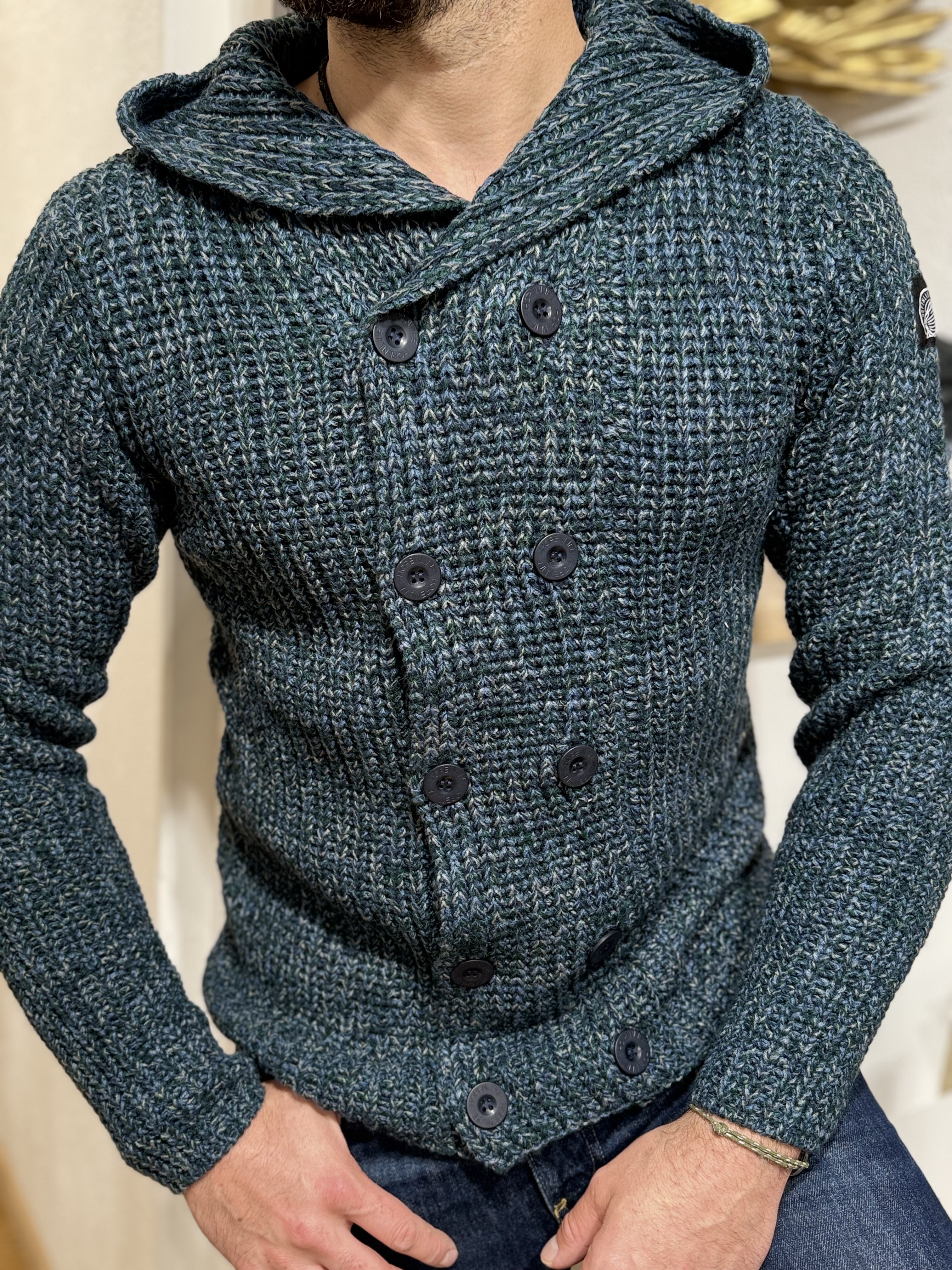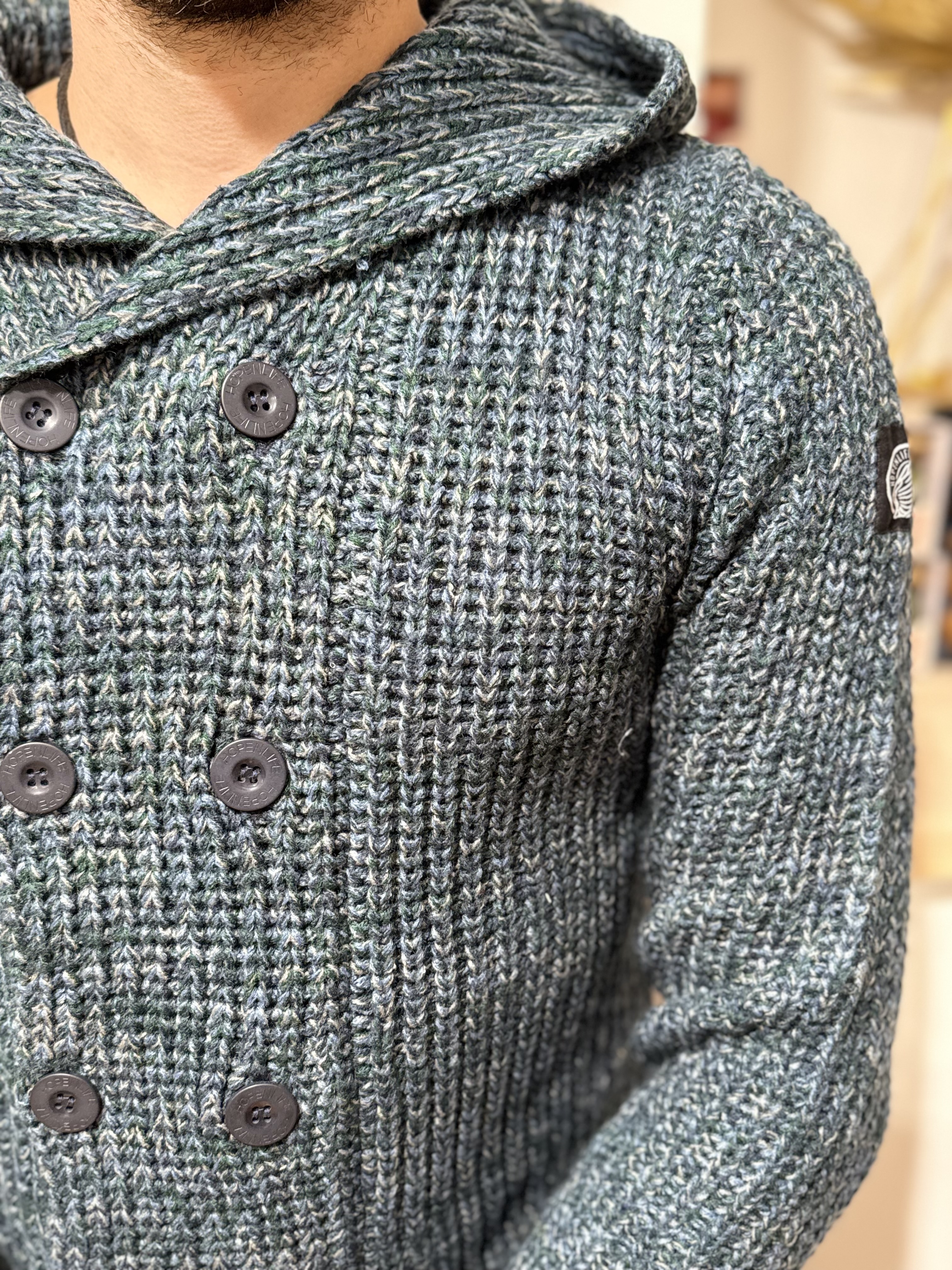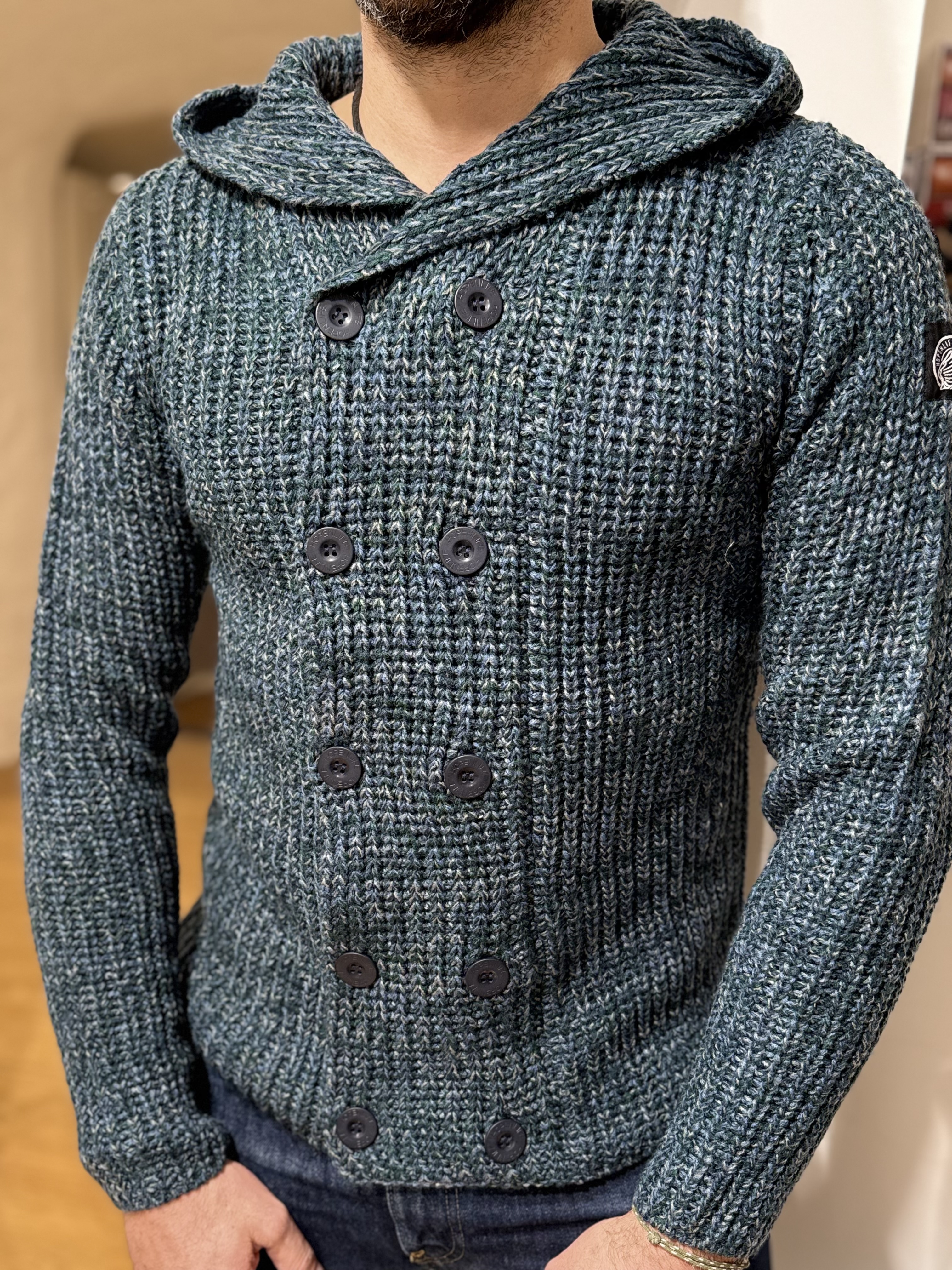Pull Milan – Maille épaisse bleu chiné • Boutonnage croisé & capuche