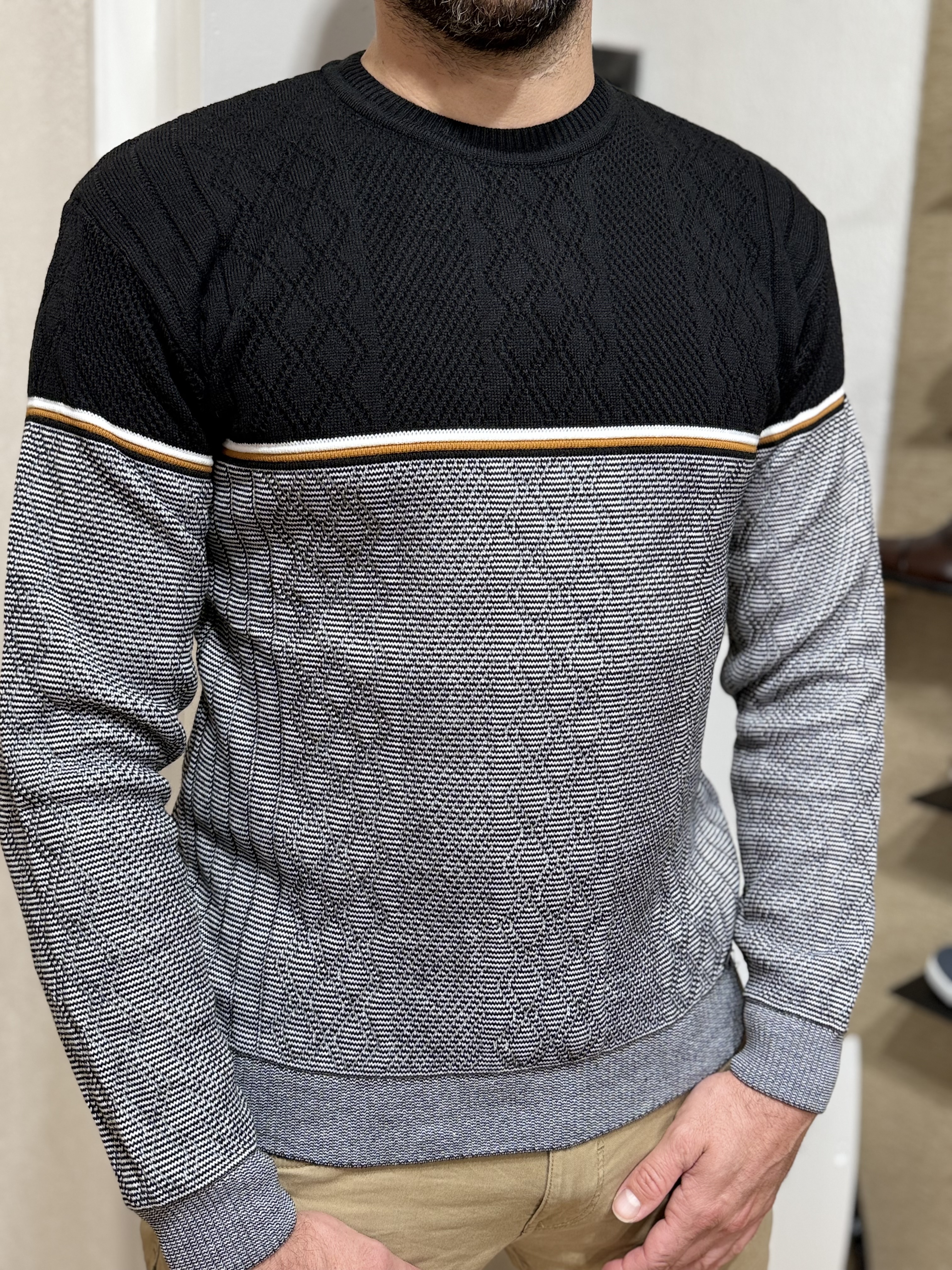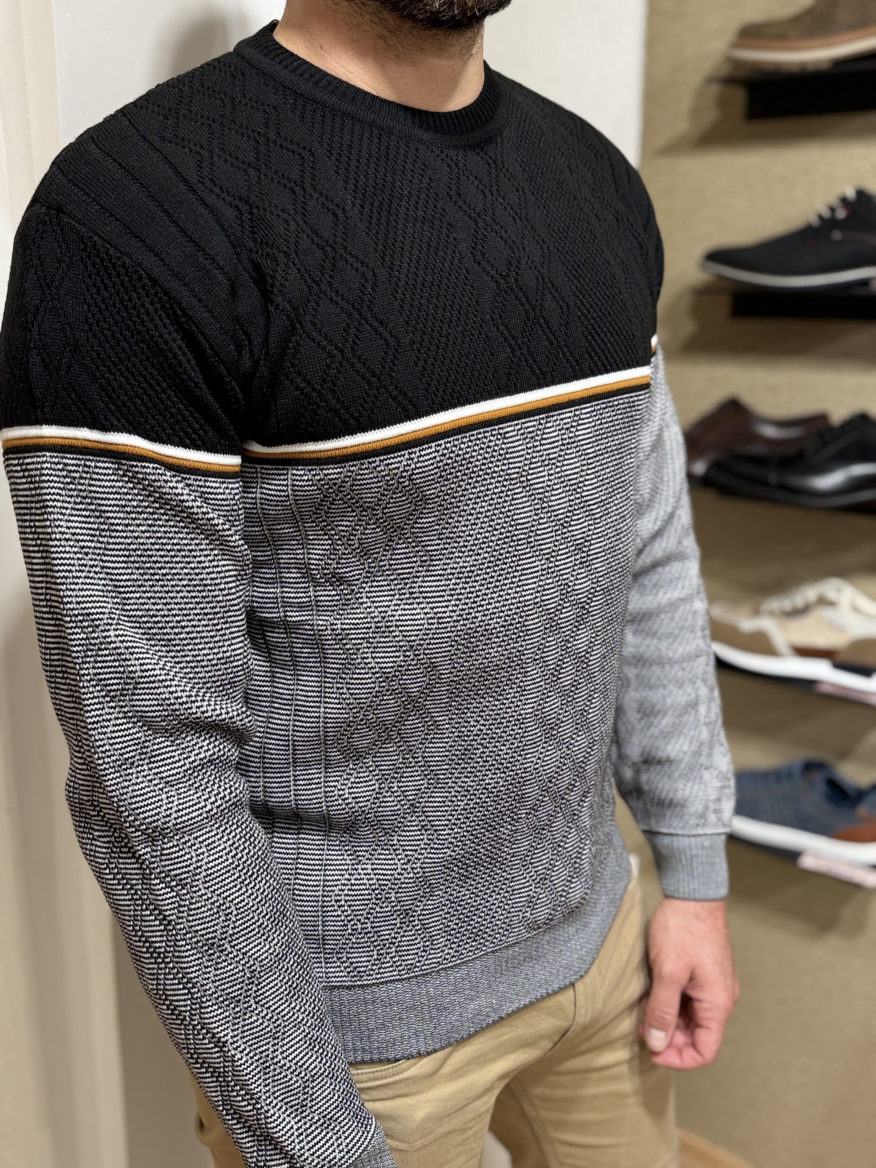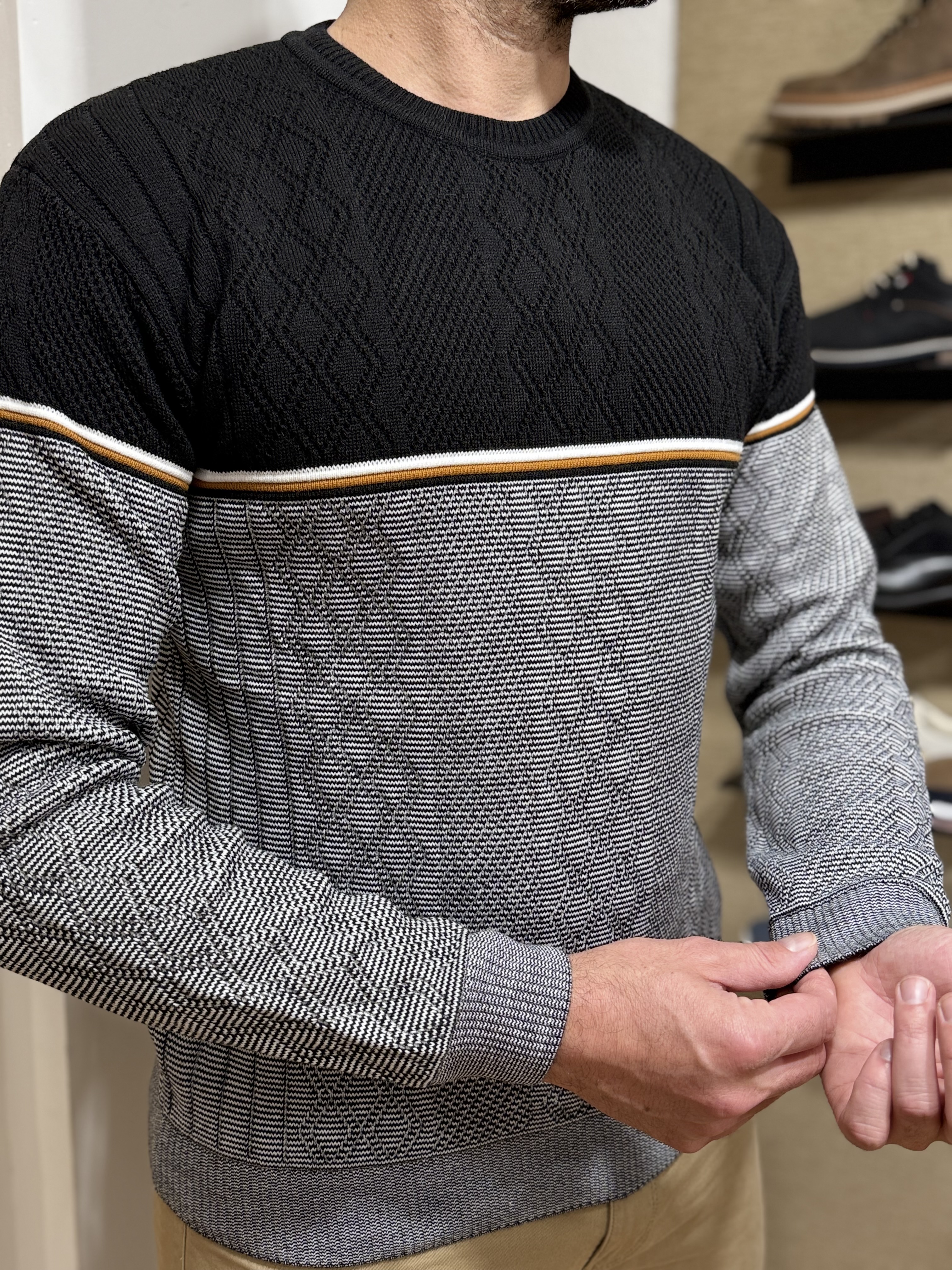 Sa maille texturée bicolore se distingue par un jeu de motifs géométriques subtils et une bande contrastée soulignant la poitrine pour une touche contemporaine.