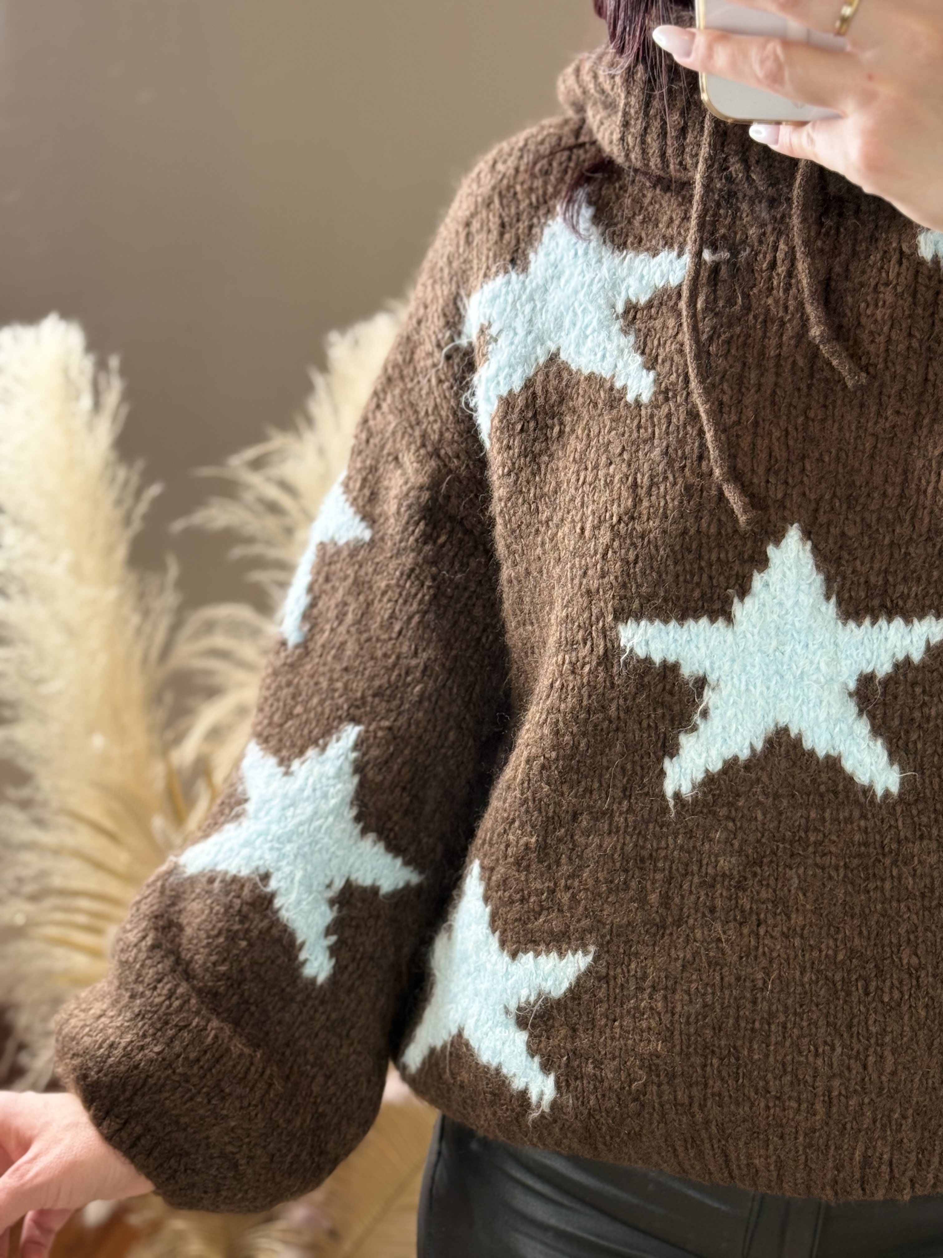 Le pull Stella se décline ici dans une version tout aussi canon, mêlant une maille chocolat profonde à de grandes étoiles bleu ciel pour un contraste doux et moderne. Une association de couleurs originale qui apporte immédiatement du caractère à la tenue tout en restant facile à porter.
