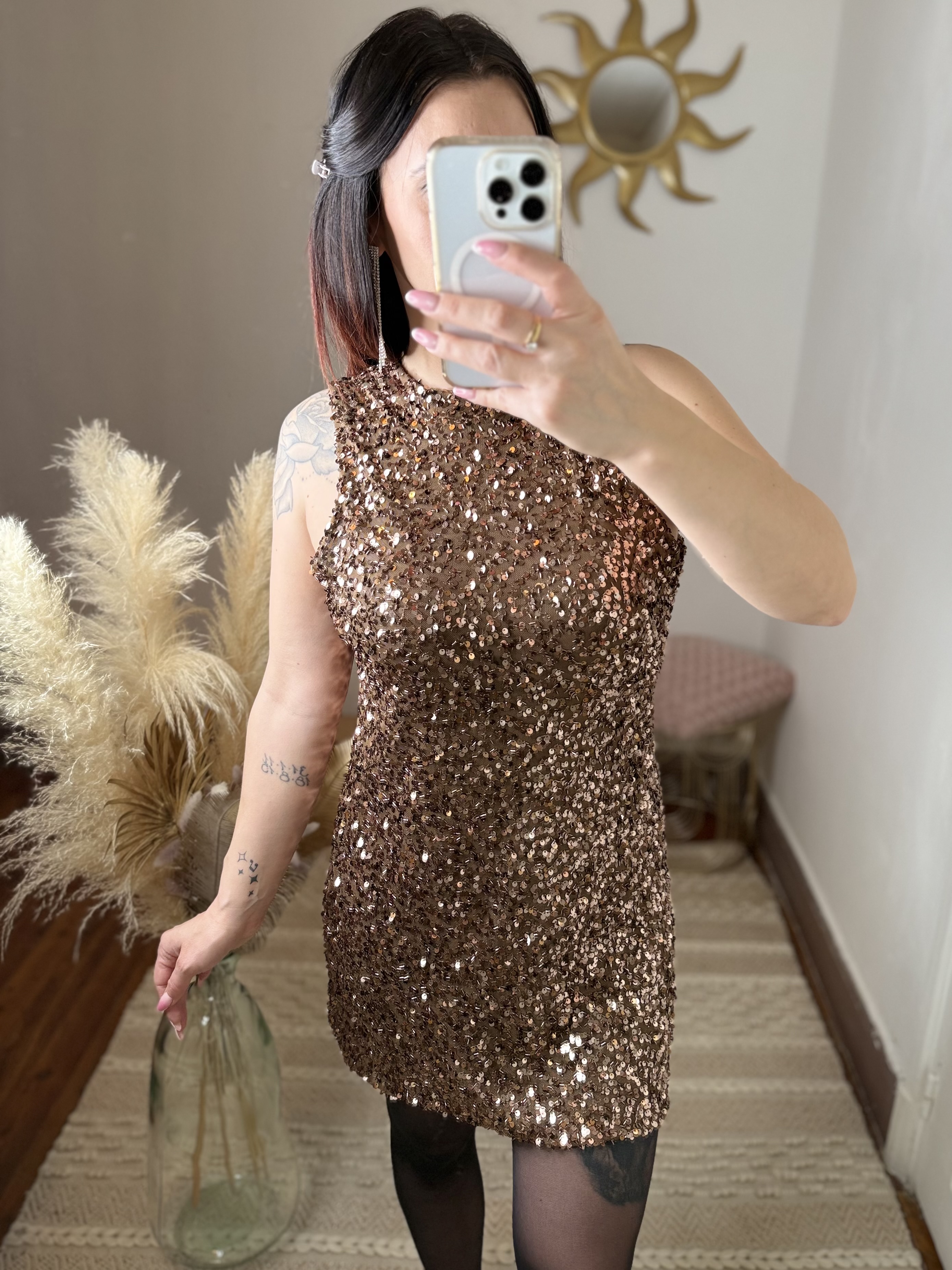 La robe Carmela est la pièce glamour indispensable pour briller lors de toutes vos soirées et événements festifs. Entièrement recouverte de sequins lumineux, elle capte la lumière à chaque mouvement et offre un rendu éclatant, féminin et irrésistible.