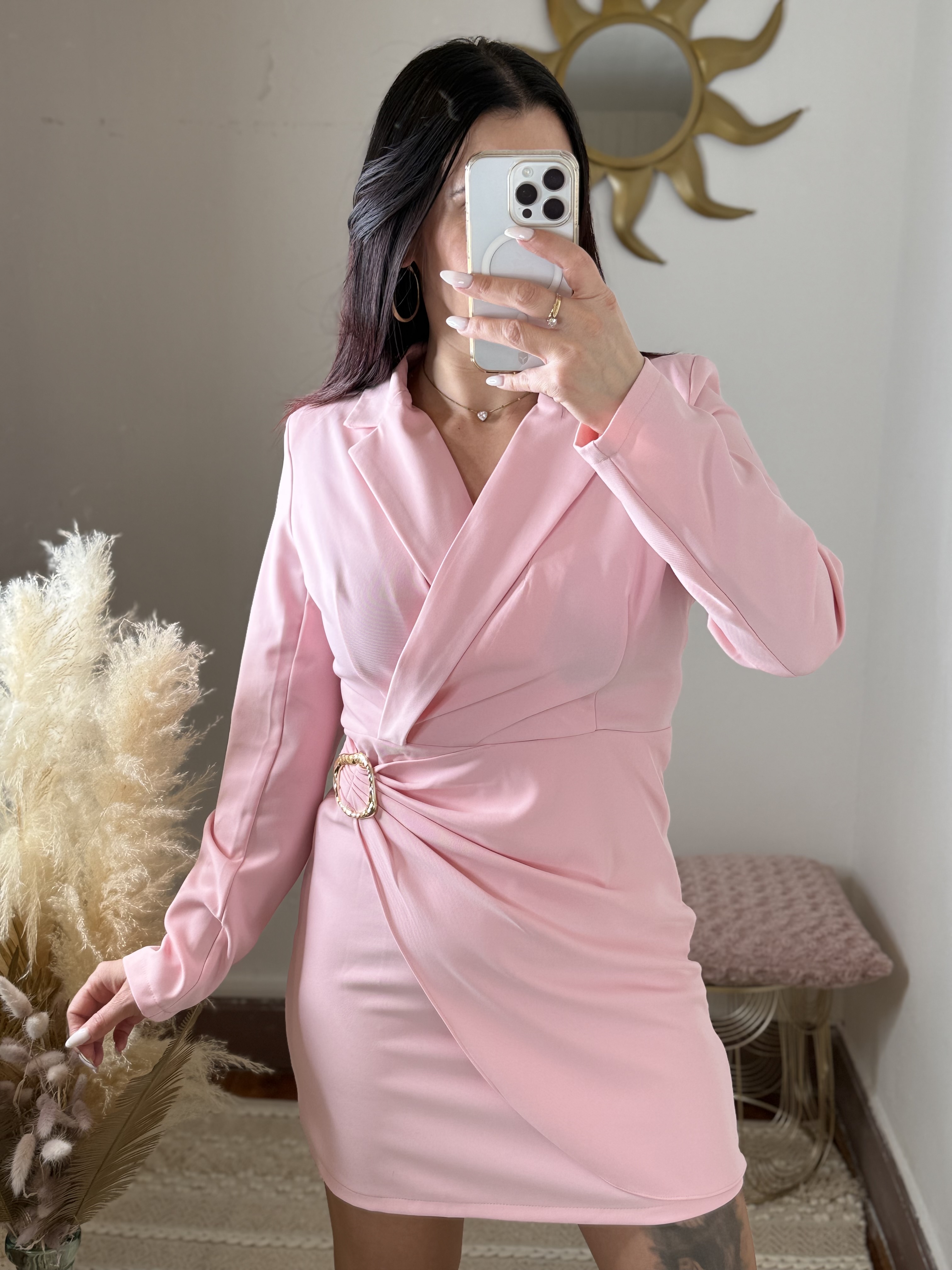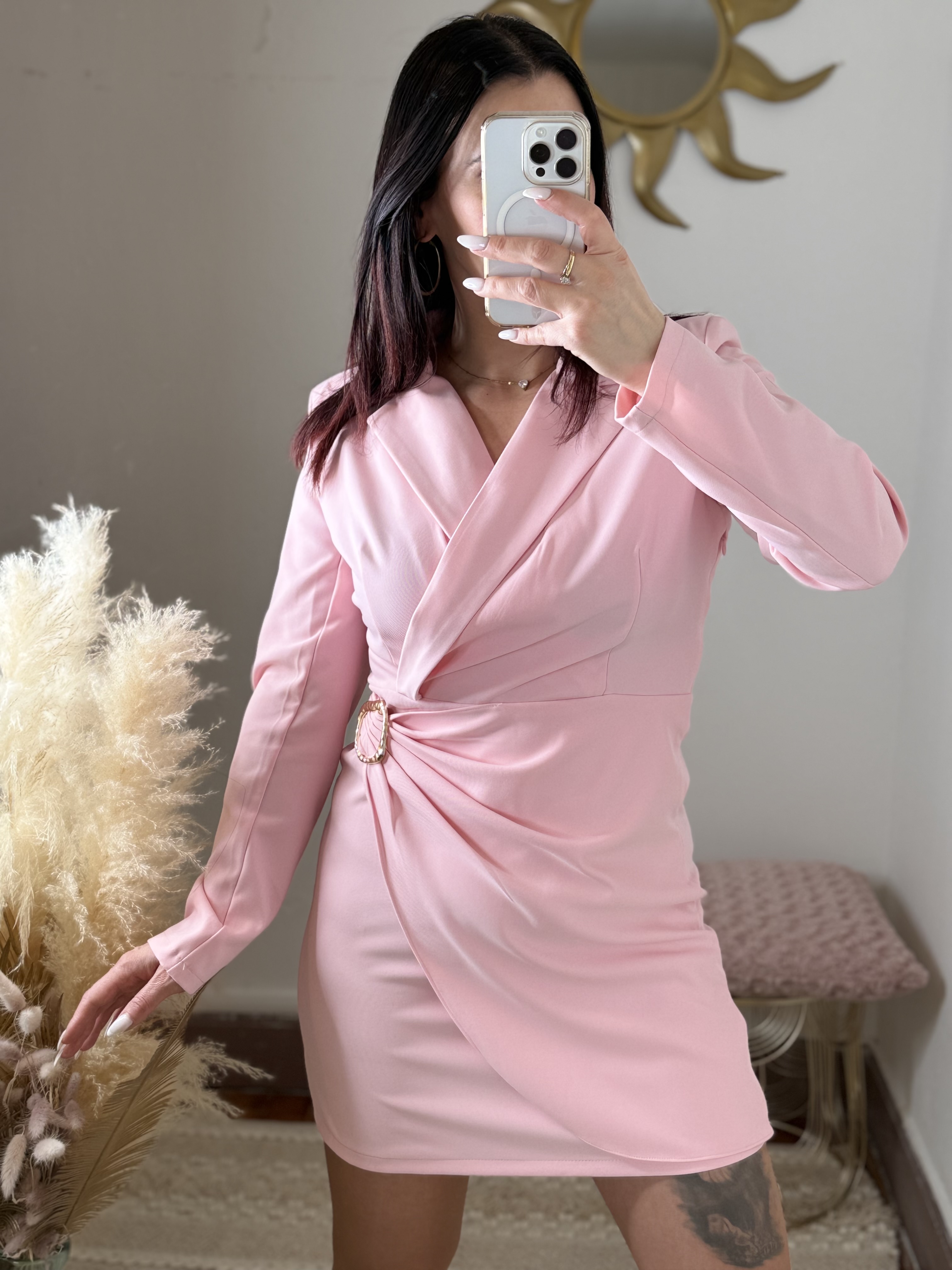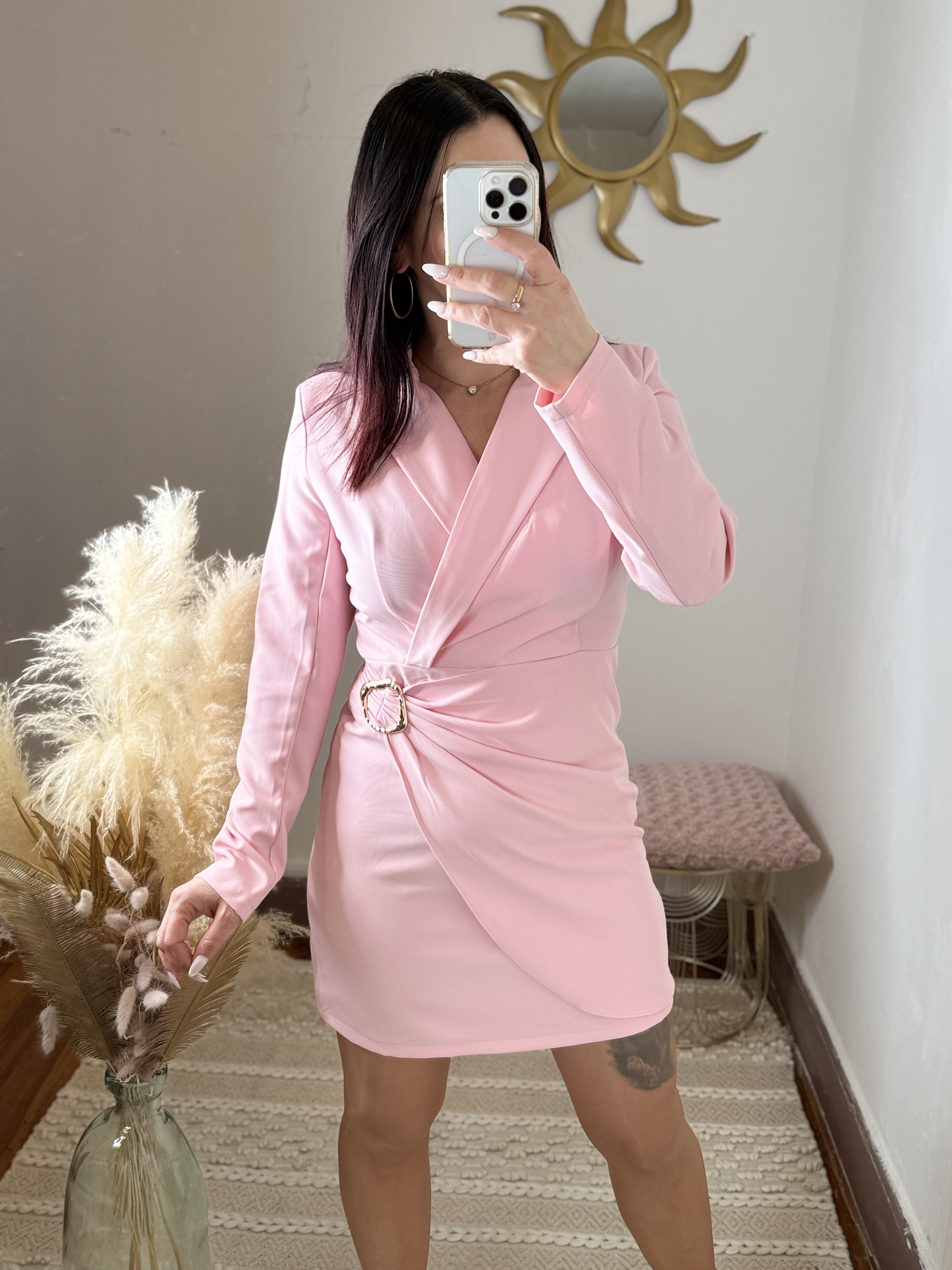 Son rose doux et lumineux apporte une touche de fraßcheur et de romantisme, idéale aussi bien pour une occasion spéciale que pour une tenue plus habillée du quotidien. Le détail bijou doré à la taille vient souligner la coupe et ajouter une note chic et raffinée.