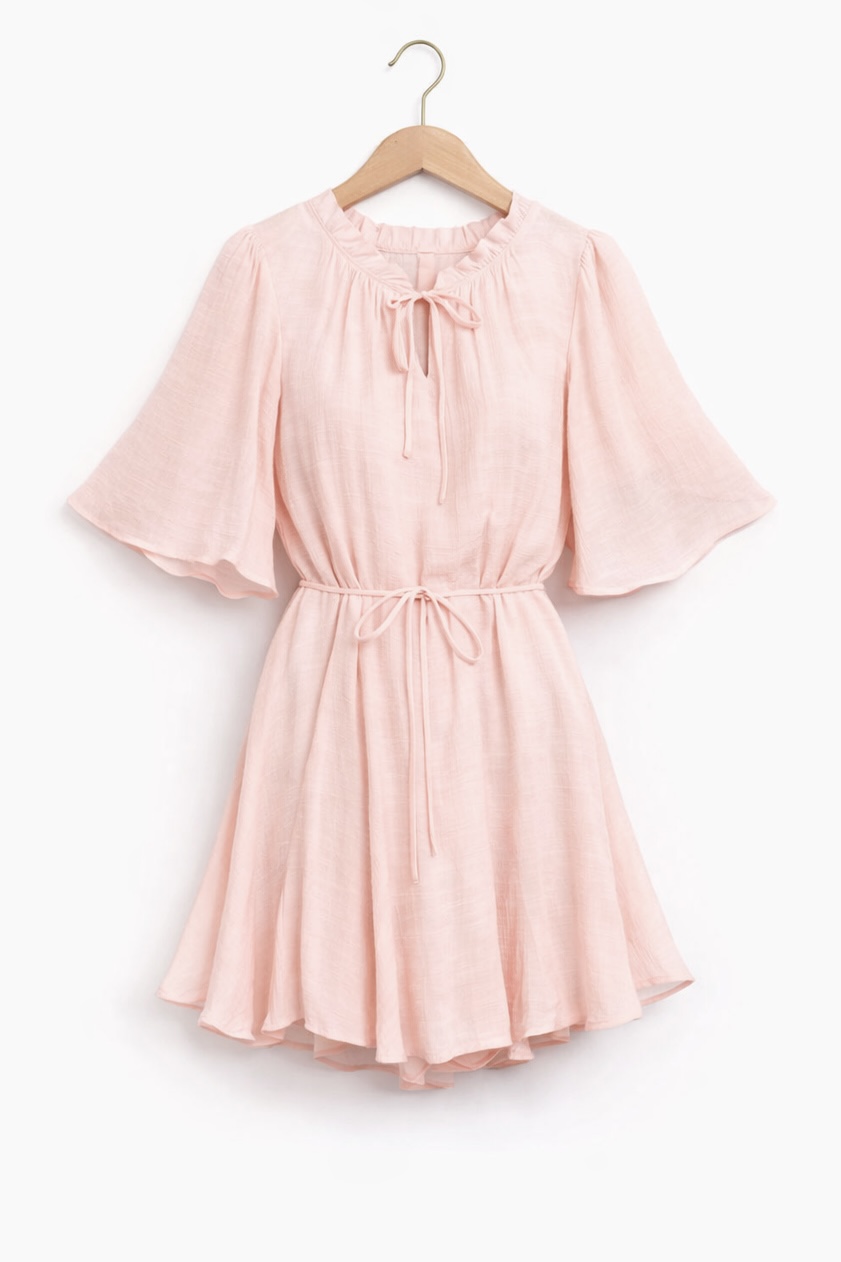 Son encolure légèrement froncée avec lien à nouer apporte du charme et de la finesse, tandis que ses manches évasées créent un joli mouvement aérien. Sa taille ajustable permet de structurer la silhouette selon tes envies, pour un rendu à la fois confortable et féminin.