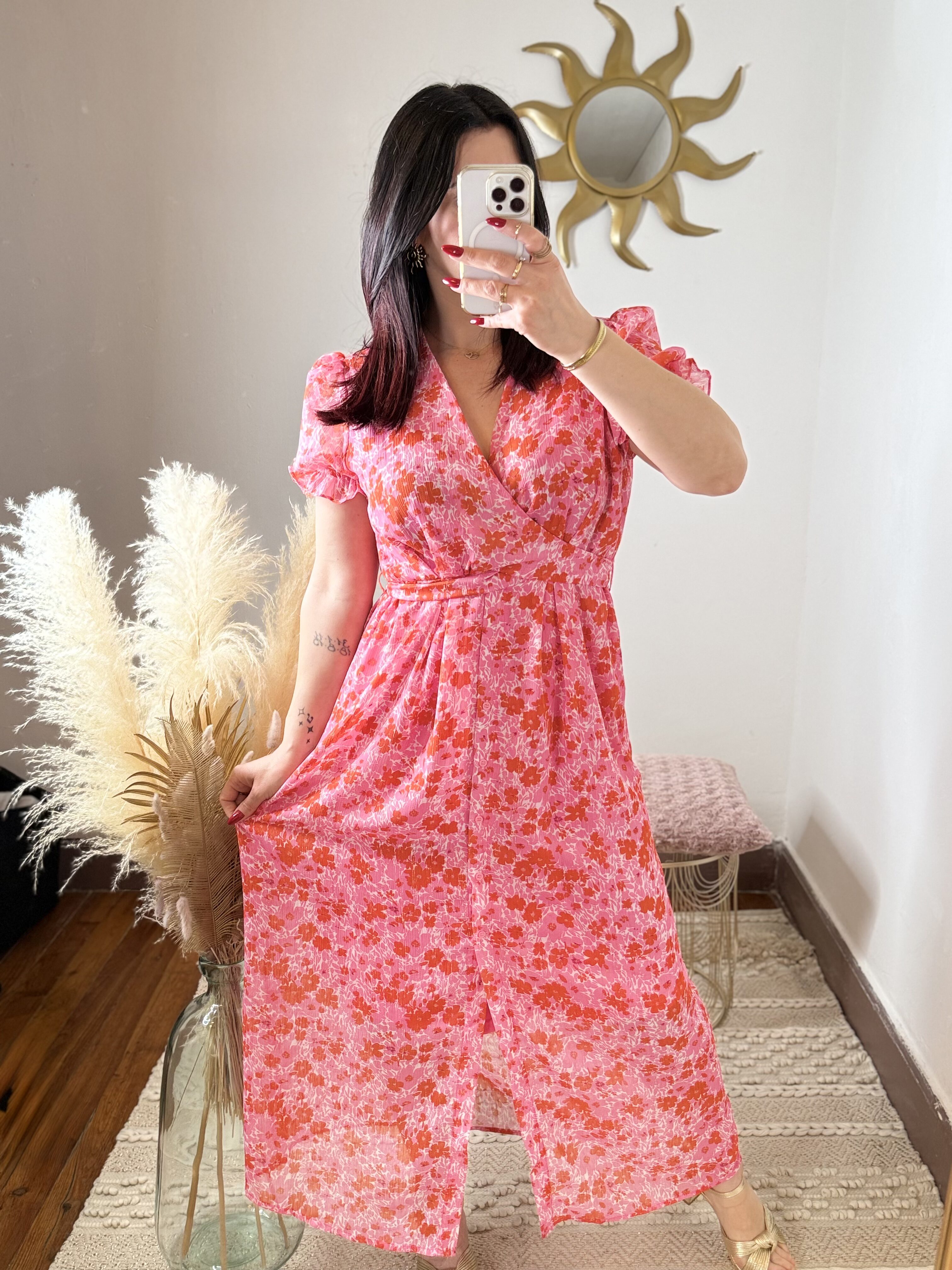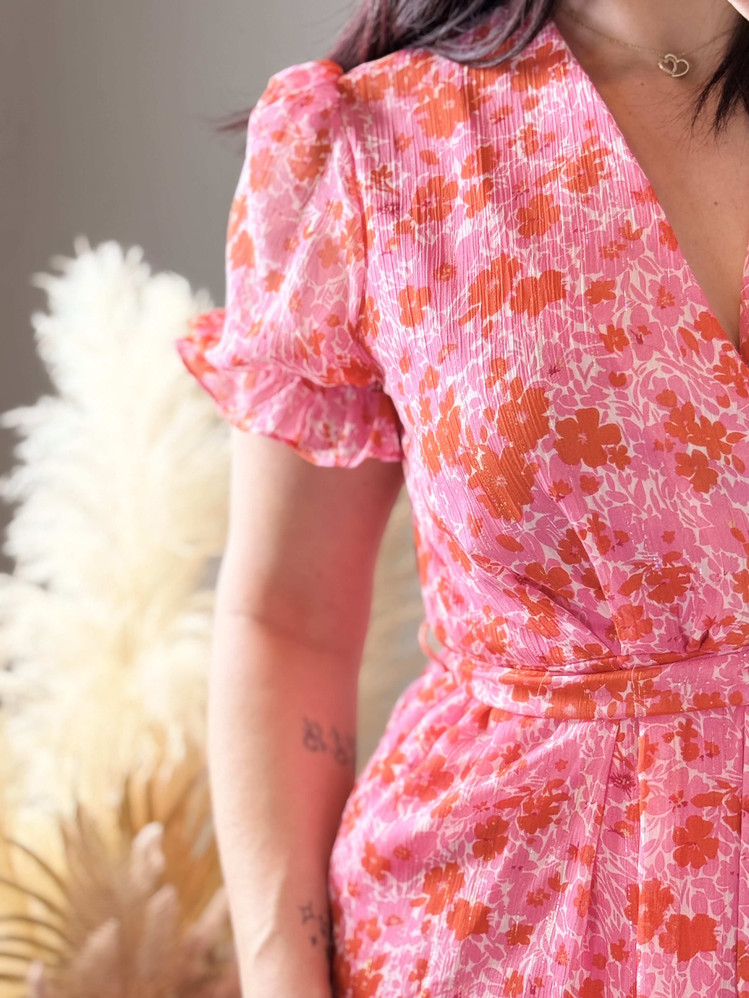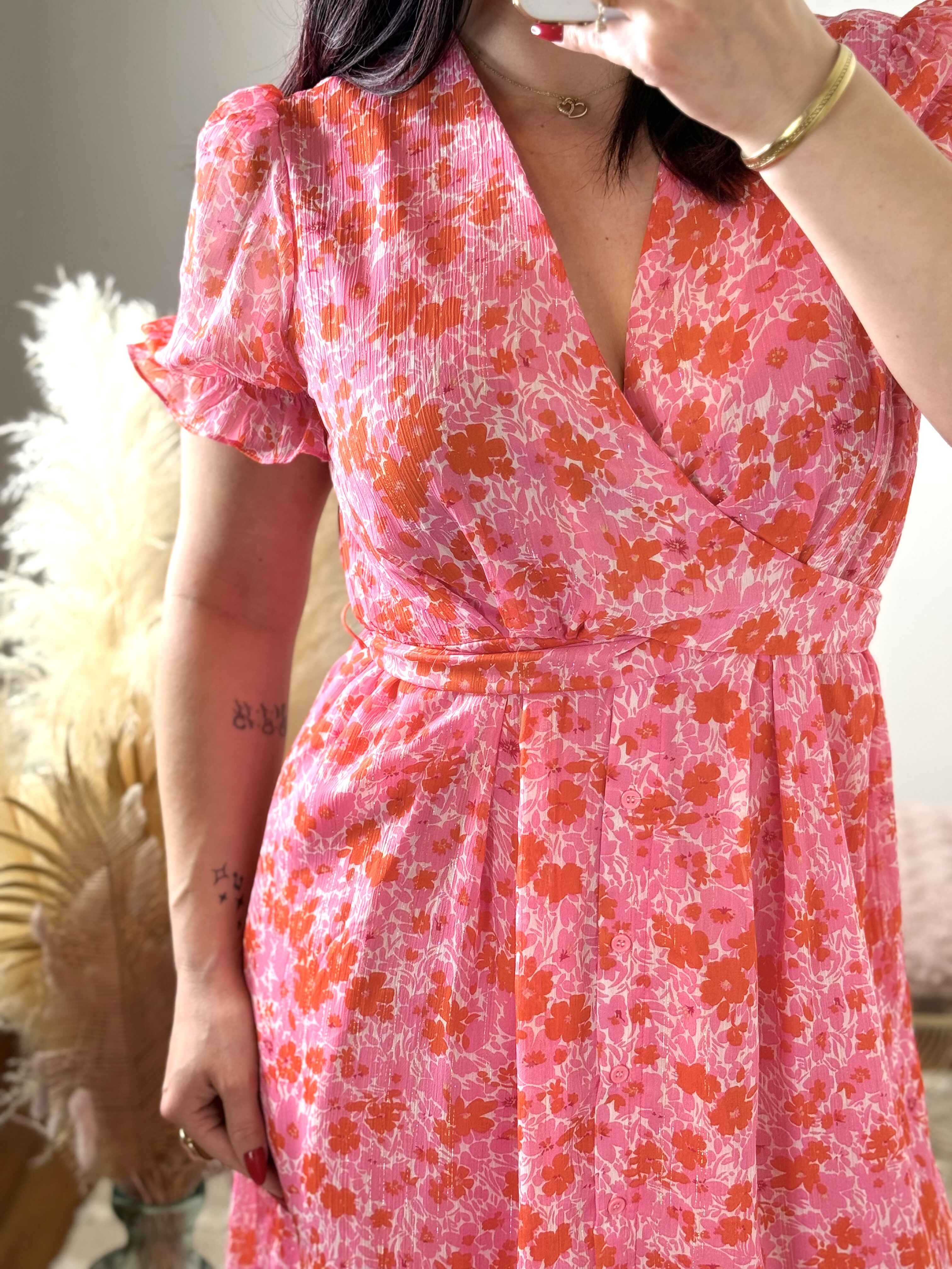 Avec son imprimé floral rose et rouge lumineux, cette robe attire immédiatement le regard et sublime la silhouette. Son décolleté croisé façon cache-cœur met délicatement le buste en valeur tandis que la taille marquée structure la silhouette avec élégance.