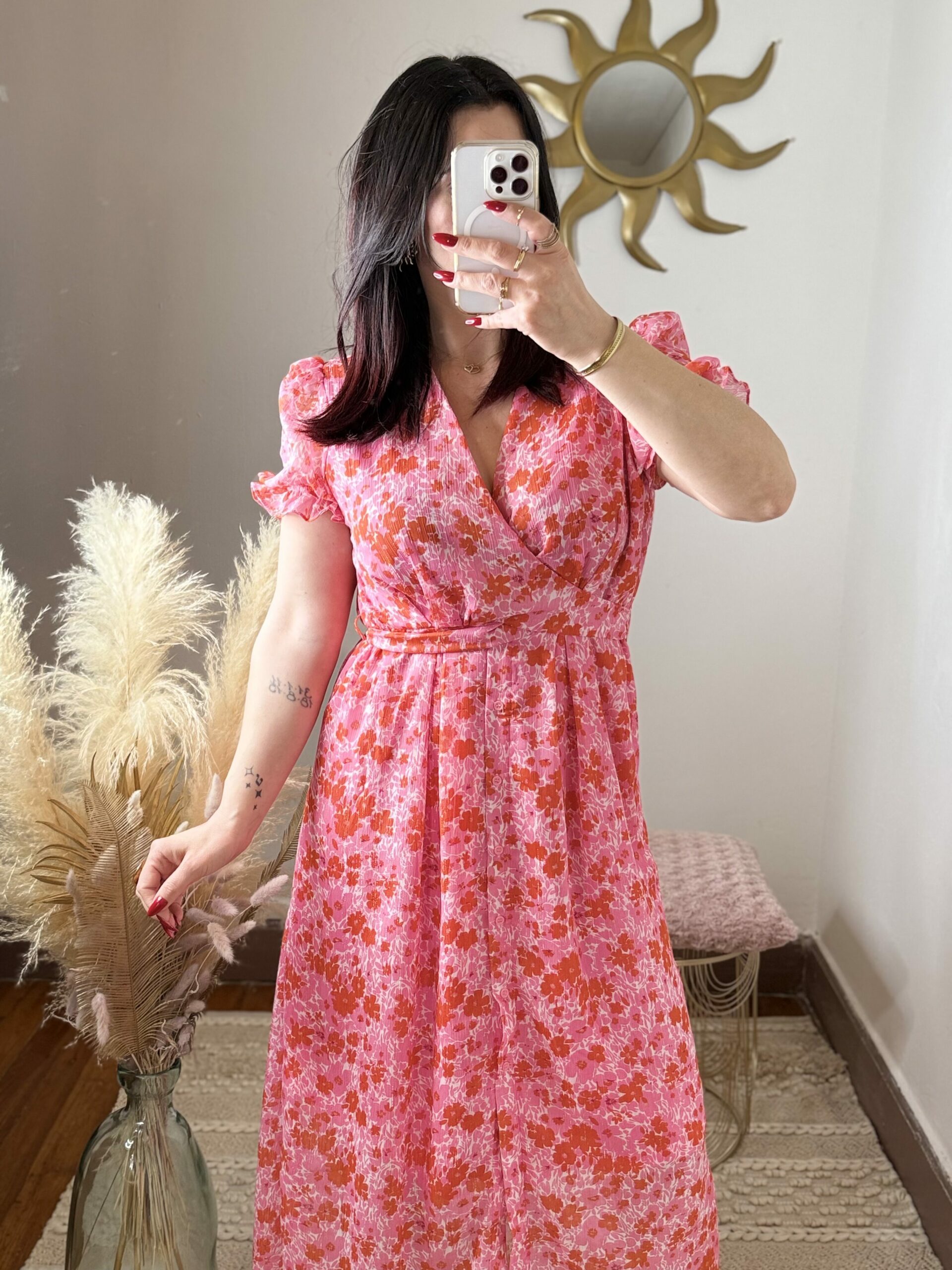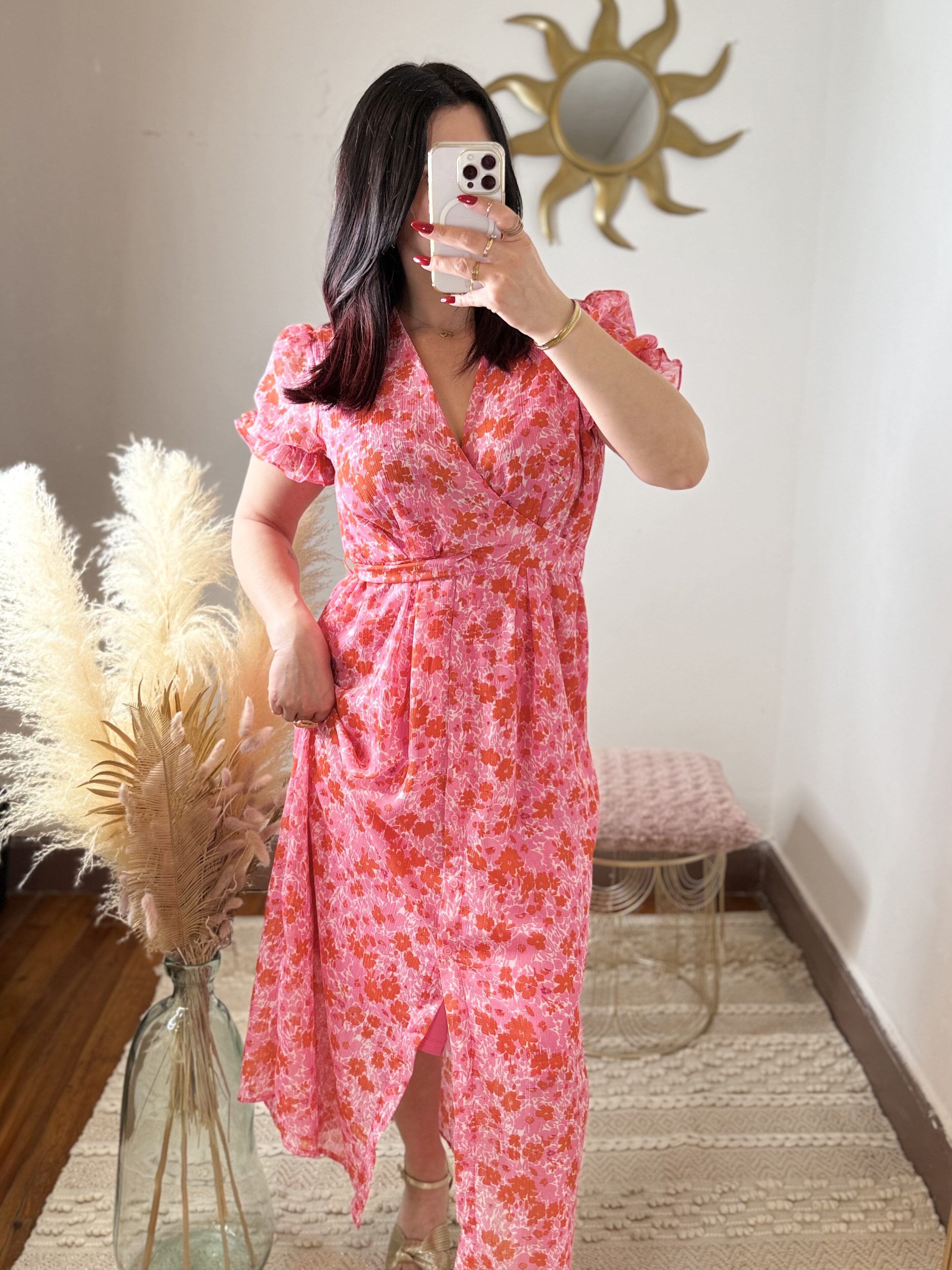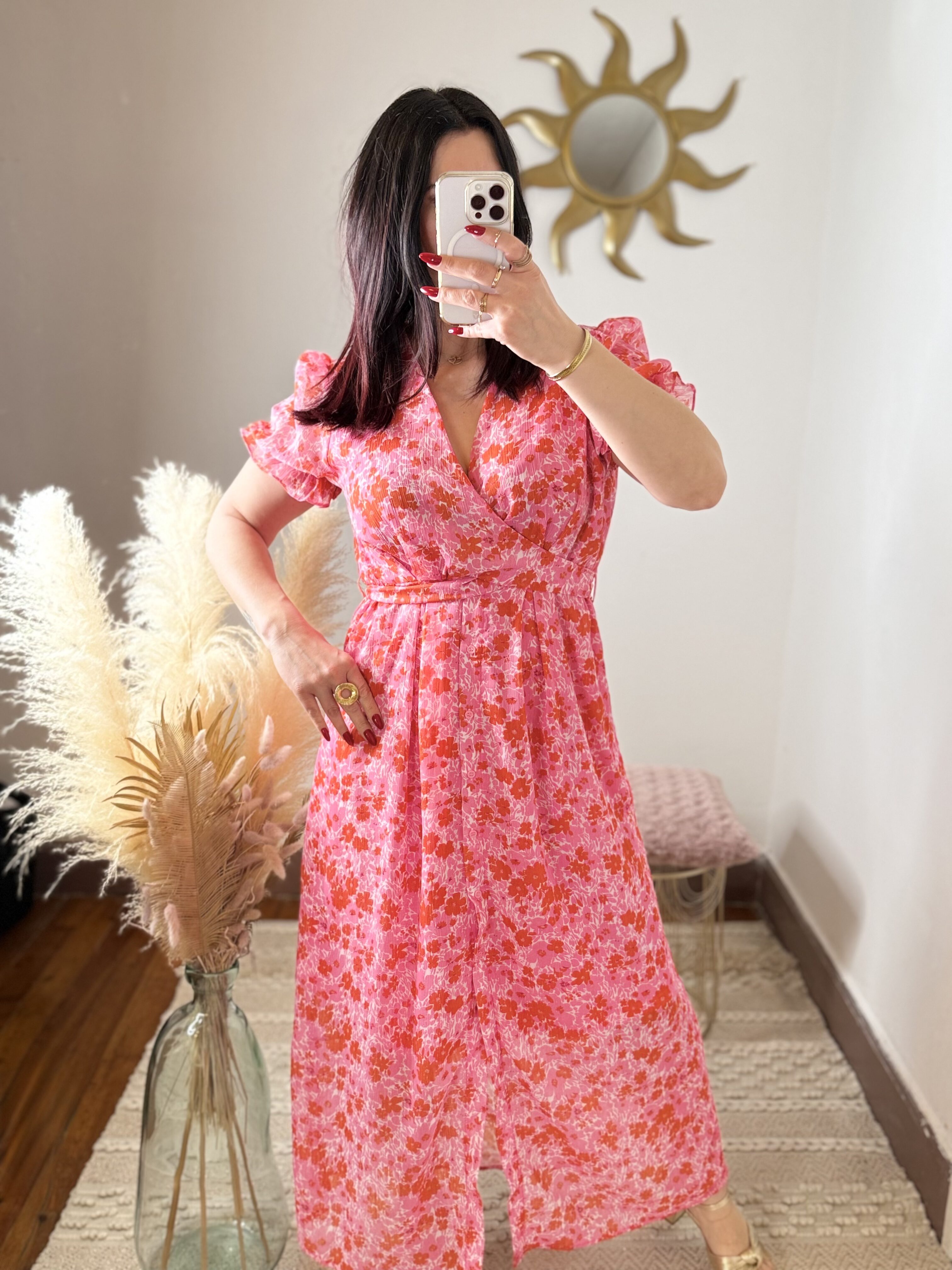 Avec son imprimé floral rose et rouge lumineux, cette robe attire immédiatement le regard et sublime la silhouette. Son décolleté croisé façon cache-cœur met délicatement le buste en valeur tandis que la taille marquée structure la silhouette avec élégance.
