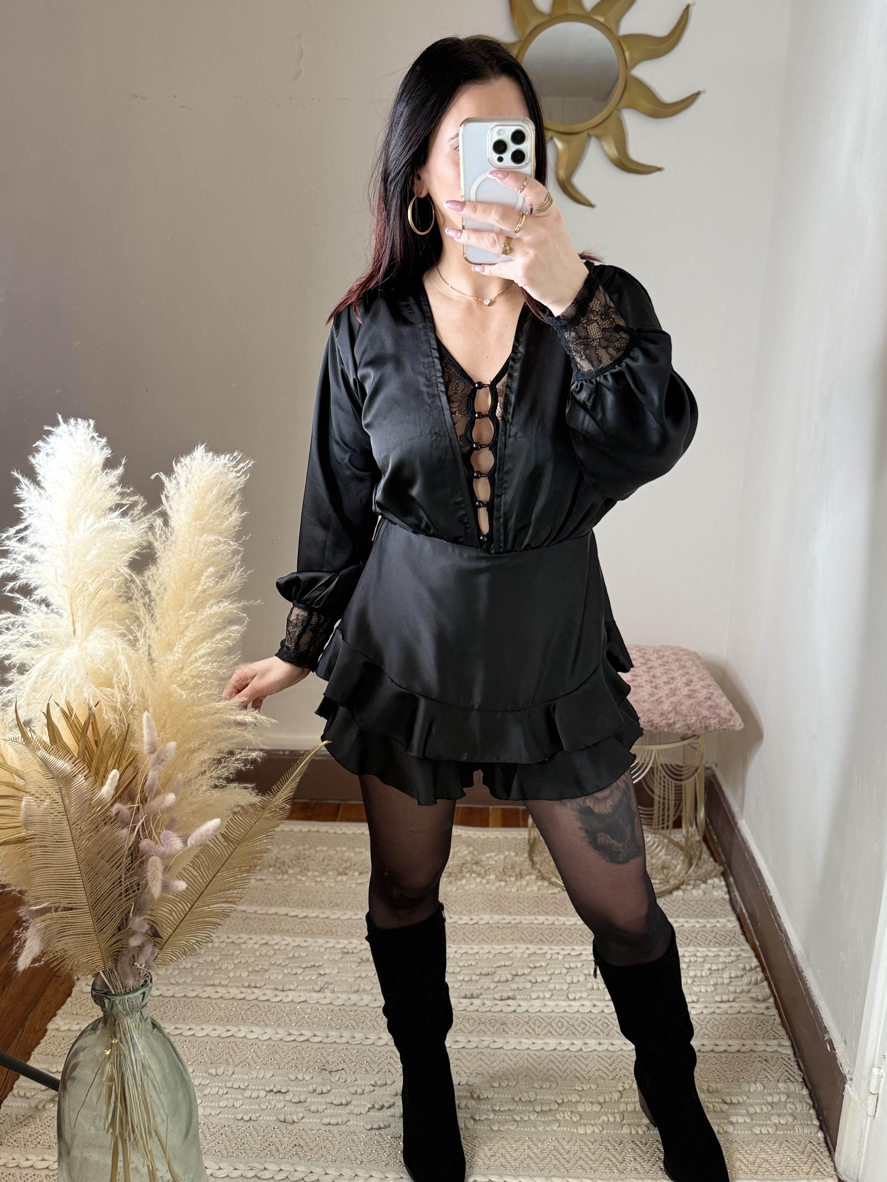Sa matière satinée fluide glisse sur la silhouette et offre un tombé élégant. La taille est délicatement marquée, mettant en valeur la silhouette, tandis que la jupe courte à volants apporte du mouvement et une touche glamour. Les manches longues légèrement bouffantes structurent la pièce et renforcent son allure chic.