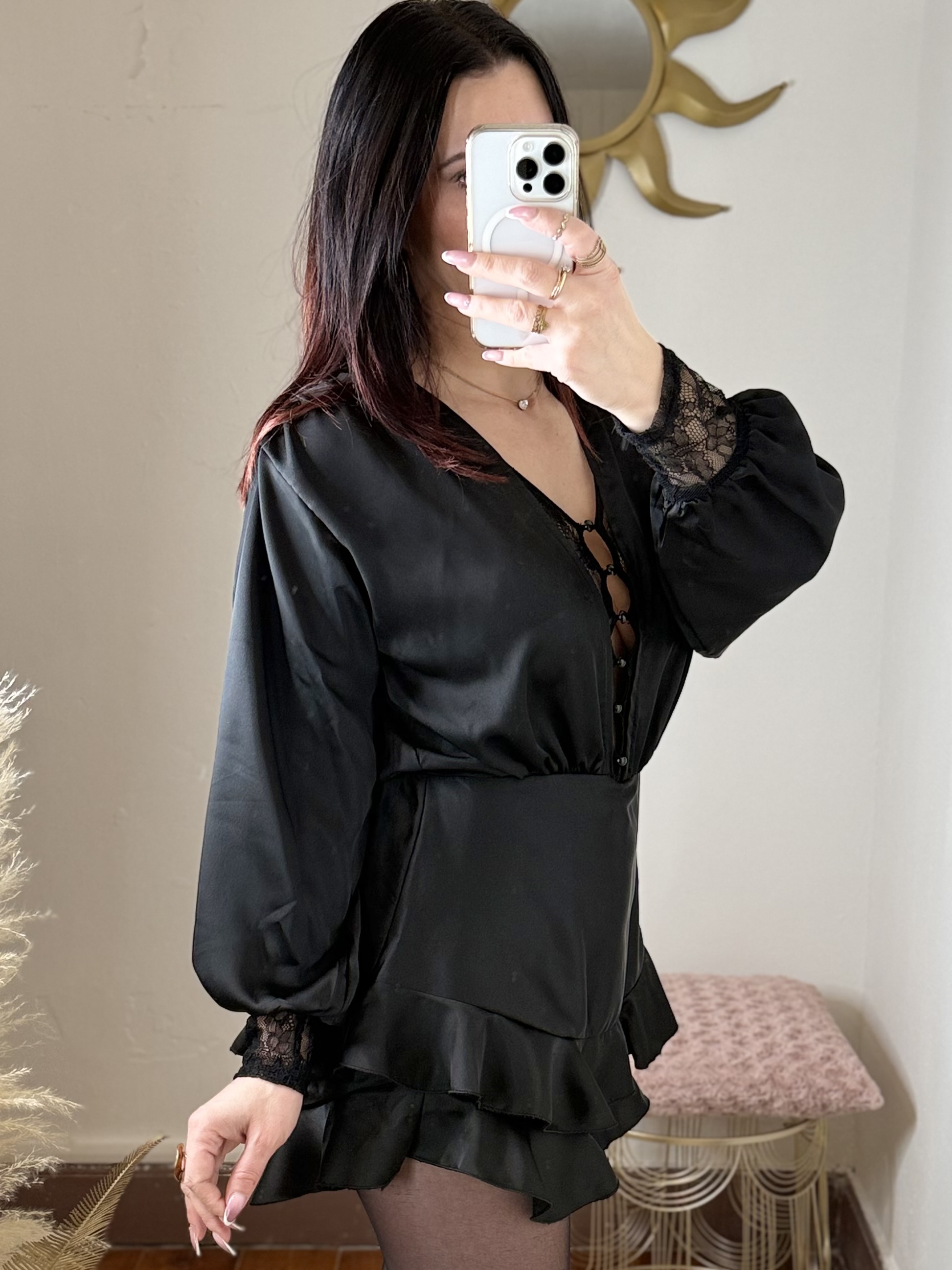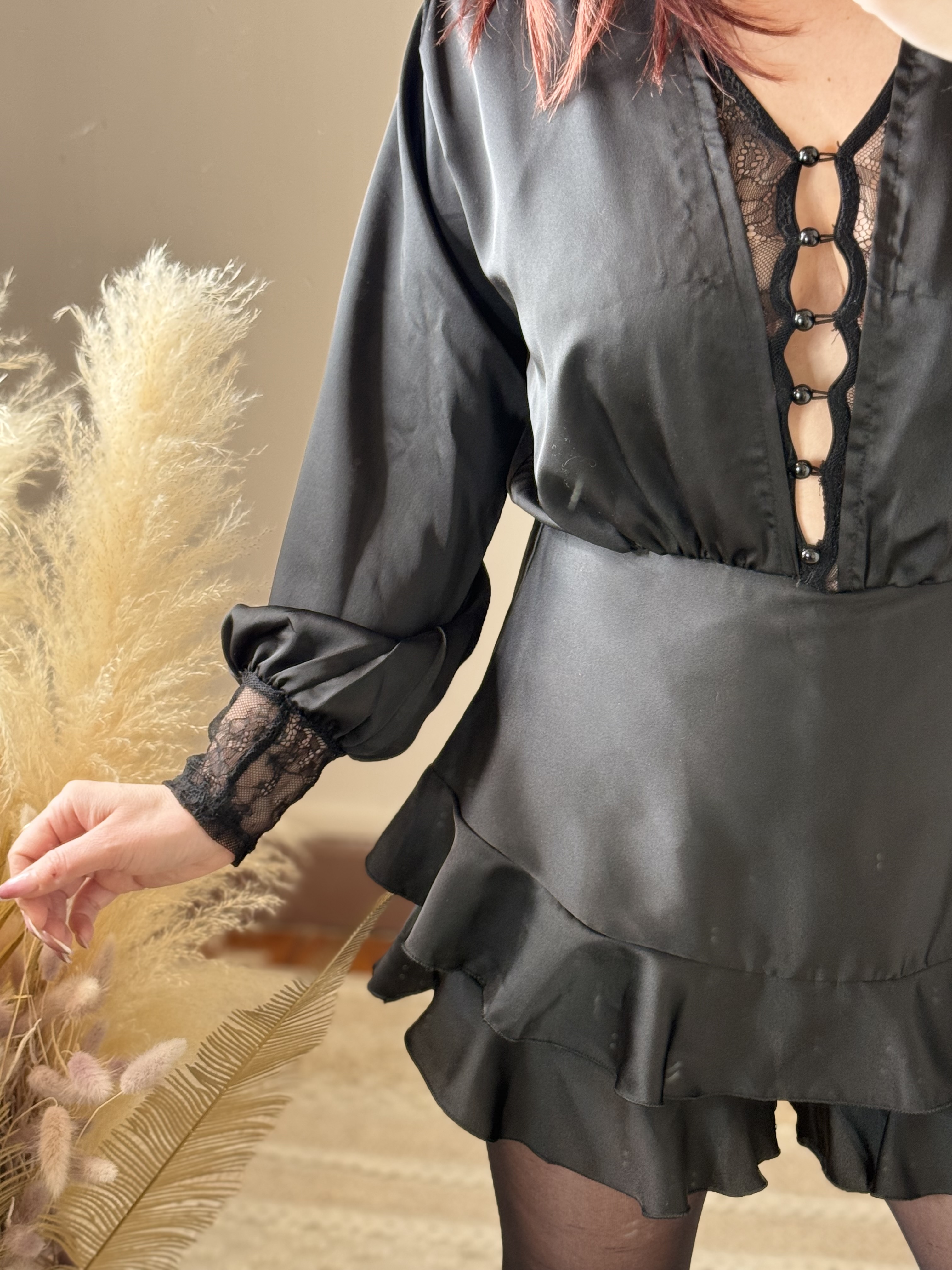 On tombe immédiatement sous le charme de son décolleté travaillé, sublimé par un jeu de liens et d’anneaux sur le devant, qui apporte une touche sensuelle tout en restant raffinée. Les empiècements en dentelle délicate au niveau du décolleté et des poignets ajoutent une note de féminité et de subtilité, parfaitement équilibrée par la fluidité du tissu.