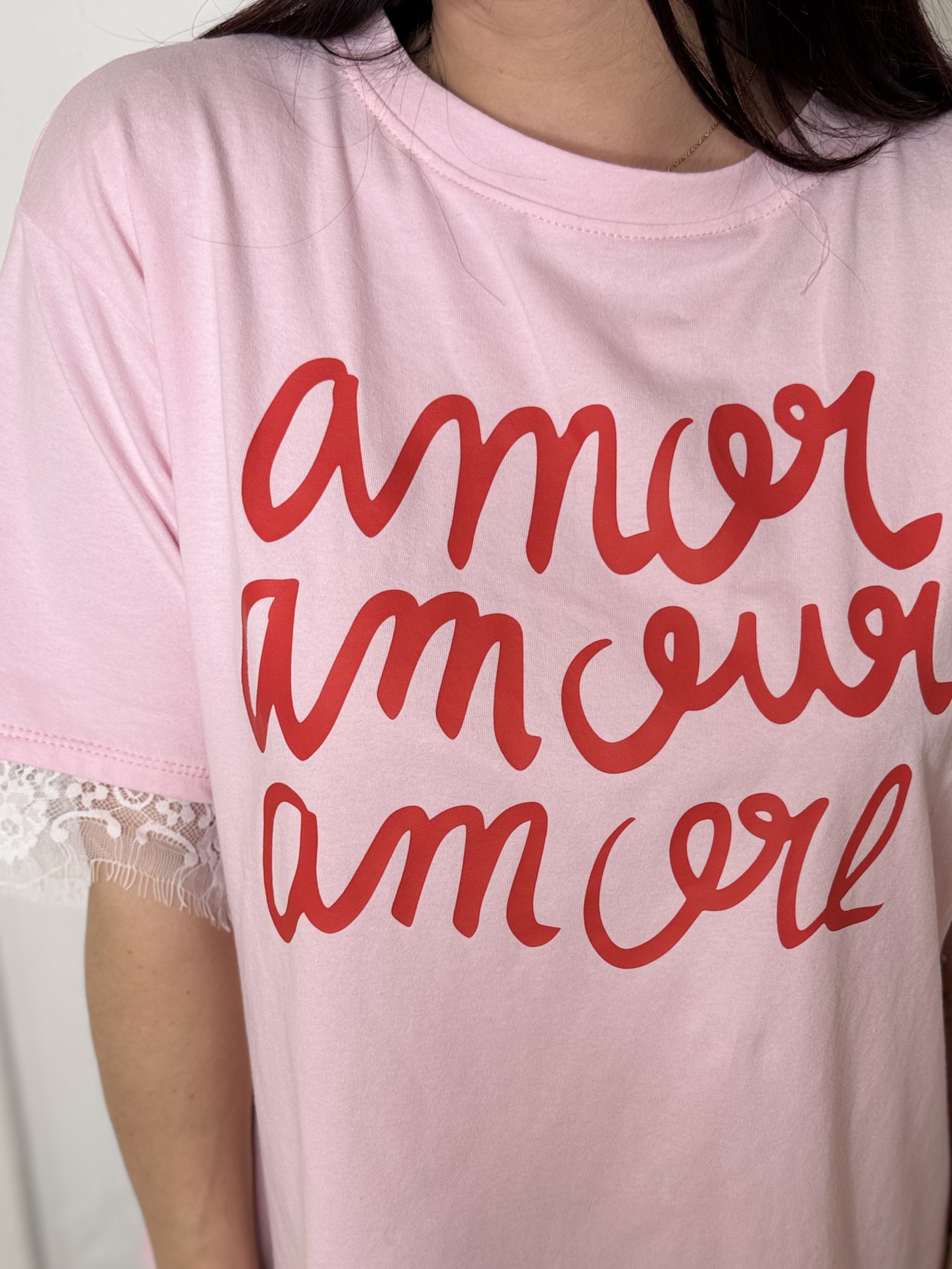 À l’avant, son inscription graphique « Amor Amour Amore » apporte une note romantique et stylée qui attire immédiatement le regard. Mais la véritable surprise se dévoile dans le dos : une ouverture élégante laissant apparaître un empiècement en dentelle, qui apporte une touche délicate et raffinée à ce modèle.