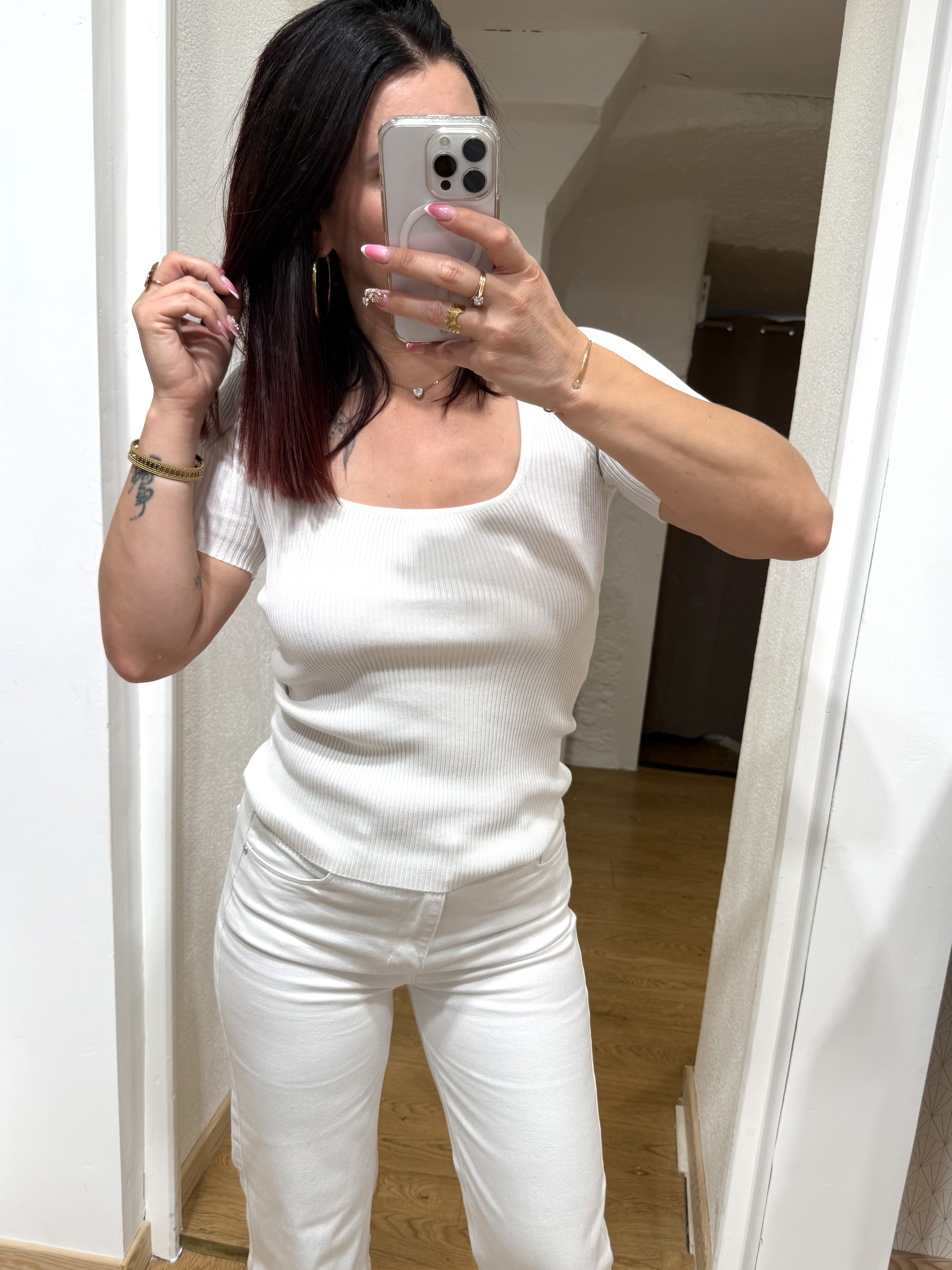 Top côtelé blanc col carré et dos ajouré – Modèle Léna