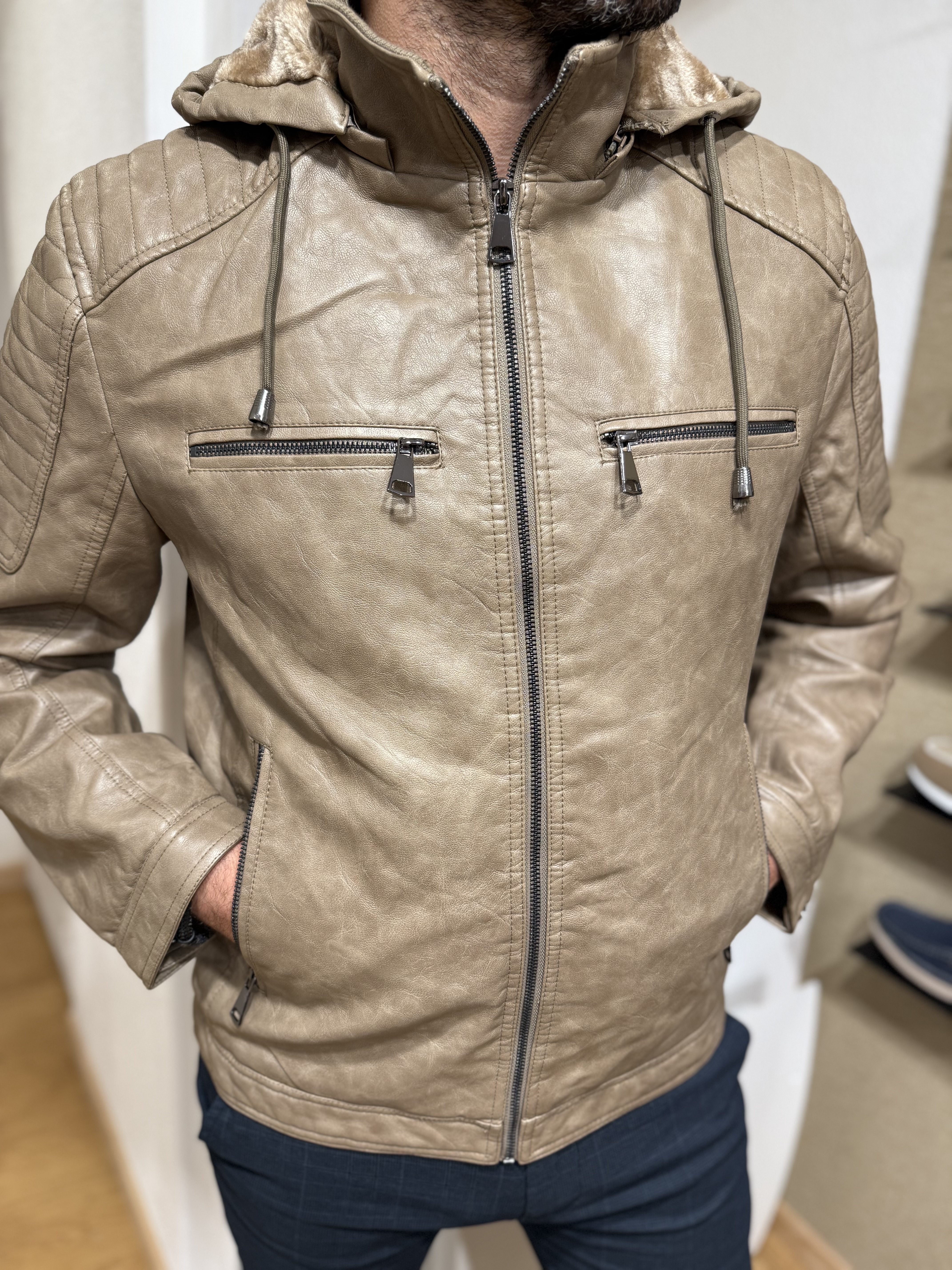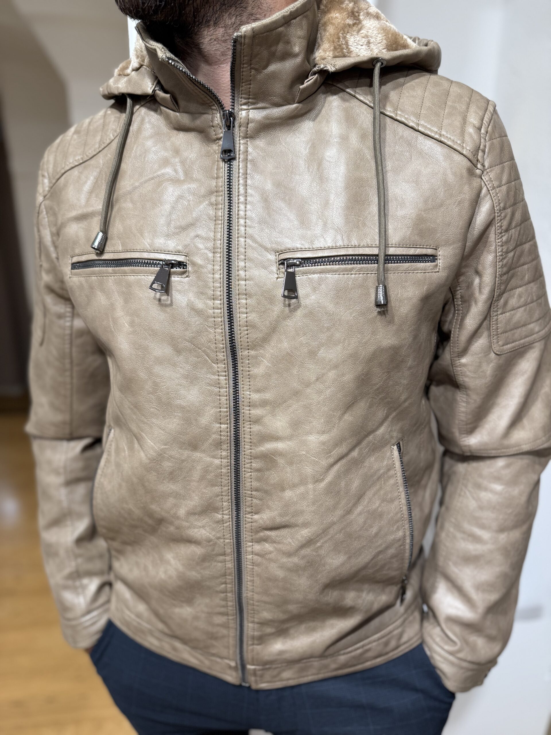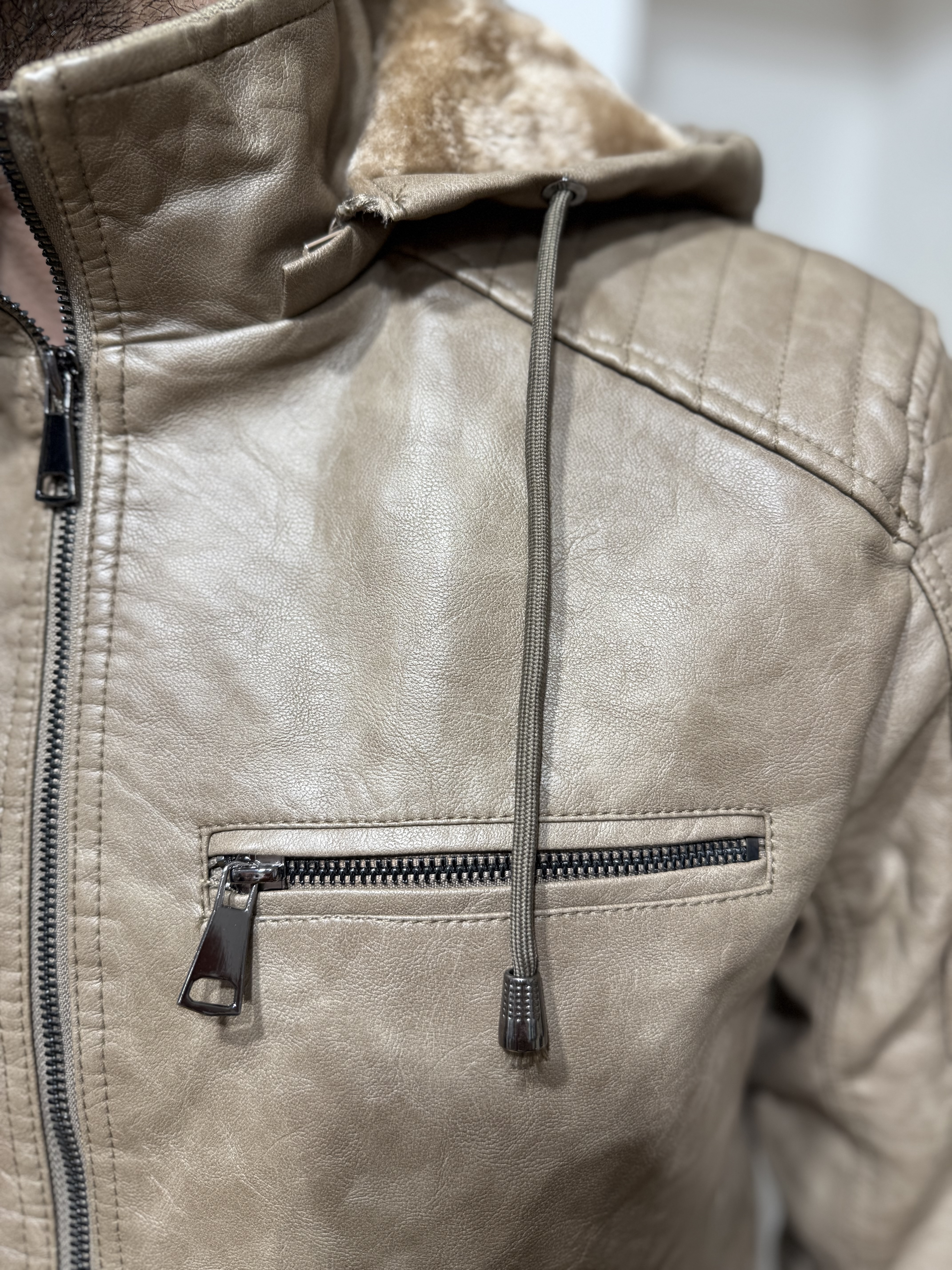 Conçue dans une matière imitation cuir souple et résistante, elle arbore une coupe ajustée qui souligne la carrure, des surpiqûres effet matelassé aux épaules et plusieurs poches zippées à l’avant pour une allure moderne et pratique. Sa capuche doublée en fausse fourrure amovible apporte une touche urbaine et cocooning, idéale pour affronter les journées fraîches avec élégance.