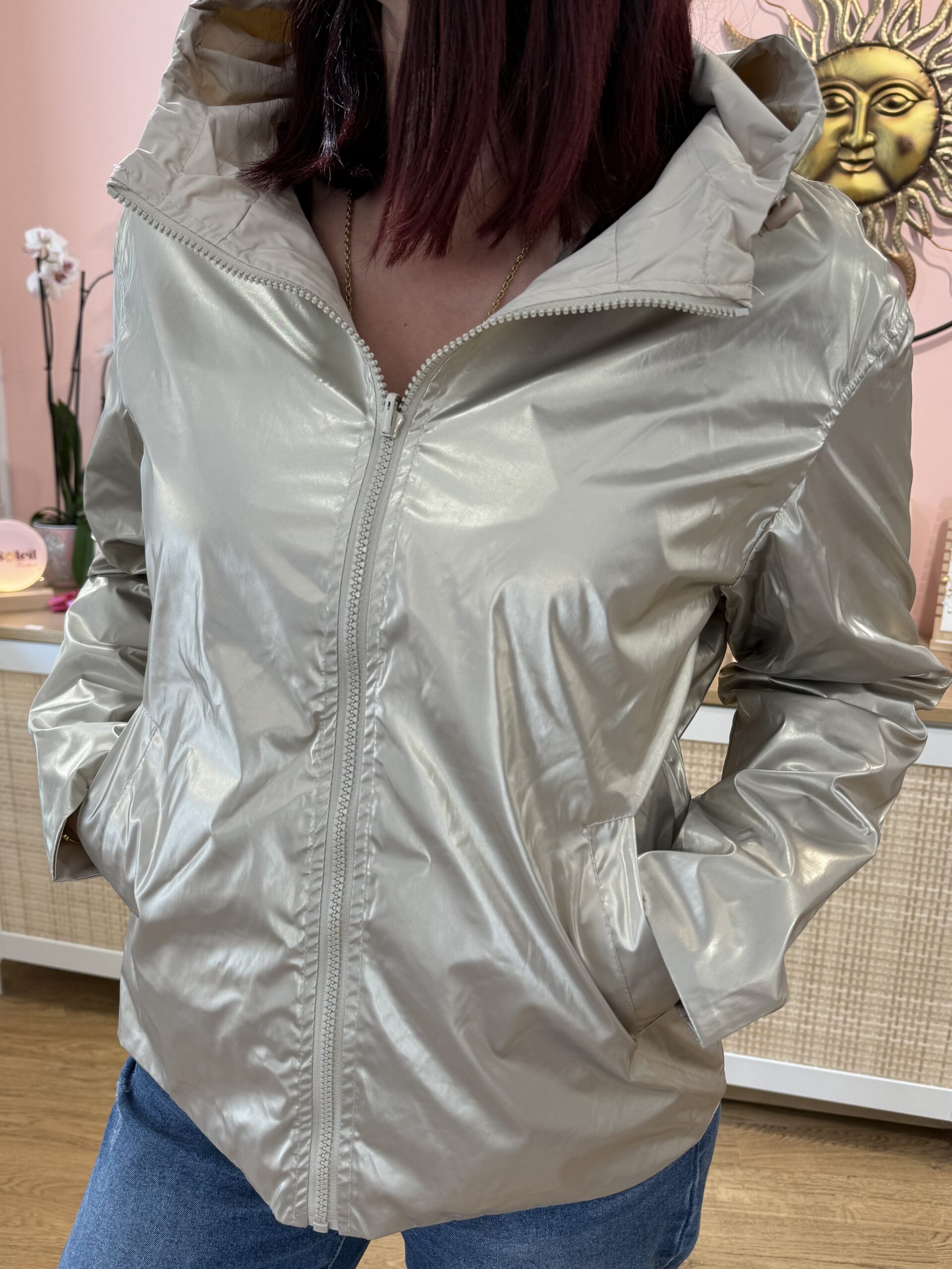 Sa particularité ? Elle est réversible ! D’un côté, un beige irisé lumineux et raffiné, parfait pour illuminer vos tenues. De l’autre, un ton plus soutenu doré et métallisé, au fini moderne et audacieux. Une seule veste, deux styles distincts pour s’adapter à toutes vos envies.