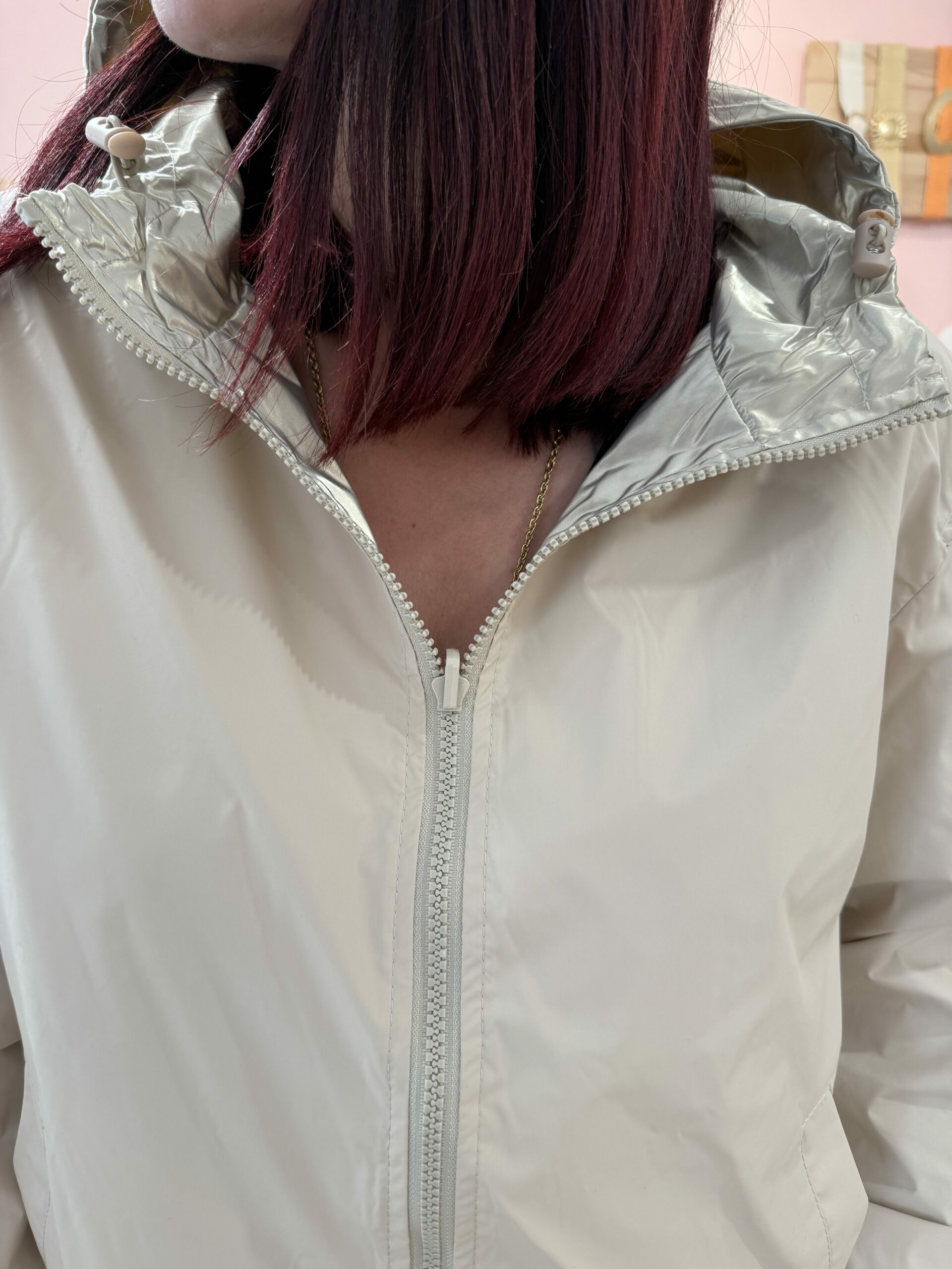 Dotée d’une capuche pratique, de poches latérales et d’une fermeture zippée intégrale, elle assure confort et fonctionnalité sans compromis sur le style. Sa matière déperlante protège de l’humidité légère, tandis que sa fluidité permet de la porter aussi bien sur un jean décontracté qu’au-dessus d’une robe pour une allure chic et citadine.