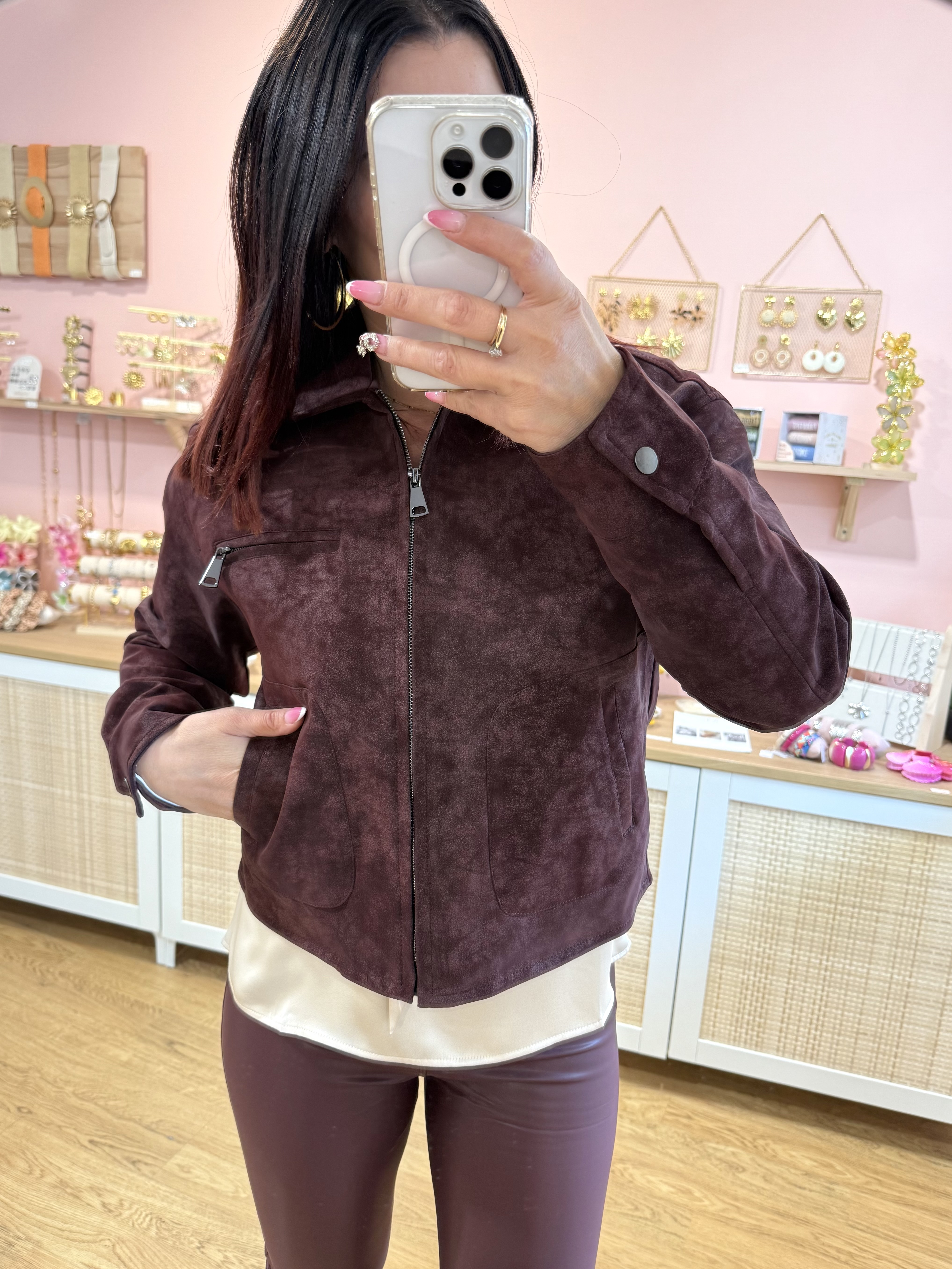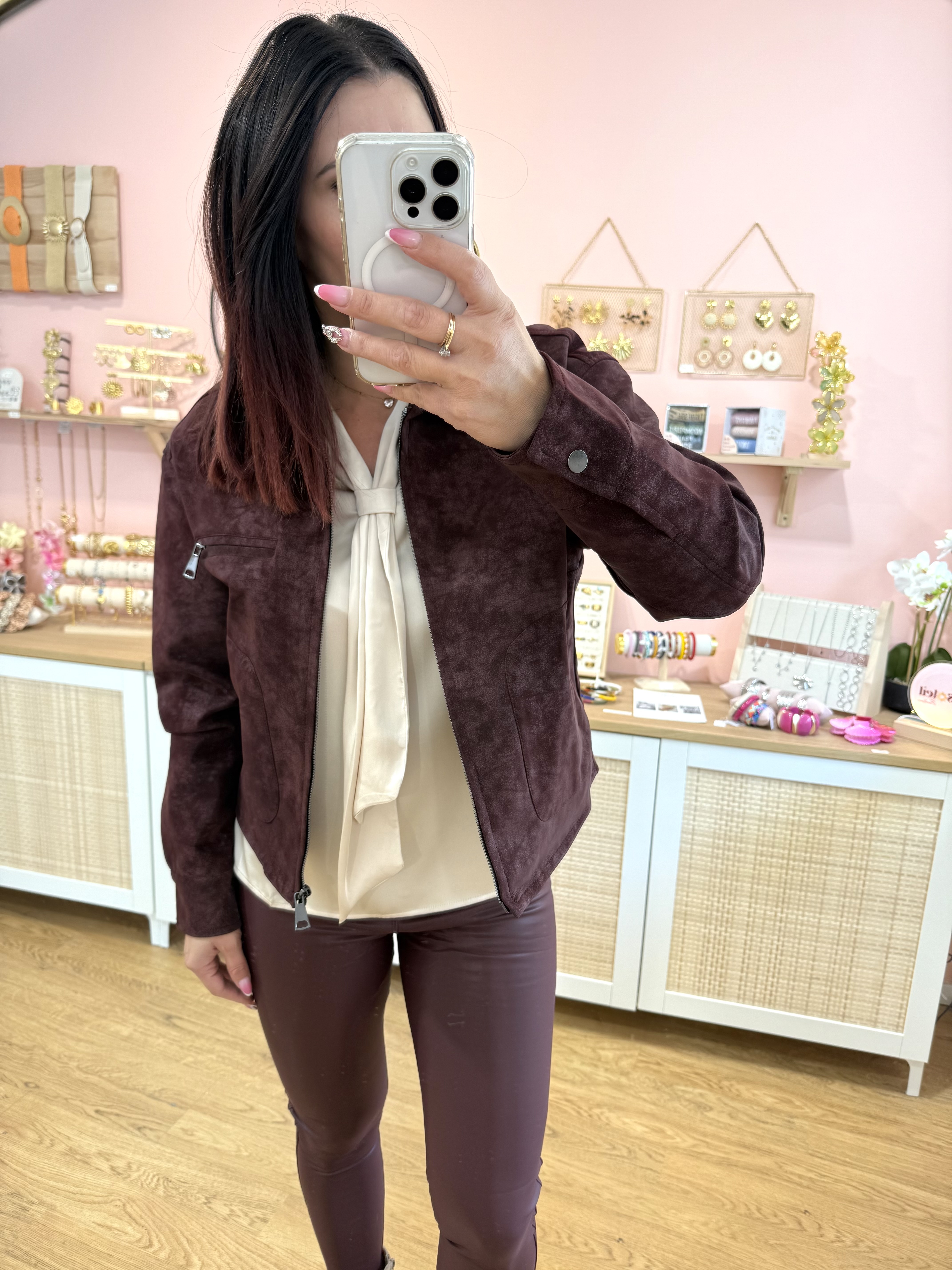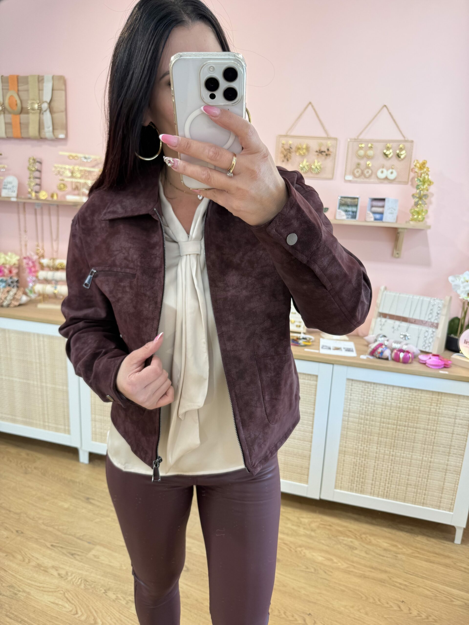La veste Maelis est la pièce idéale pour allier confort et élégance en toute saison. Confectionnée dans une matière effet suédine toute douce, elle séduit par son toucher velouté et son aspect raffiné.